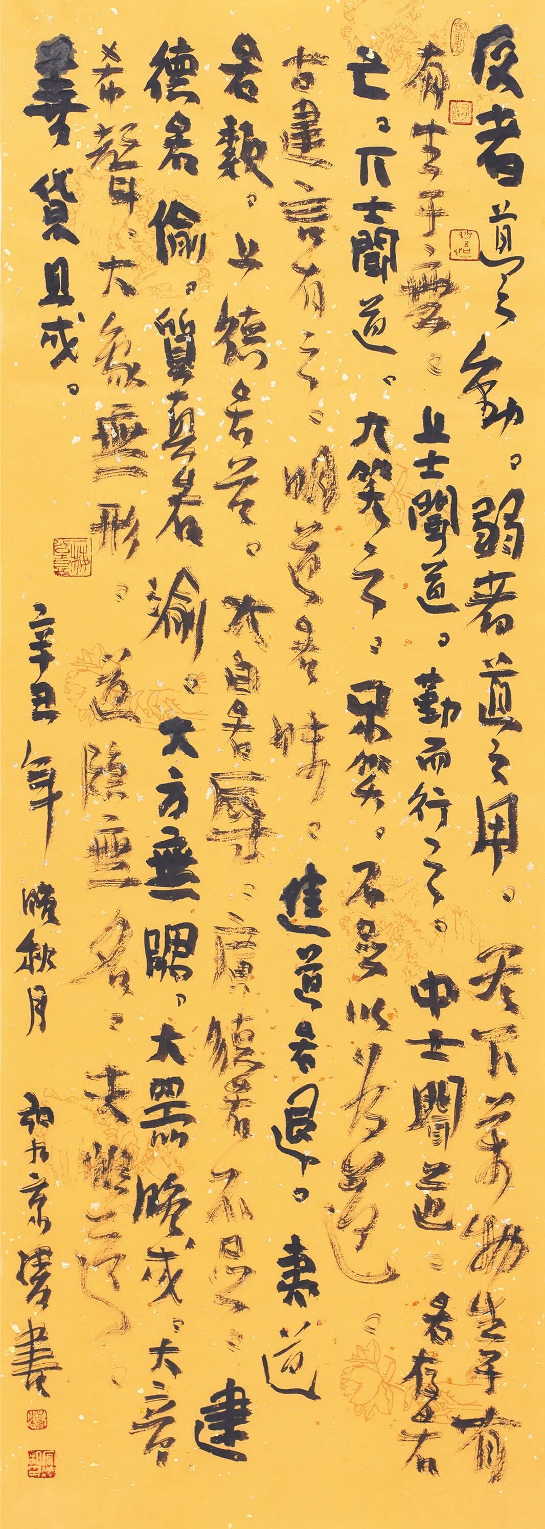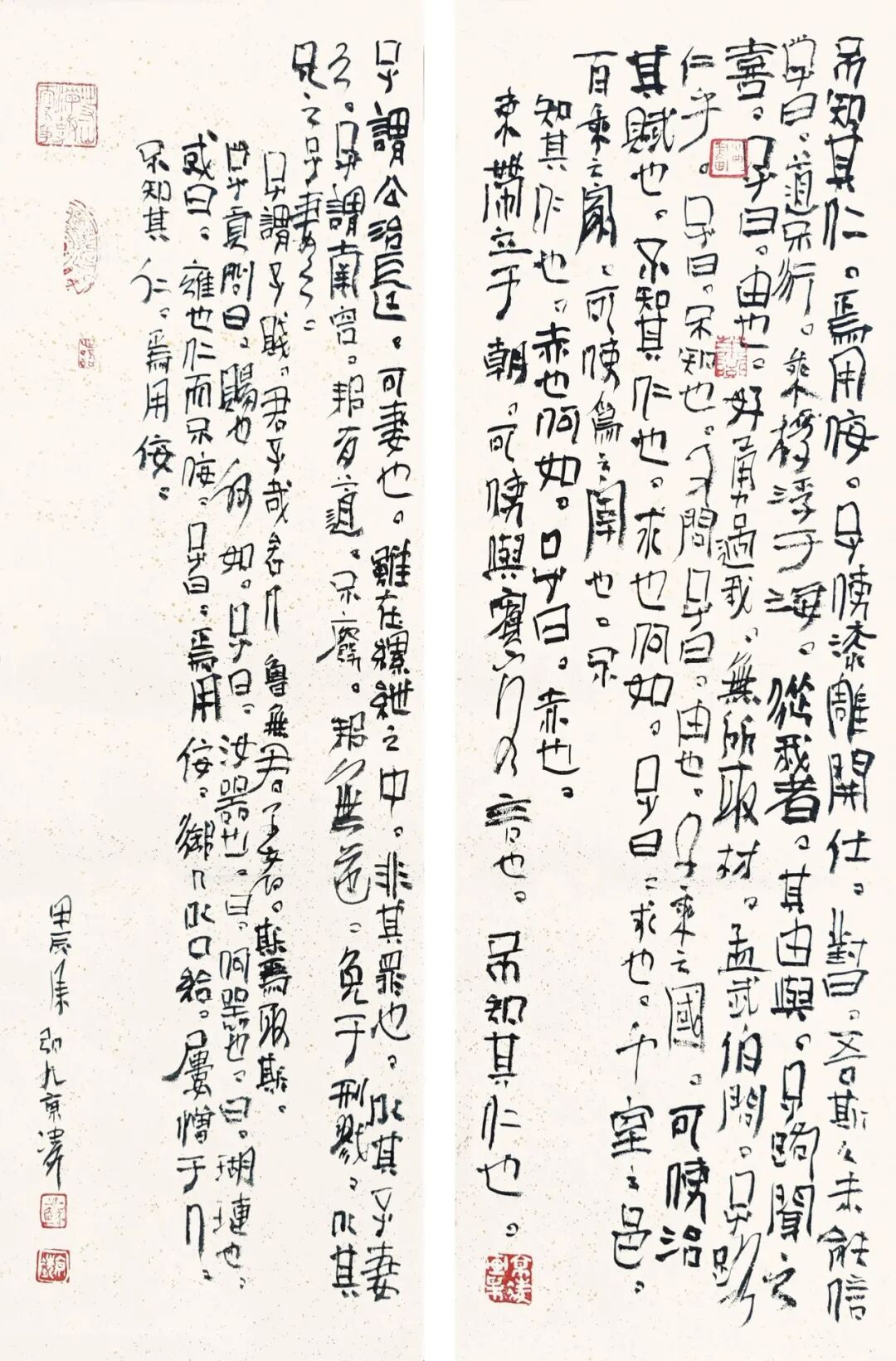 苏京凌的书法作品与众不同!观《录道德经》将洒脱随性的笔墨形态与道家哲学的深邃内核完美融合,生成了独特的书道哲学意境。他的书法历练诸书皆成,碑帖兼优,有取法《石门颂》的开张舒展,有参意《张迁碑》的方劲沉雄,又融入汉帛书的灵动流畅与王铎行草的欹侧纵逸,形成碑帖互参的笔法特征。枯润浓淡,欹正相生,落笔如金刚铁杵力透纸背,收笔似行云流水意趣无穷。道生一,一生二,二生三,三生万物,字形大小错落,行距疏密有致,笔断意连,宽博雍容,这是最完美的道法自然的视觉化诠释,也运行着无为之益的哲学思辨,这种以书载道的创作方式使笔墨皆在有意无意间达成平衡,既可致虚极,又能守静笃,洒脱不拘又内含秩序,这就是最高境界的书法大美!