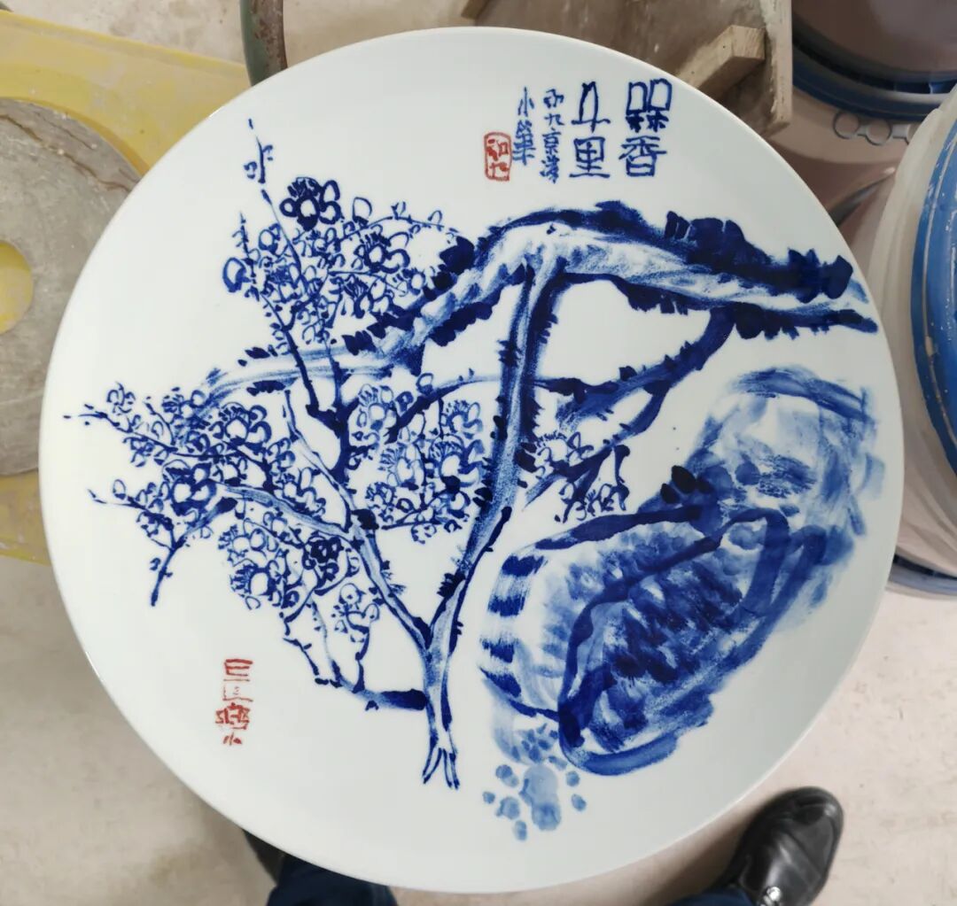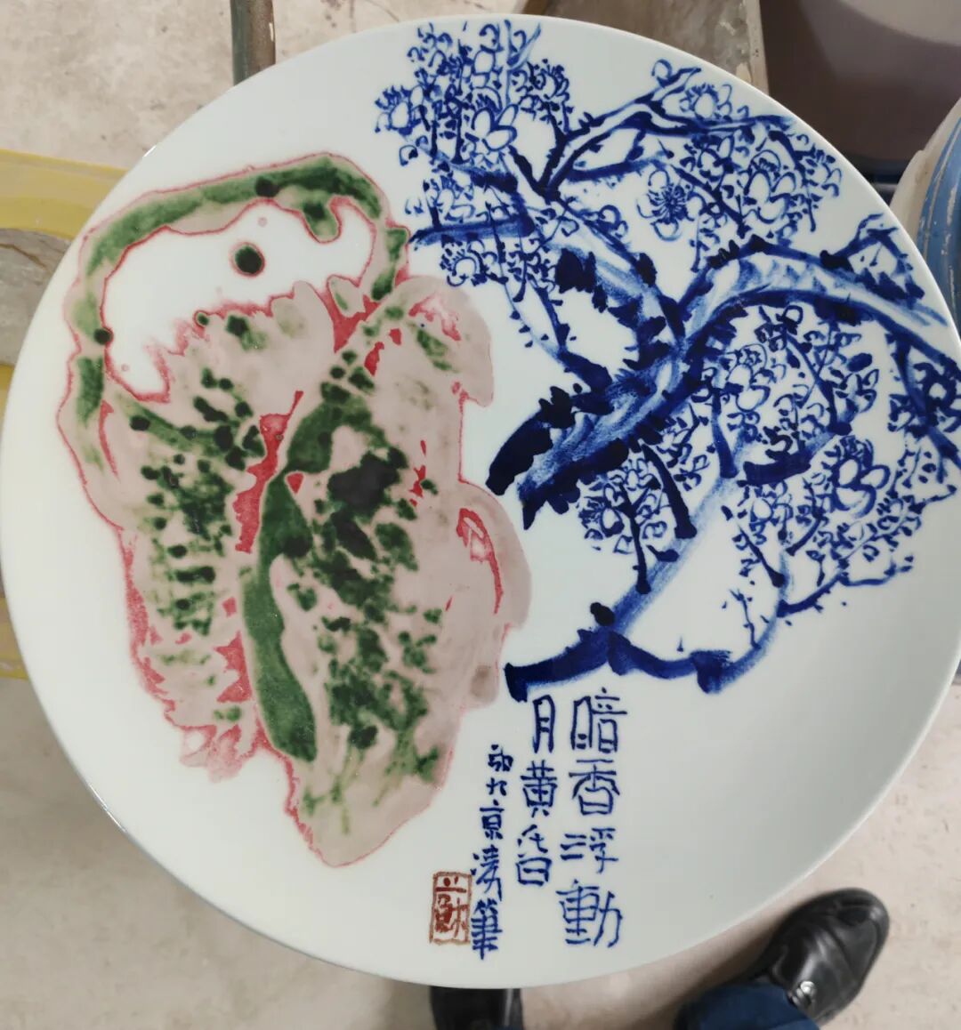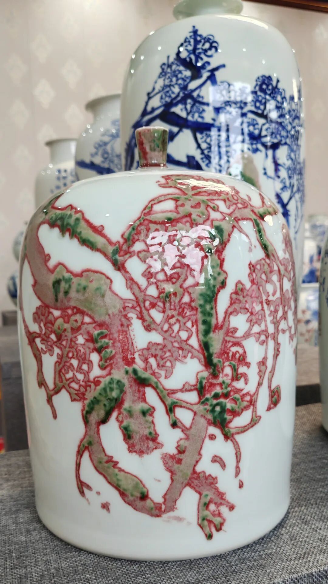 铁骨墨梅含新月,青叶红蕊绘国瓷。苏京凌先生的朱砂梅花、写意蟹、菊花、葫芦等新文人画作品,同以鲜活的笔墨生命力续写传统文人画的生趣范式,展现出雅俗共赏的艺术魅力。朱砂梅花系列中朱砂浓淡相宜,花瓣如燃烛映雪,既保留了梅花凌寒独自开的傲骨,又增添了几分暖自画中来的生机,朱红点染含春,生机勃勃生傲骨”,正是对传统“墨梅”题材的色彩创新。特别是苏京凌先生以文人书画的深厚功底赋能国瓷,将笔下碑帖互参的书法筋骨、写意花鸟的精神气韵尽皆熔铸于瓷面,让国瓷的温润肌理与笔墨的苍劲灵秀相融相生,这不仅是全面拓展了国瓷的表达新境,更是树起了当代文人国瓷审美的新标杆!国礼大器名扬八方,创新价值震古烁今!