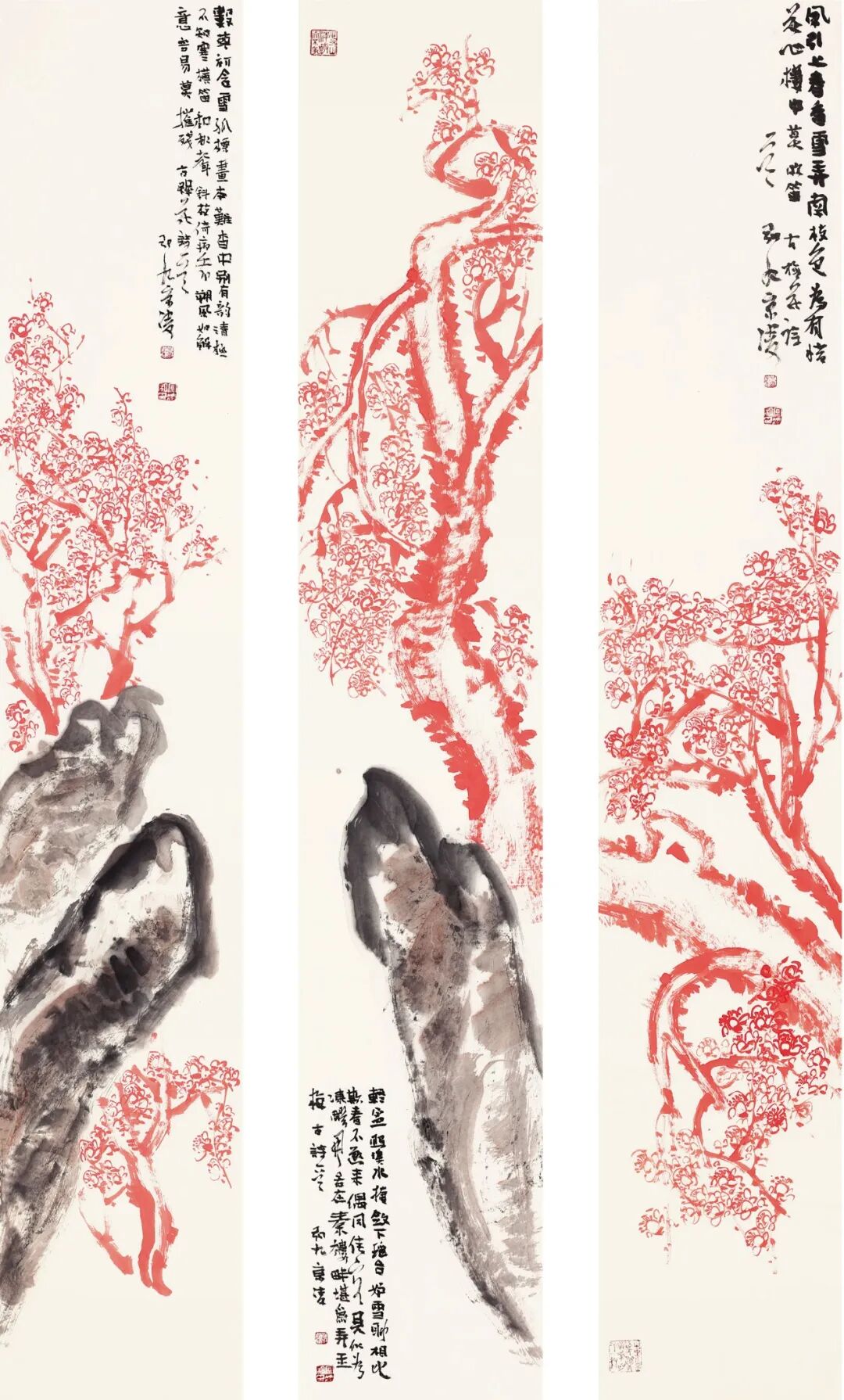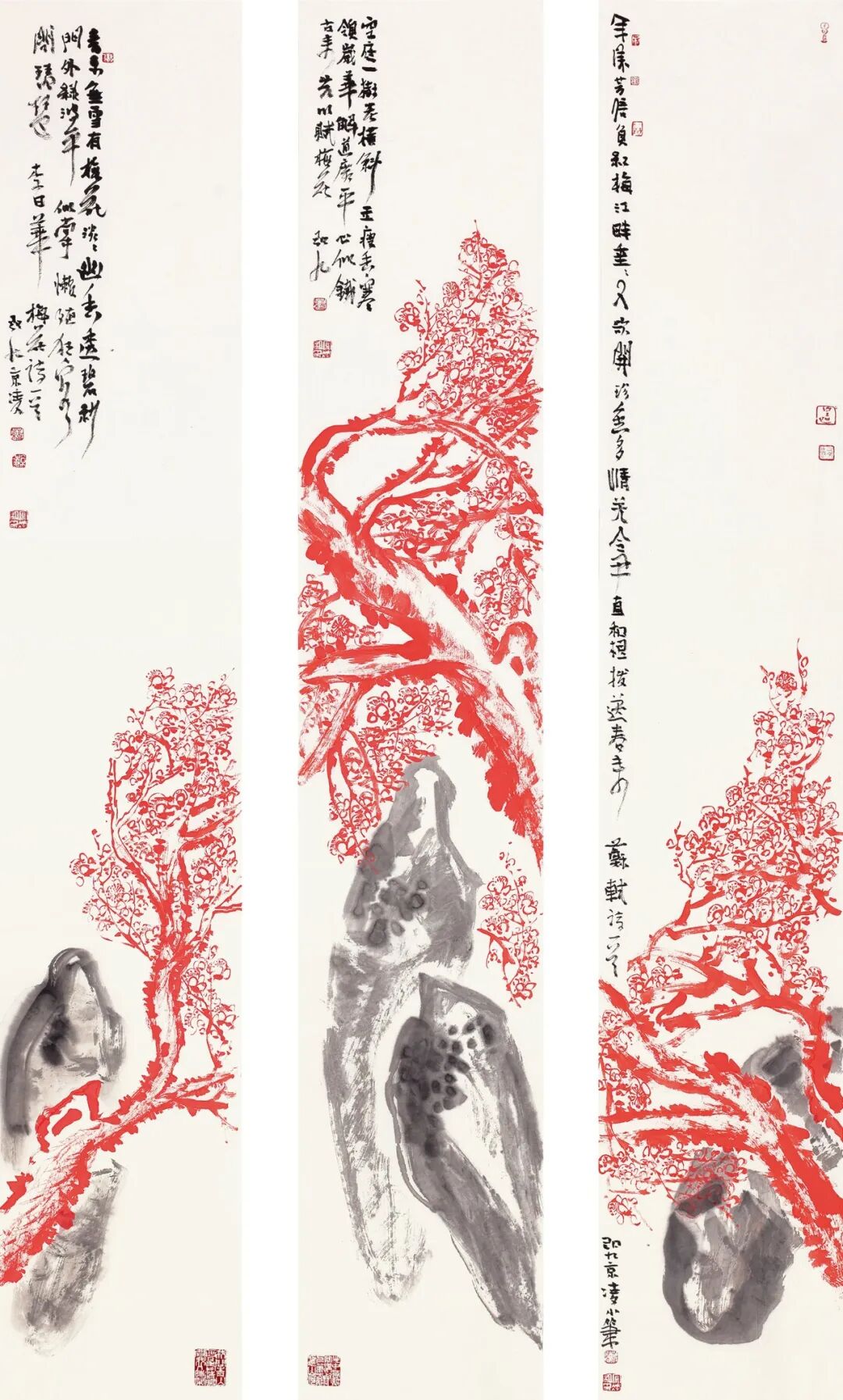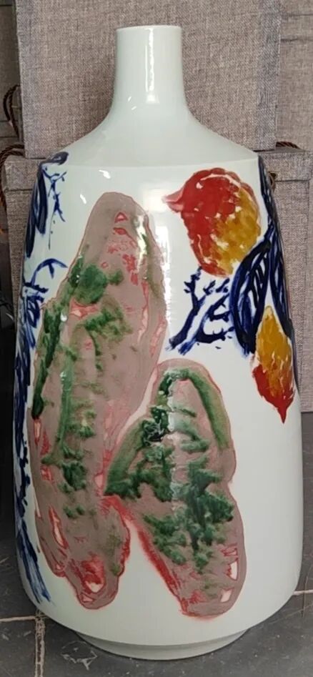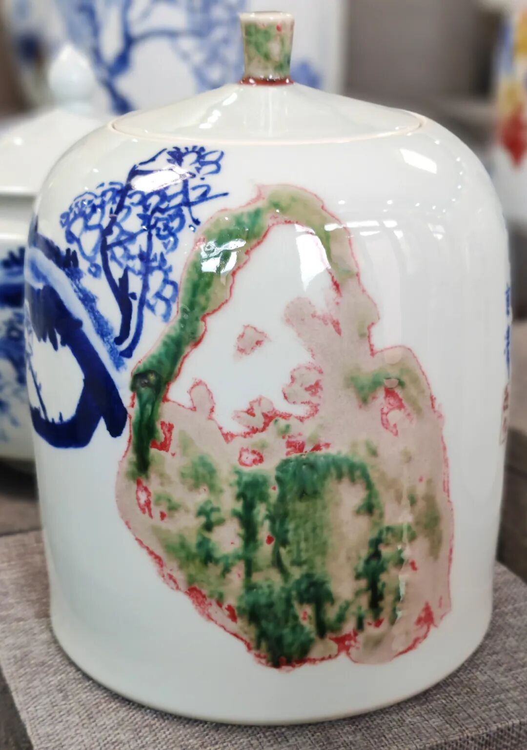 铁骨墨梅含新月,青叶红蕊绘国瓷。苏京凌先生的朱砂梅花、写意蟹、菊花、葫芦等新文人画作品,同以鲜活的笔墨生命力续写传统文人画的生趣范式,展现出雅俗共赏的艺术魅力。朱砂梅花系列中朱砂浓淡相宜,花瓣如燃烛映雪,既保留了梅花凌寒独自开的傲骨,又增添了几分暖自画中来的生机,朱红点染含春,生机勃勃生傲骨”,正是对传统“墨梅”题材的色彩创新。特别是苏京凌先生以文人书画的深厚功底赋能国瓷,将笔下碑帖互参的书法筋骨、写意花鸟的精神气韵尽皆熔铸于瓷面,让国瓷的温润肌理与笔墨的苍劲灵秀相融相生,这不仅是全面拓展了国瓷的表达新境,更是树起了当代文人国瓷审美的新标杆!国礼大器名扬八方,创新价值震古烁今!