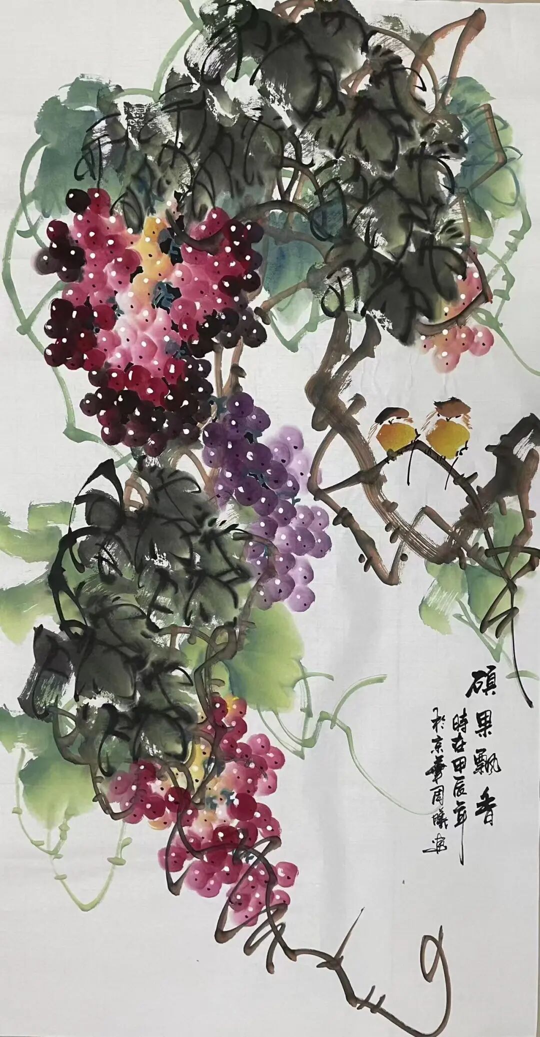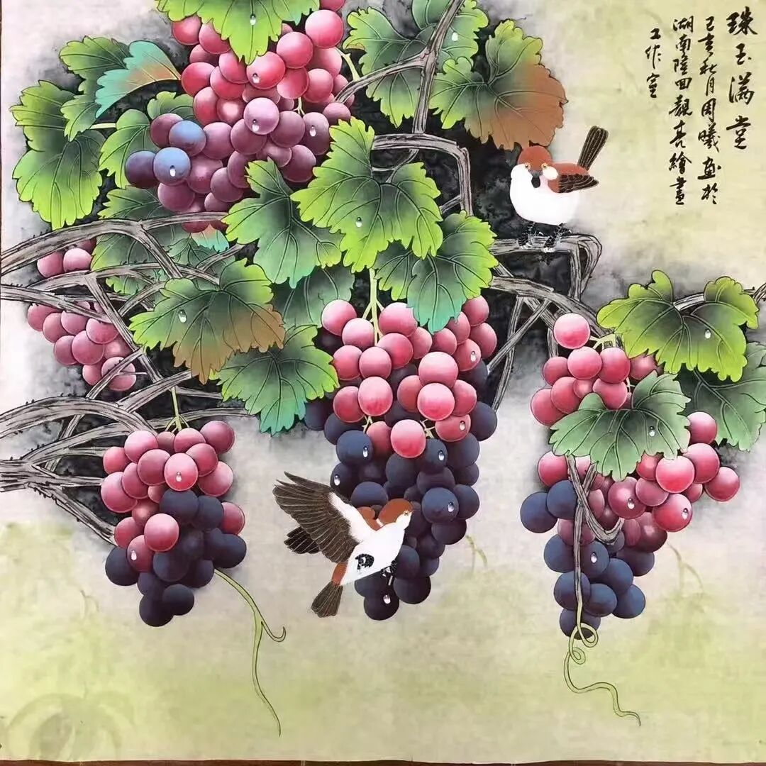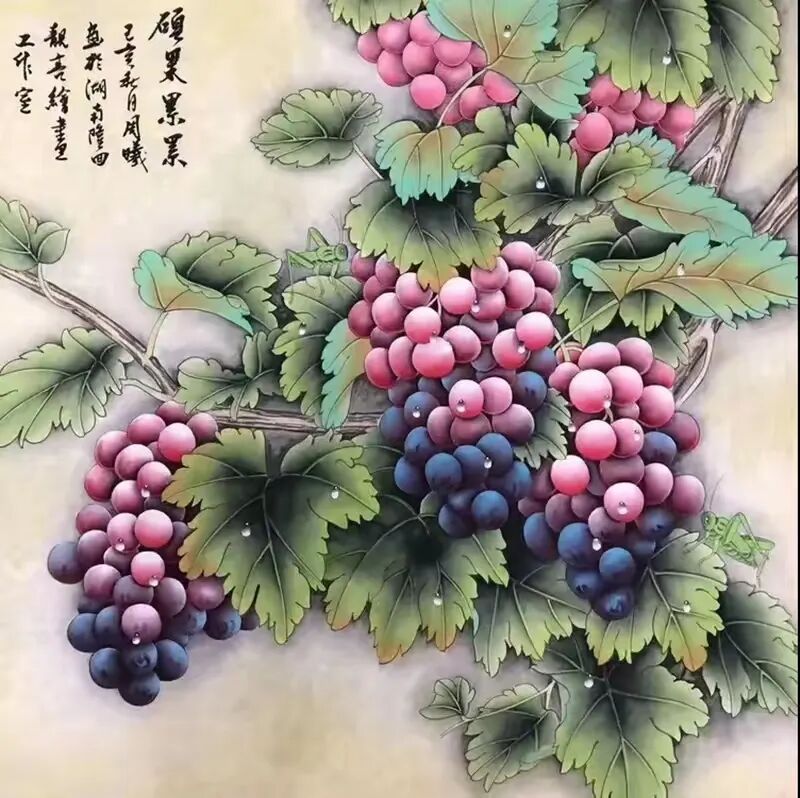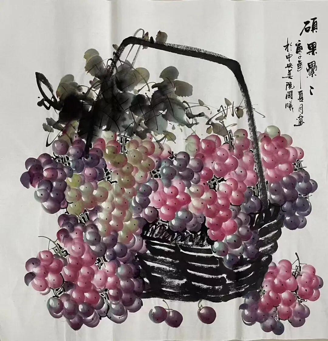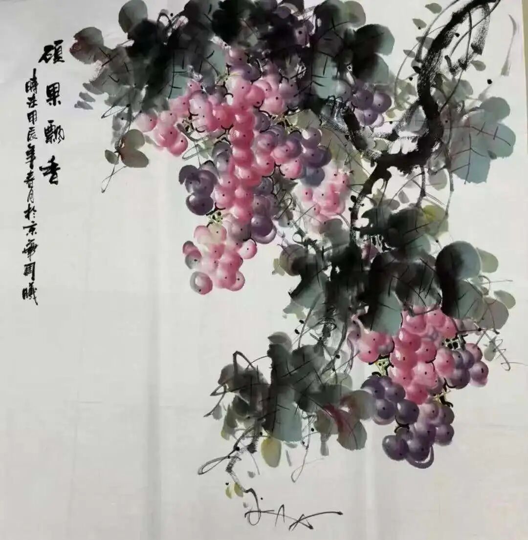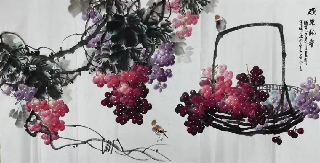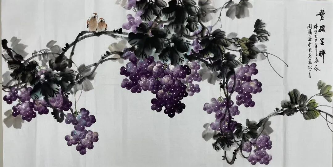 十几载光阴如白驹过隙,周曦先生潜心积淀笔墨功夫,深研文人画意,逐渐涵养出独具一格的绘画面貌。而今挥毫作画,已是信手拈来。有时一幅写意之作,不过寥寥数笔,却构图精巧、意境丰盈,笔虽简而神已足!譬如眼前这几帧葡萄图:水墨酣畅、设色洒脱,既写出藤蔓盘曲之野趣,亦点染出果实晶莹、浓淡相宜之态。观之不禁令人顿觉古人诗句“满架明珠络索斜,露垂瑶萼净无瑕”所言非虚!更有若干花卉题材,亦见其功力深厚,牡丹容姿雍容,艳丽风采美的不可方物。微风拂过,花叶翩跹,见整体簇拥于玲珑奇石之侧,富丽华美之态,恍若杨贵妃再世,秾艳之中自带有清华,真教人一见倾心!