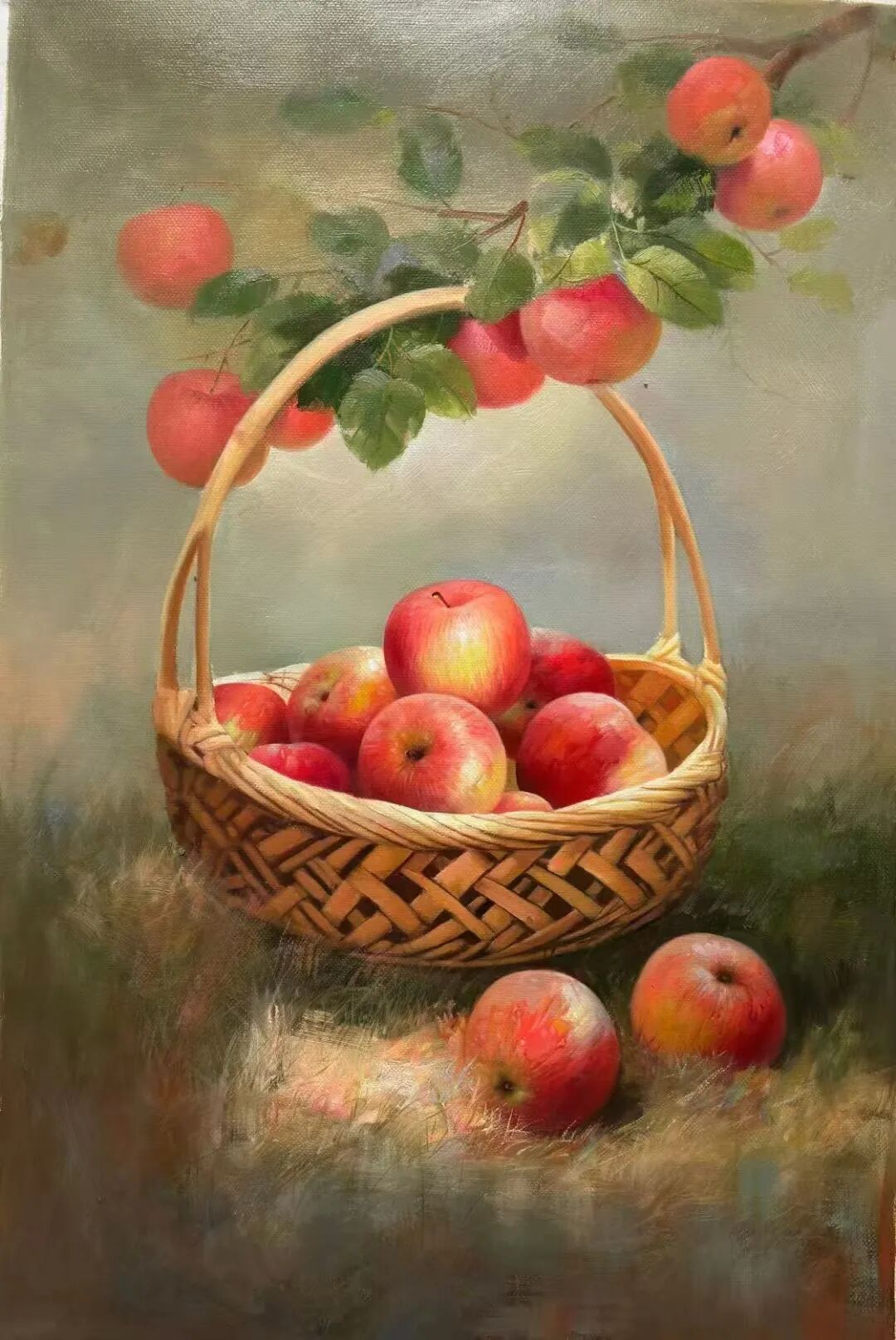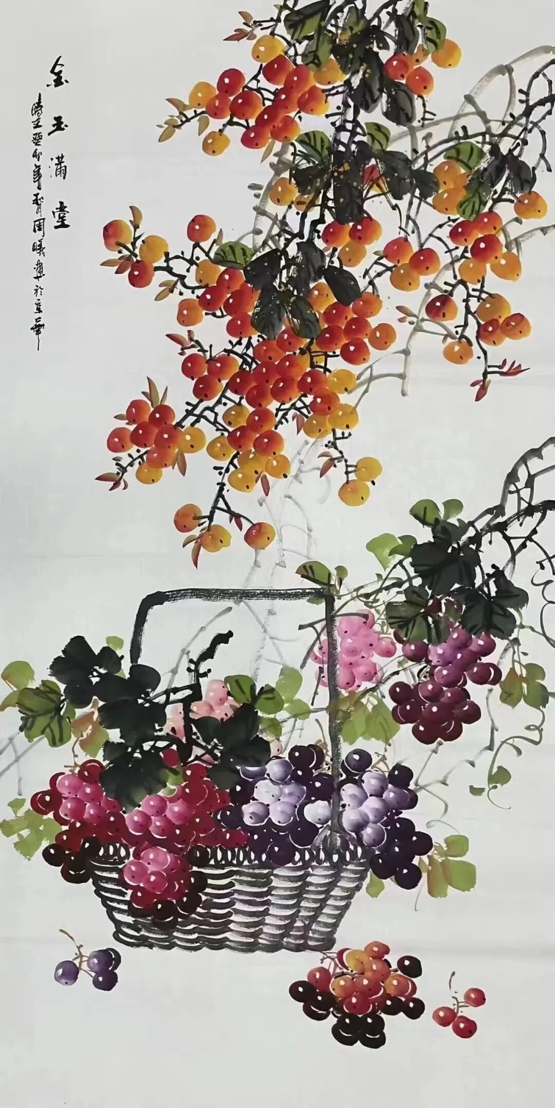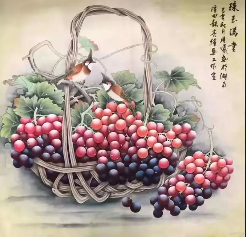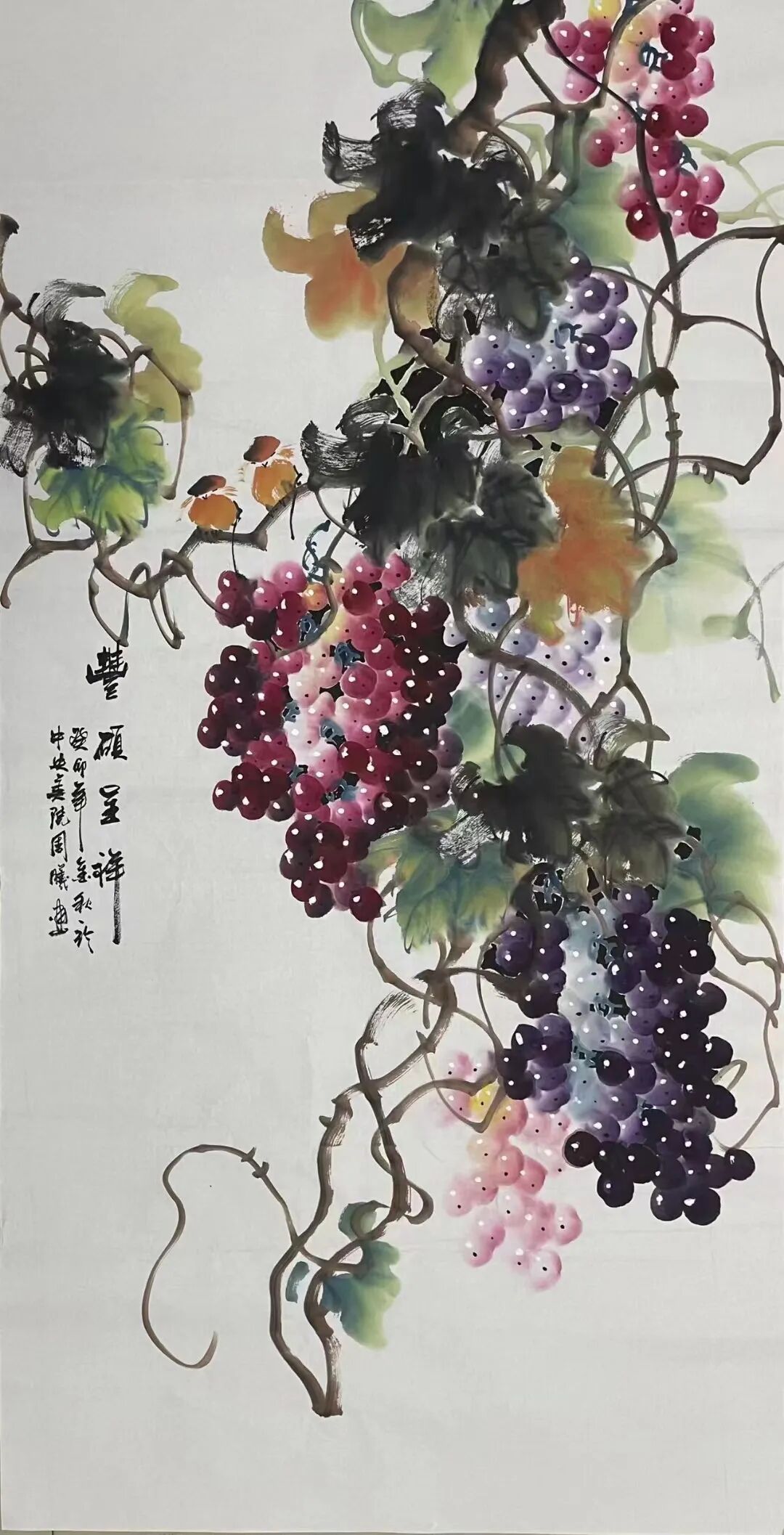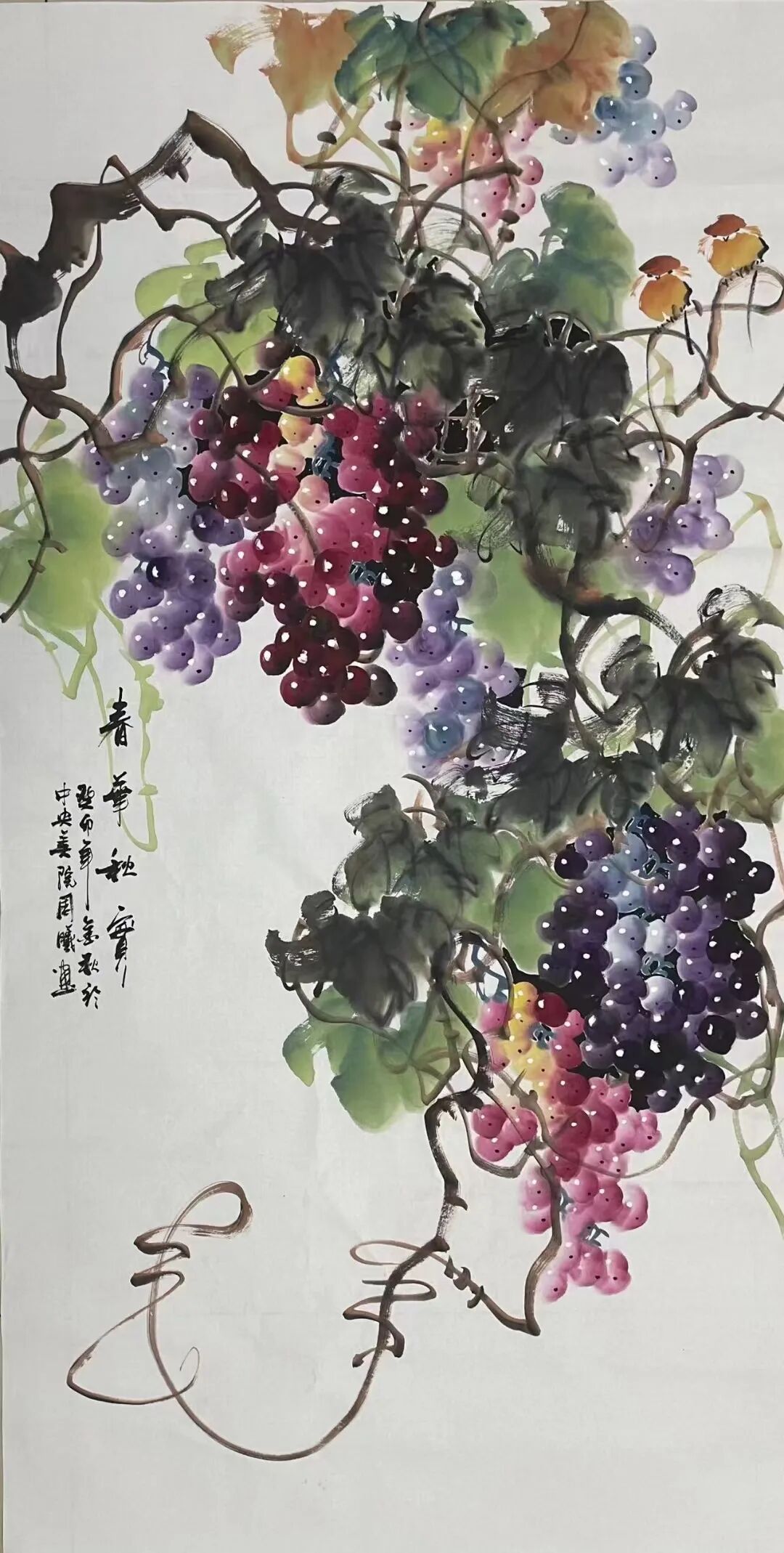 十几载光阴如白驹过隙,周曦先生潜心积淀笔墨功夫,深研文人画意,逐渐涵养出独具一格的绘画面貌。而今挥毫作画,已是信手拈来。有时一幅写意之作,不过寥寥数笔,却构图精巧、意境丰盈,笔虽简而神已足!譬如眼前这几帧葡萄图:水墨酣畅、设色洒脱,既写出藤蔓盘曲之野趣,亦点染出果实晶莹、浓淡相宜之态。观之不禁令人顿觉古人诗句“满架明珠络索斜,露垂瑶萼净无瑕”所言非虚!更有若干花卉题材,亦见其功力深厚,牡丹容姿雍容,艳丽风采美的不可方物。微风拂过,花叶翩跹,见整体簇拥于玲珑奇石之侧,富丽华美之态,恍若杨贵妃再世,秾艳之中自带有清华,真教人一见倾心!