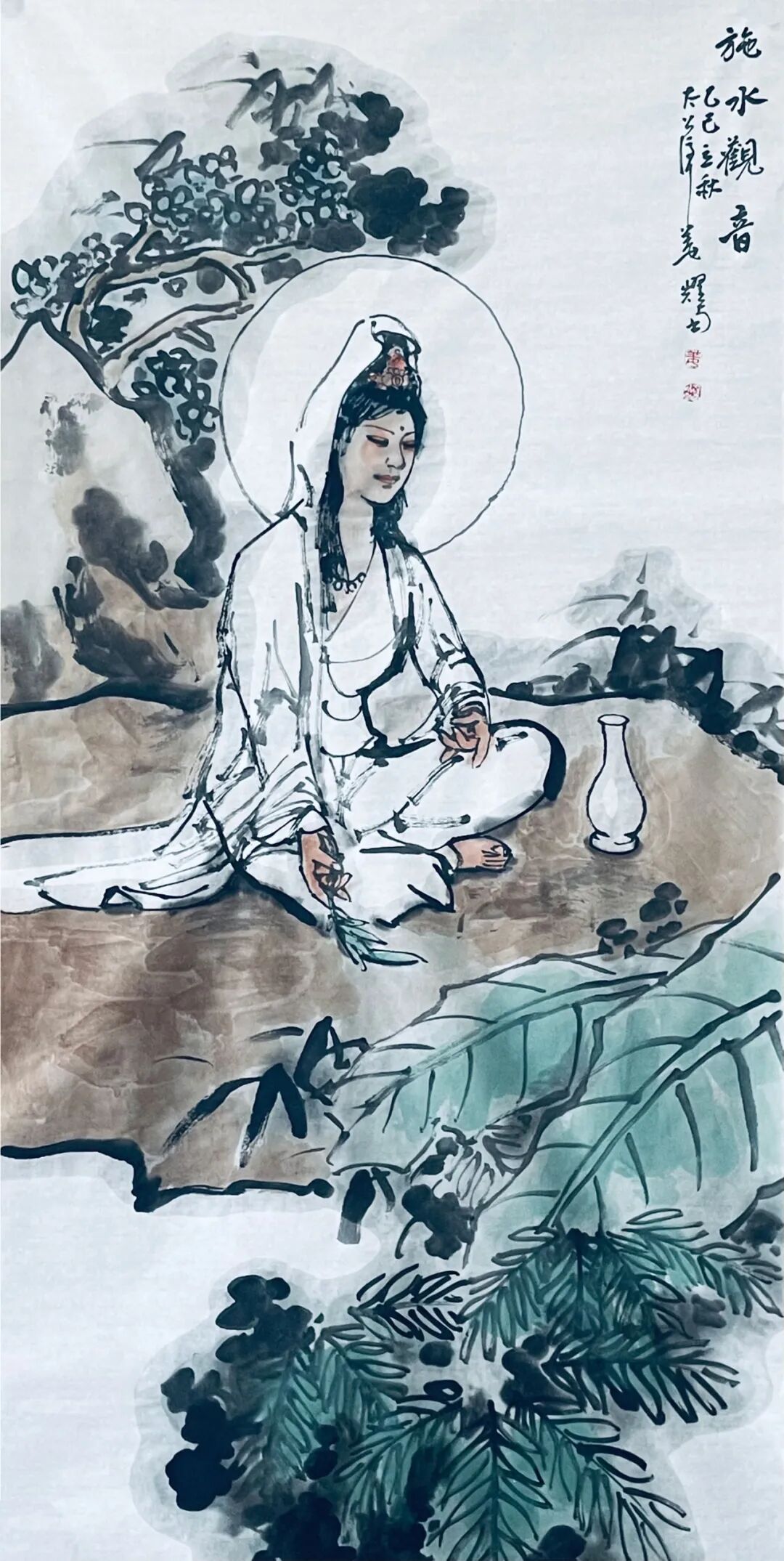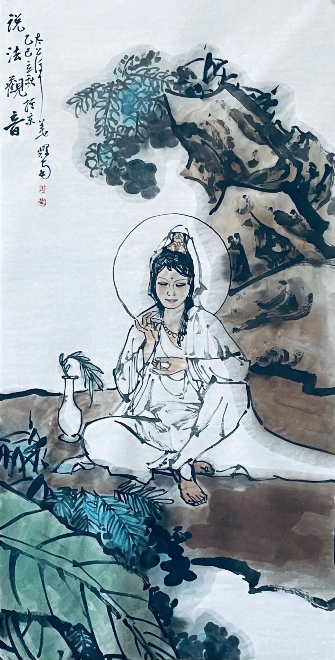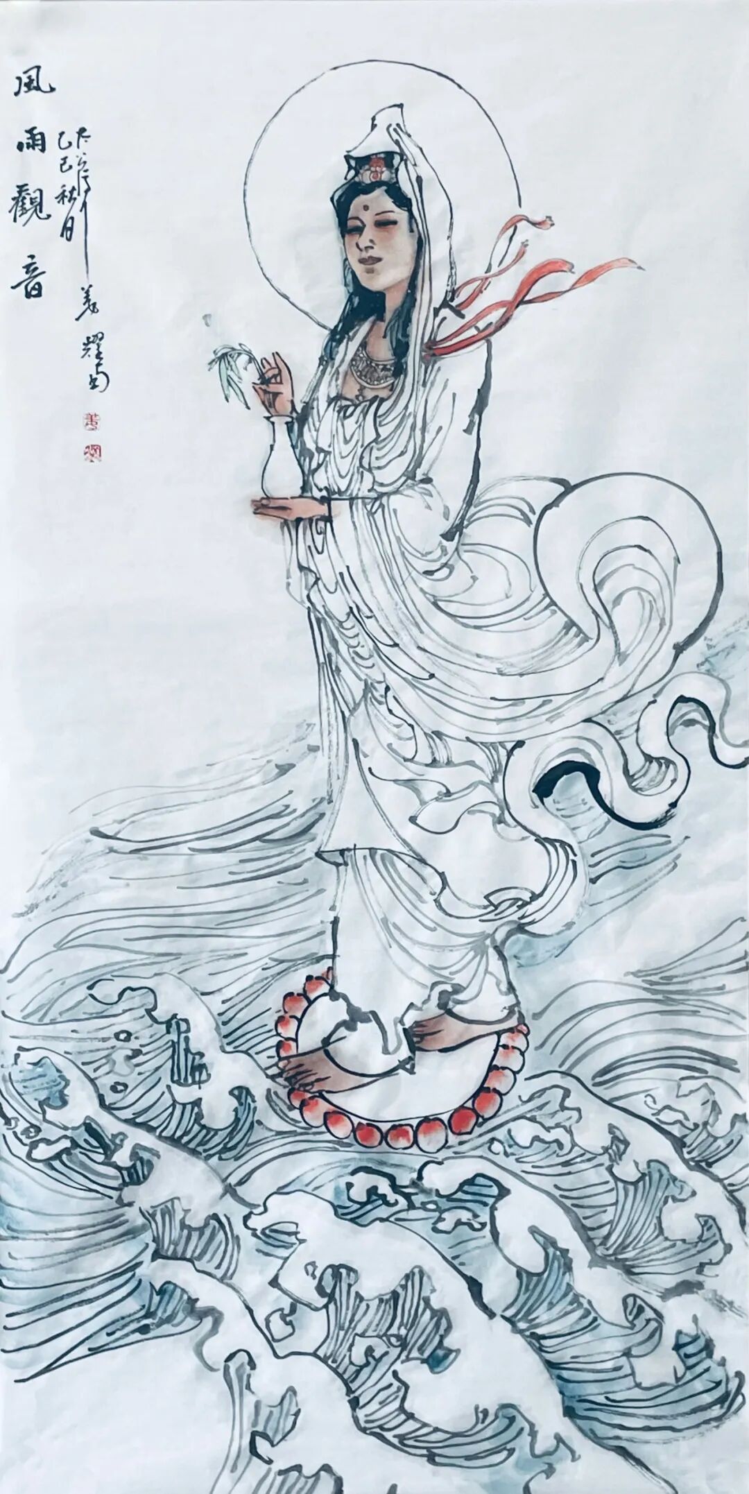 在技法运用上,他将传统工笔重彩与写意笔法结合。《水月观音》以细腻线条勾勒璎珞佩饰,却以泼墨手法晕染背景流云,刚柔相济的笔触既展现了宗教艺术的精工之美,又注入了文人画的写意精神,实现了“以形写神”到“神形共生”的突破。