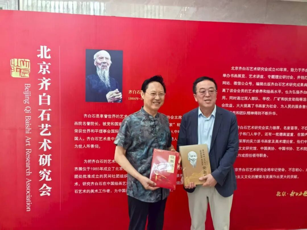 左一张生礼先生向内蒙古自治区文化交流中心孟利平主任赠送《祖国颂》和《人民艺术家齐白石》两套书