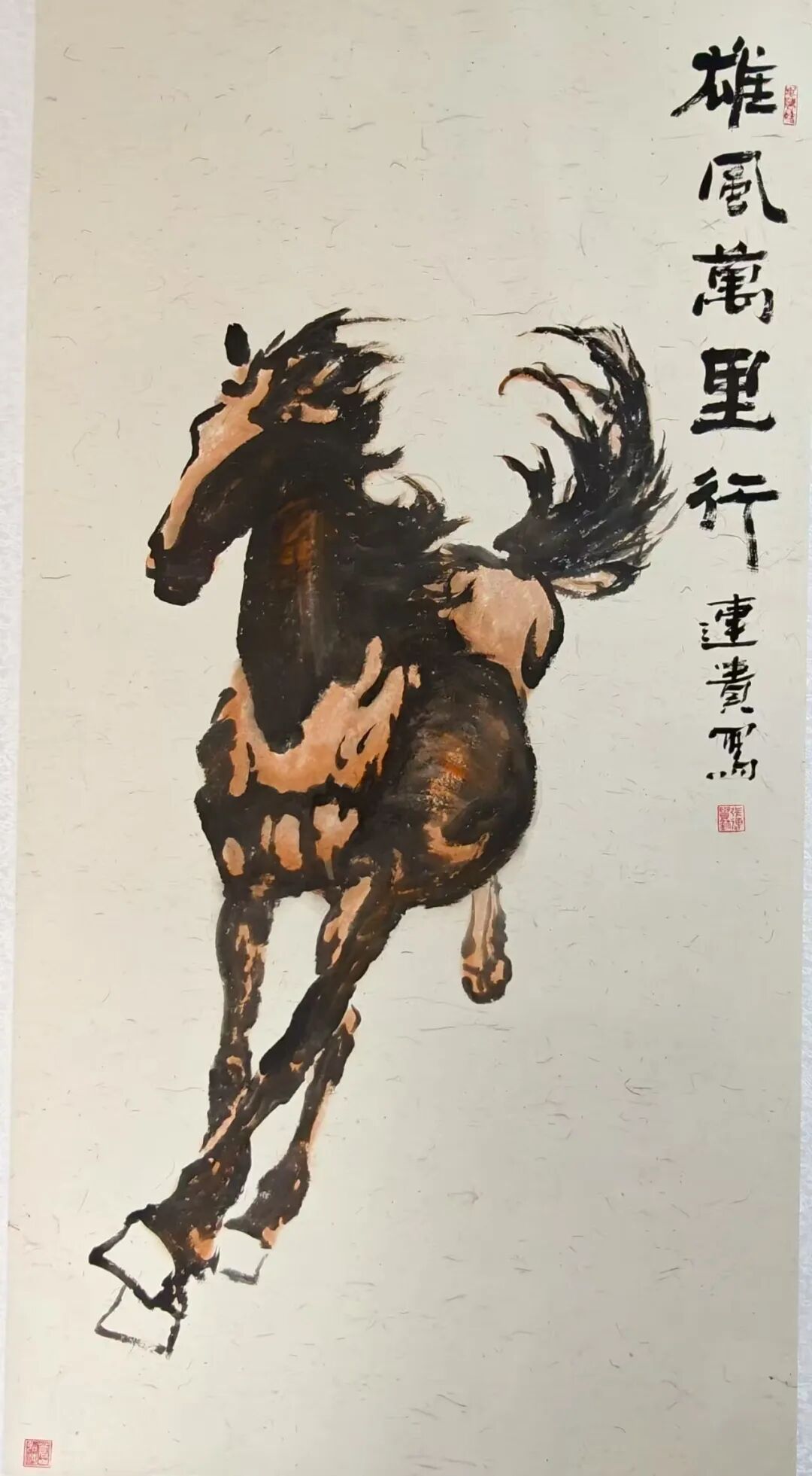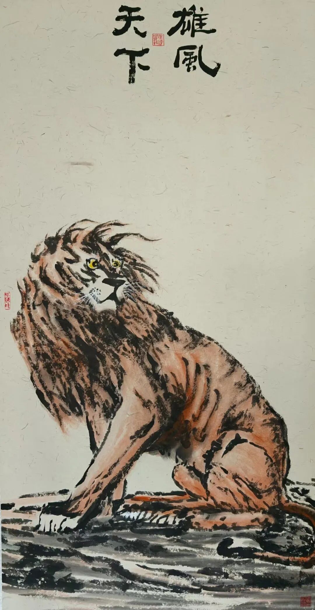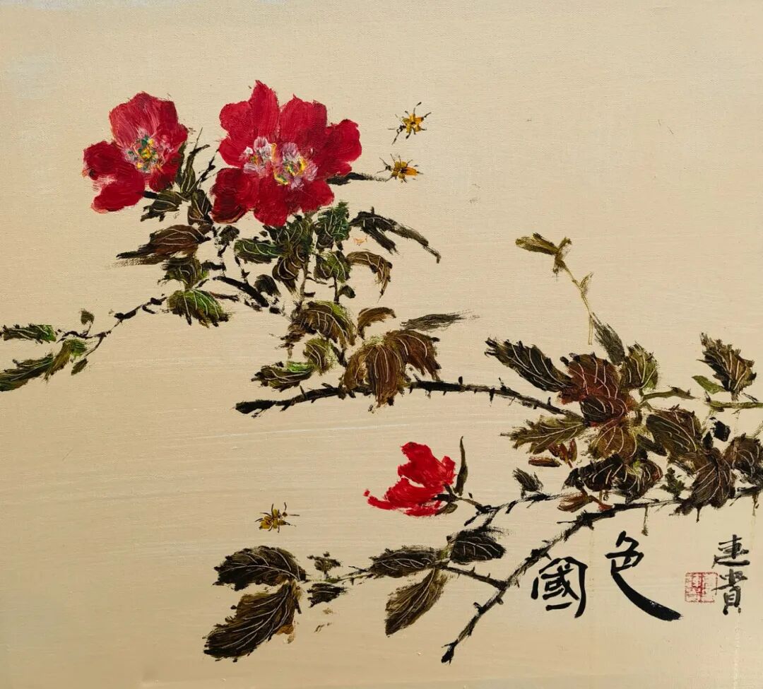 几十年的艺术生涯,不仅锻造了张连贵先生写神取意的丹青功夫,更拓宽了他的写生题材。无论是传统花鸟、山水,还是骏马雄狮,在他笔下皆各有妙造、堪称意趣盎然。单看这幅题为《国色》的花鸟作品,画中细枝横斜,两朵红花正绽芳华,设色浓丽而不失华贵,虽无粗枝老干的野逸之态,却自有一番灵动妙韵。其中更有双蜂萦绕于花间,观之令人心中顿生诗情意趣,实乃细蕊含香蜂竞绕,一枝红艳寄春风!整体技法,可以说是以油画浓郁饱满的色彩去表现中国写意风格,是谓兼具西方绘技的实感与东方韵味的灵动,最终创造出了一种跨界的视觉新意。