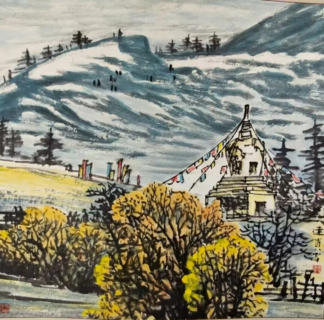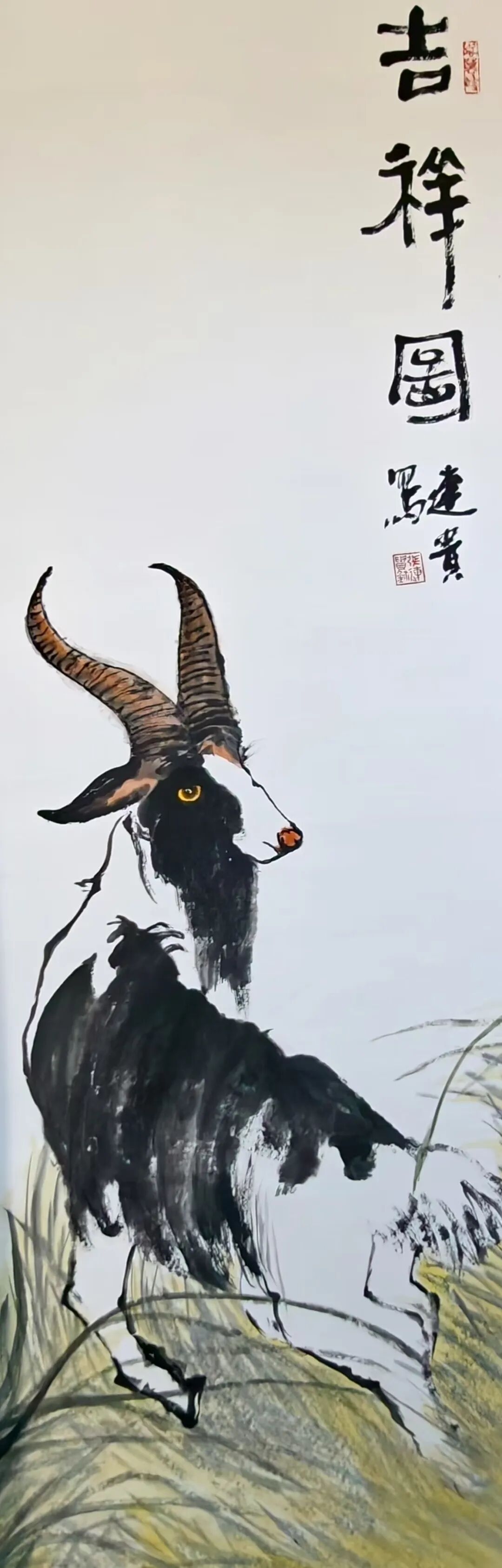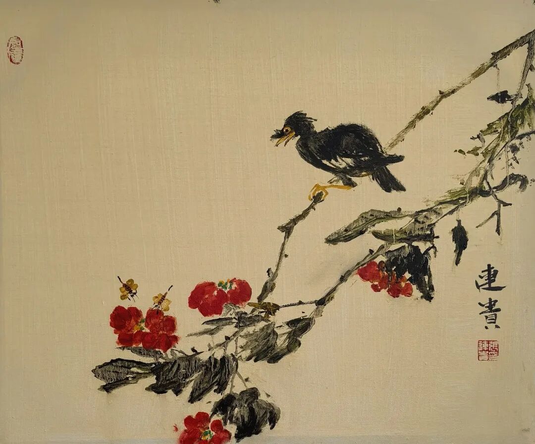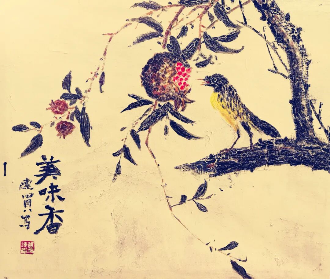 几十年的艺术生涯,不仅锻造了张连贵先生写神取意的丹青功夫,更拓宽了他的写生题材。无论是传统花鸟、山水,还是骏马雄狮,在他笔下皆各有妙造、堪称意趣盎然。单看这幅题为《国色》的花鸟作品,画中细枝横斜,两朵红花正绽芳华,设色浓丽而不失华贵,虽无粗枝老干的野逸之态,却自有一番灵动妙韵。其中更有双蜂萦绕于花间,观之令人心中顿生诗情意趣,实乃细蕊含香蜂竞绕,一枝红艳寄春风!整体技法,可以说是以油画浓郁饱满的色彩去表现中国写意风格,是谓兼具西方绘技的实感与东方韵味的灵动,最终创造出了一种跨界的视觉新意。