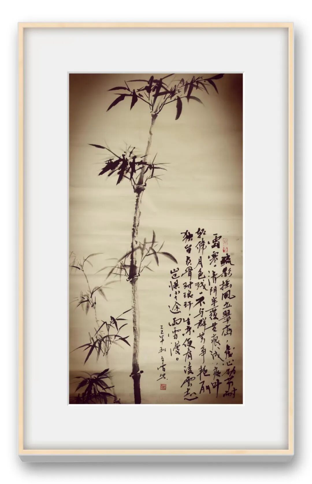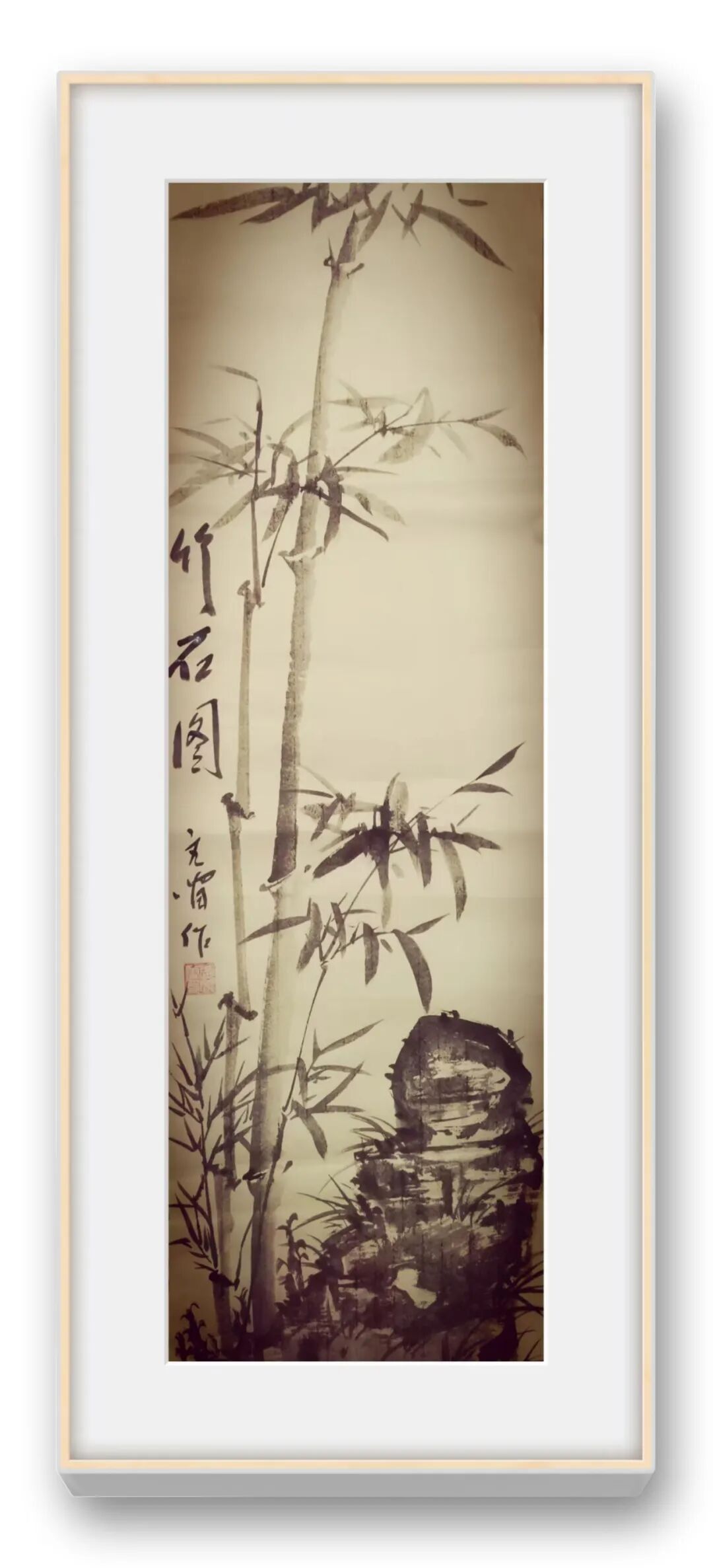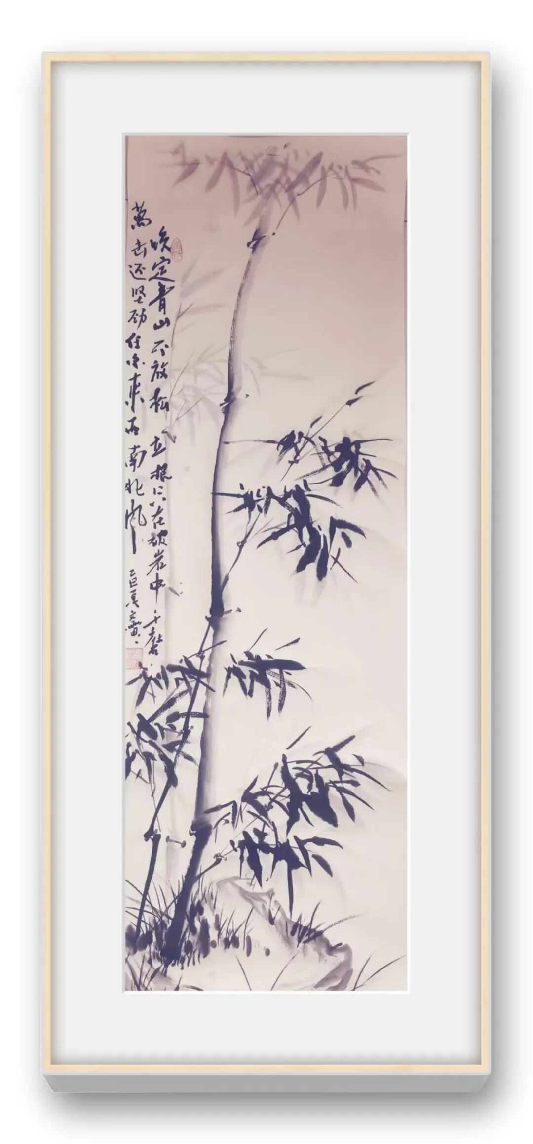 品张文雷先生《竹石兰三君图》,墨竹挺拔劲秀,竹叶疏密有致,以浓淡墨色展现出层次与生机;石之皴法苍劲,兰草清雅,三者相衬,气韵和谐。笔墨简练却意趣盎然,将竹之高洁、石之坚毅、兰之清幽的品格融于一纸,题款与钤印也相得益彰,增添了文人画的书卷气。单竿竹修长挺秀,竹叶姿态灵动,似有清风拂过。题诗书法洒脱,与墨竹笔墨呼应,诗中“虚心劲节耐霜寒”等句,更借竹抒怀,体现出对竹之高洁品性的赞颂。整幅画笔墨相生,意境清逸,既具绘画的视觉美感,又含诗词书法的文化意蕴,是一幅富有精神内涵的文人墨竹佳作。