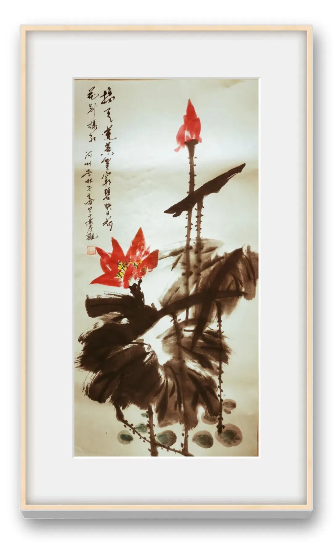 张文雷先生的这幅荷花图颇具韵味。水墨晕染的荷叶,笔触豪放洒脱,浓淡相宜间尽显荷叶的舒展与生机。红色荷花明艳动人,花瓣形态鲜活,花蕊点缀其中,增添了灵动之感。左侧题诗与画面相得益彰,既丰富了视觉层次,又赋予作品文化内涵,整体营造出清雅脱俗的意境,将荷花“出淤泥而不染”的高洁之美展现得颇为精妙,是一幅富有艺术感染力的佳作。