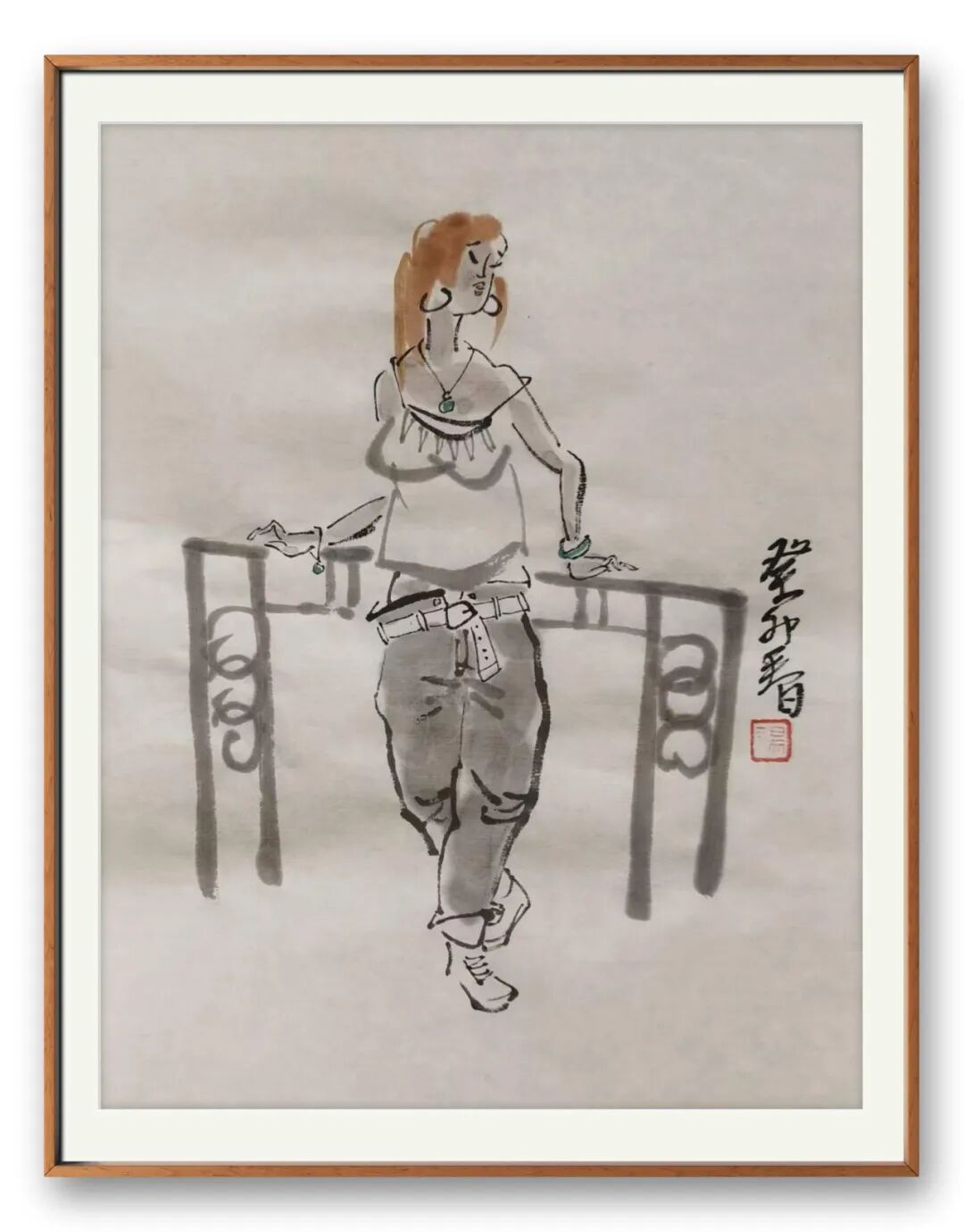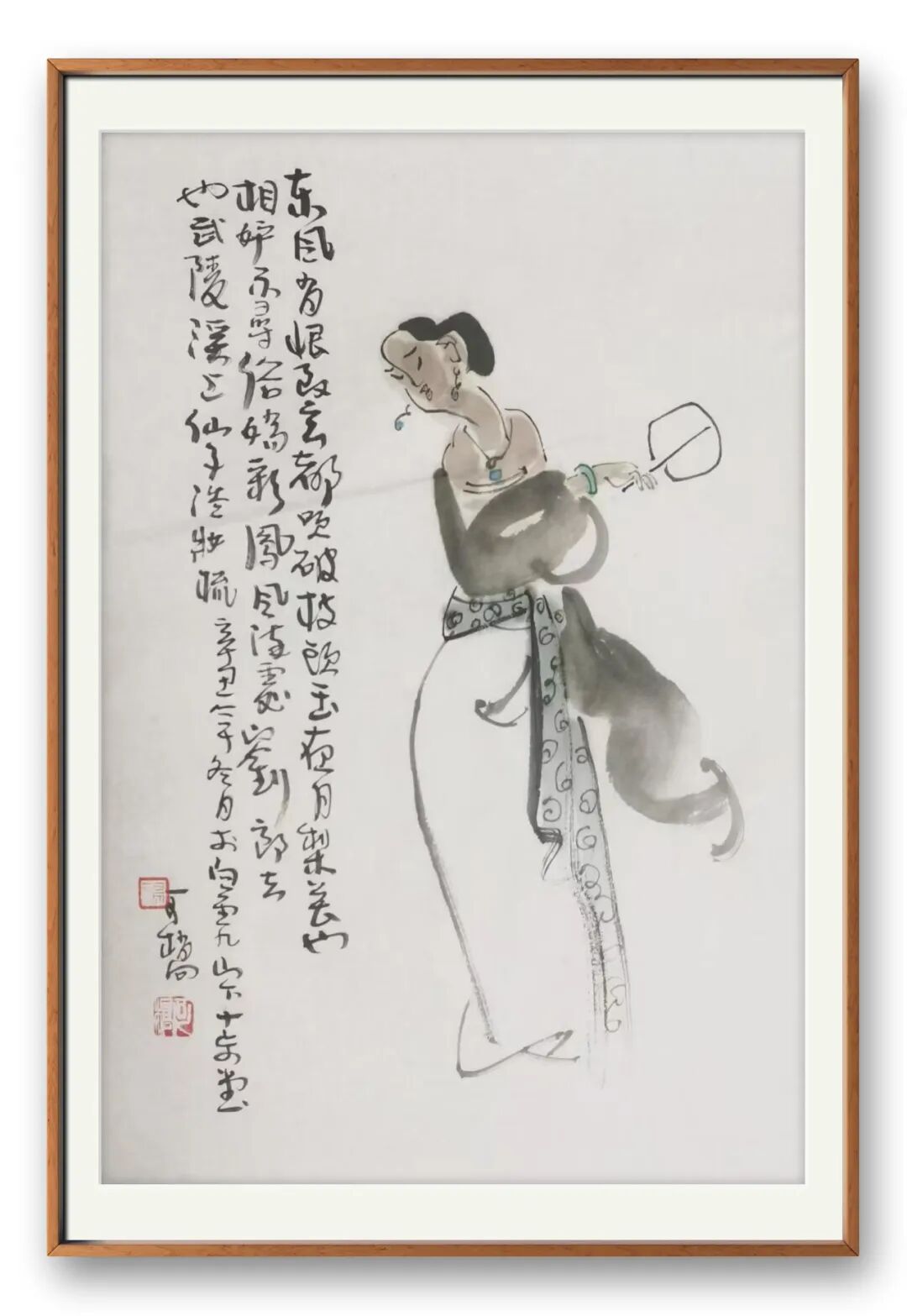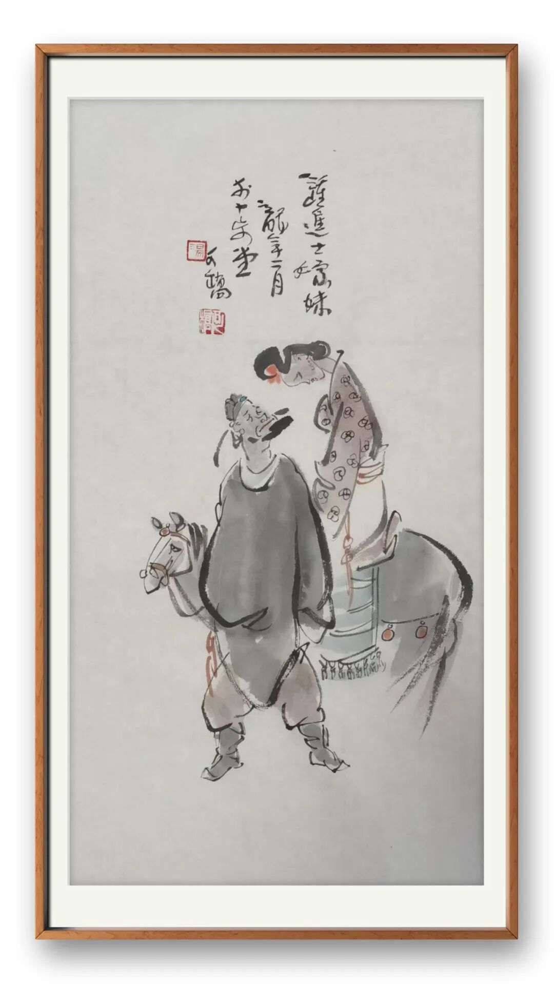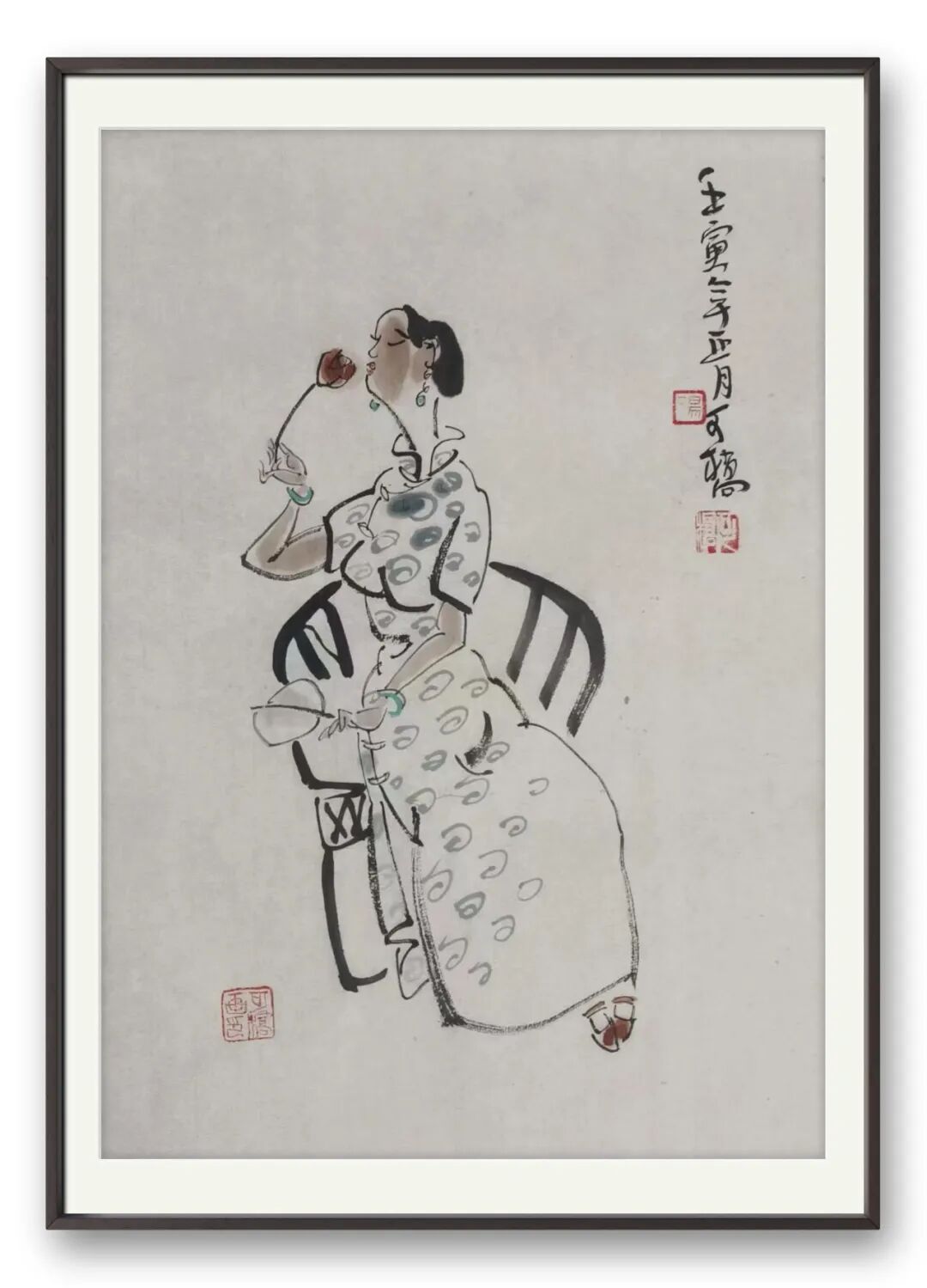 从艺术审美来看,汤先生的画兼具 “简练”“浑融”“洒脱” 三重特质。简练在于笔墨的克制,不冗余、不堆砌;浑融在于气息的贯通,人物与背景、墨色与留白无生硬割裂,如流水般自然;洒脱则在于用笔的率性,他作画时 “大胆落笔,小心收拾”,笔端带着果敢的气势,却又在细节处暗藏匠心,最终达成 “形神兼备” 的境界。更难得的是,他的人物突破了时空的界限 —— 既有古典人物的温婉雅致,也有现代人物的鲜活灵动;既有东方审美的含蓄内敛,也有西方造型的生动写实,真正做到了 “古今交融、中西贯通”。