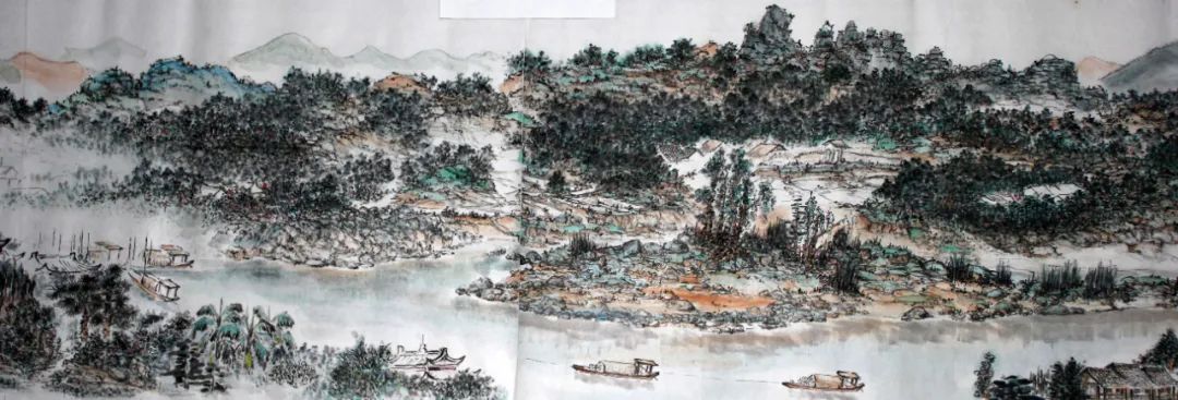 当今画坛,水墨艺术在传统与创新的碰撞中激荡前行。众多画家或囿于笔墨窠臼,或迷失于形式实验。在此背景下,湖南永州——这座浸润着柳宗元文脉与潇湘烟雨的千年古城,孕育出一位以赤诚之心丈量故土变迁的画家陈伍祥。他自号“八愚轩主人”,四十年如一日深耕书画教育,更以"永州三步曲"完成传统山水的创造性转化,以恢弘长卷为永州立传,尤以《锦绣潇湘》系列巨制,奏响传统青绿山水的时代强音。陈伍祥先生在《锦绣潇湘》中重铸青绿山水的灵魂基因,当十六米绢本在眼前徐徐展开,青绿交织的山水空间瞬间将观者纳入怀抱。先生以北宋"三远法"为基,重构时空维度:近景坡石嶙峋,松柏积墨成荫,营造出可驻足休憩的物理场域;中景层峦以石青石绿叠染,云气穿行山腰,形成可极目骋怀的视觉纵深;远景帆影隐现淡霭,引人神思远游。这种空间设计使观者既能"步步可观"苔点蕨草、双钩夹叶等精微细节,又能沉浸于山水环抱的整体意境。蜿蜒潇水如碧绦串联田畴村落,民居依山就势而筑。实现郭熙"可行可望可游可居"的美学理想。