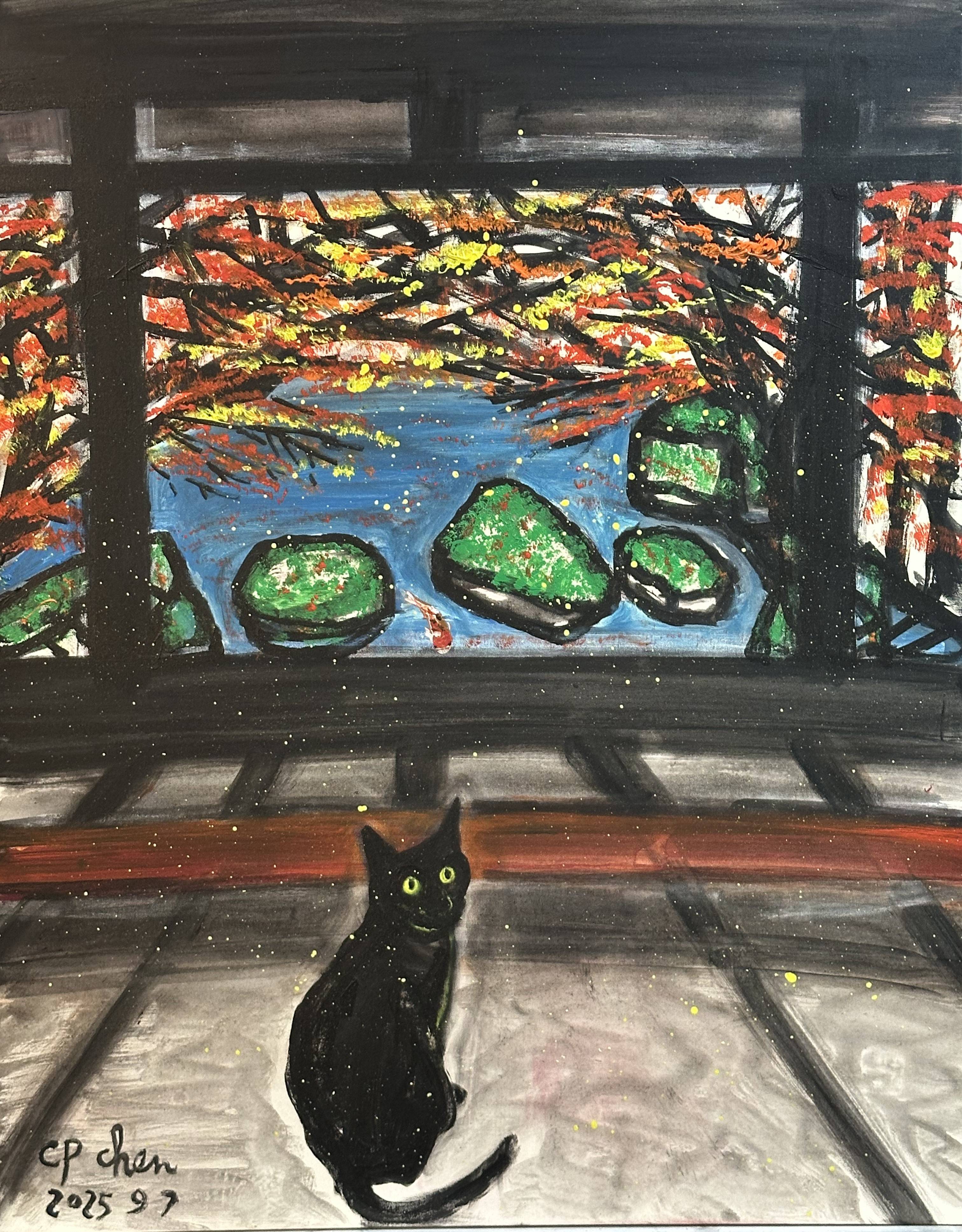 作品中,那只黑猫安静地蹲坐于古朴的屋舍内,澄澈的眼眸望向窗外,像是在回望往昔,又似在凝望心中不变的美好。窗外,秋意正浓,树木的枝叶染上斑斓色彩,红的热烈、黄的明亮,在蓝天的映衬下,如打翻的调色盘,肆意挥洒着秋的绚烂。澄澈的水面上,几块覆着青苔的石头静静伫立,一条锦鲤悠然游过,为这静谧的秋景增添了几分灵动。