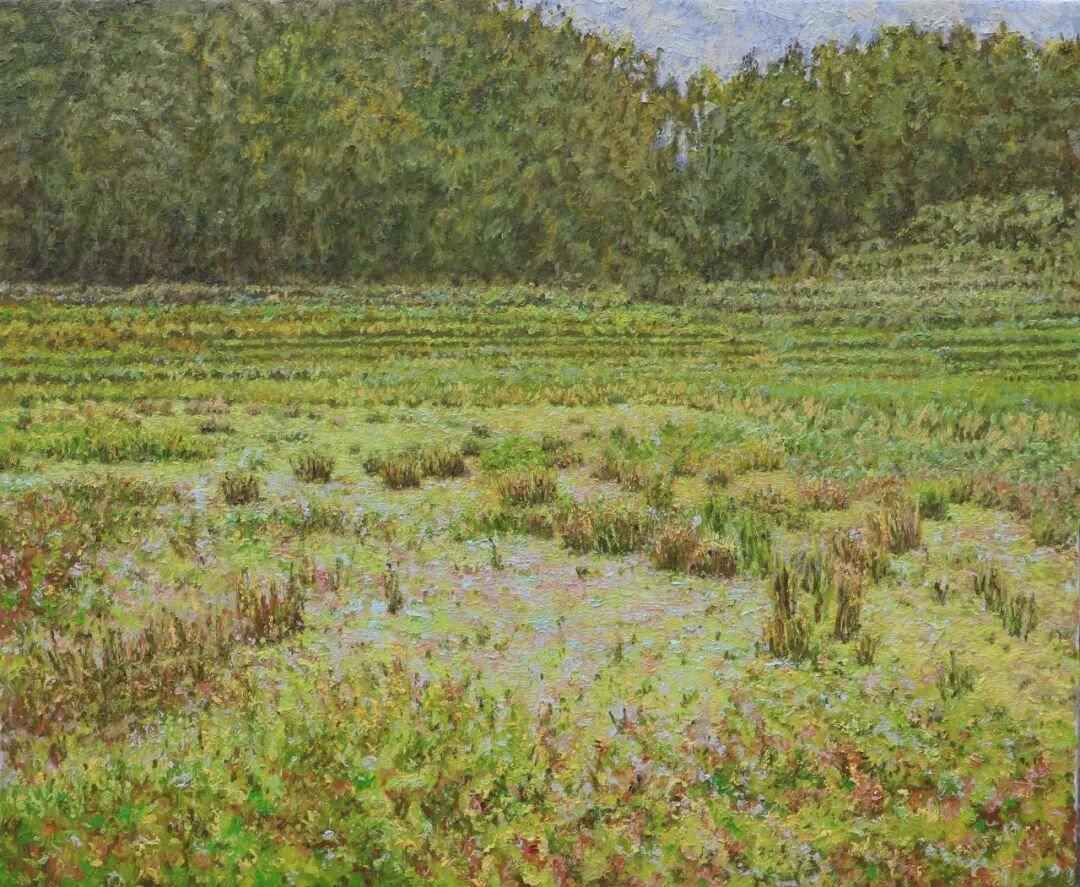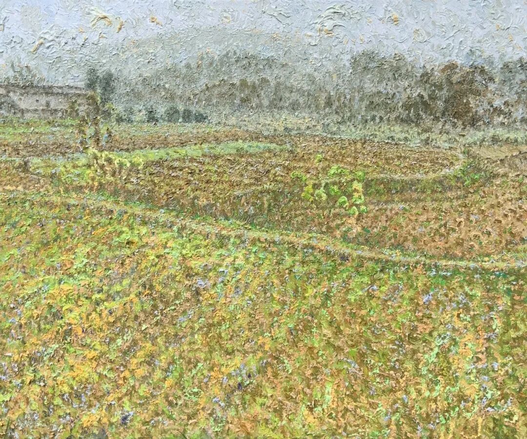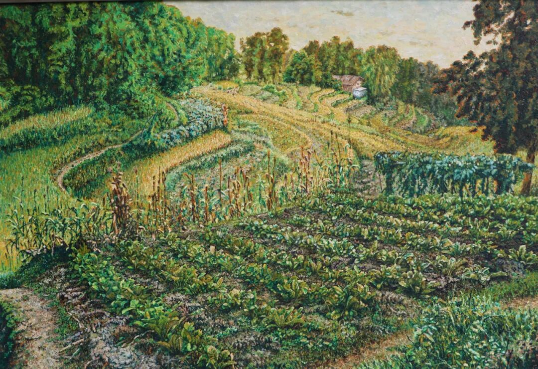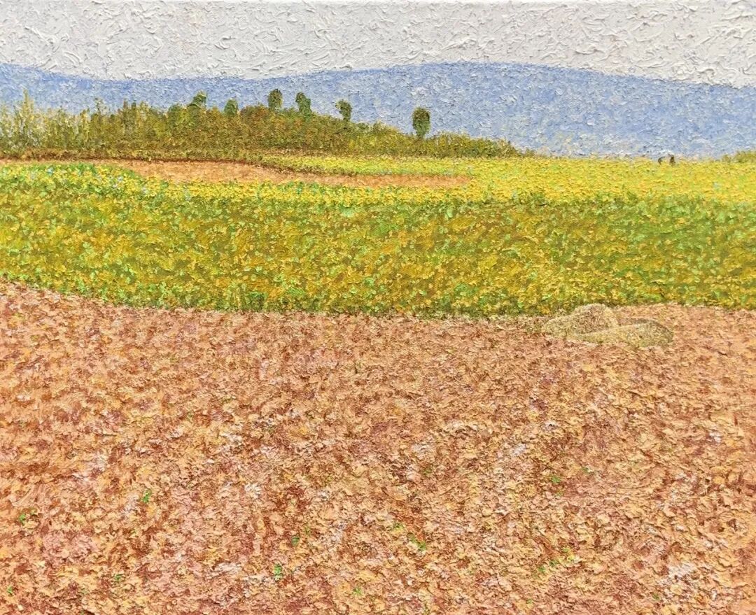 肖亚东对农村题材的热爱,犹如一颗扎根乡土的种子,深深烙印在他的创作生涯中。无论是写生还是创作,他的灵感源泉都来自于农村那片真实而质朴的生活。他笔下的乡村,是宁静的田园牧歌,是美丽的自然风光,是丰收时节丰富的瓜果蔬菜。每一片叶子仿佛都在诉说着生命的蓬勃,每一棵树木都展现出郁郁葱葱的生机。在《故乡是春天里的油菜花》中,大片金黄的油菜花在微风中摇曳,那明亮的色彩仿佛将春天的活力毫无保留地释放出来。画家细腻的笔触,精准地捕捉到了油菜花的形态与质感,让观者仿佛能闻到那淡淡的花香,感受到春日暖阳洒在身上的温暖。这种对自然景物的细致描绘,展现出肖亚东对故乡一草一木的深厚情感,他将对故乡的热爱融入到每一笔色彩之中。