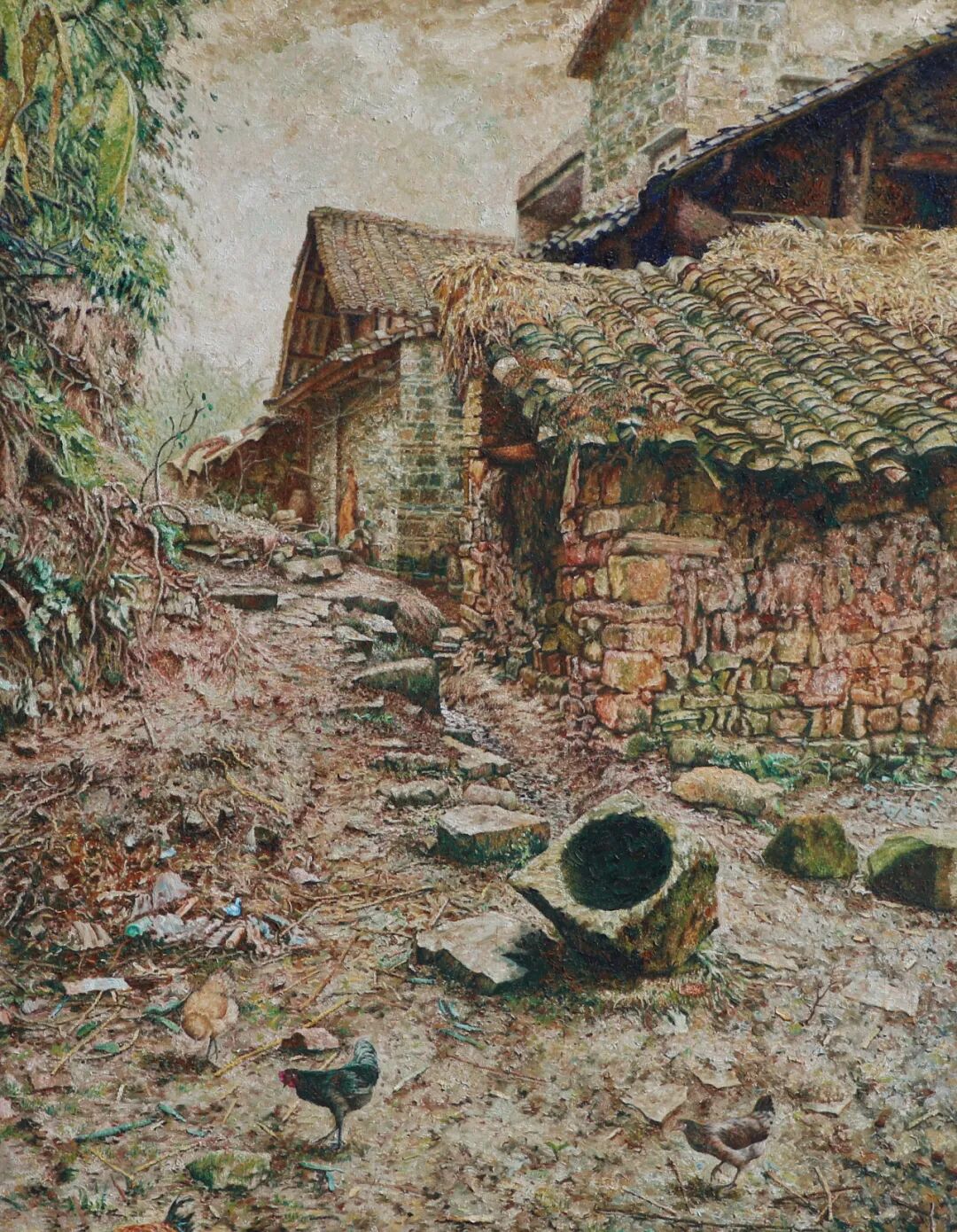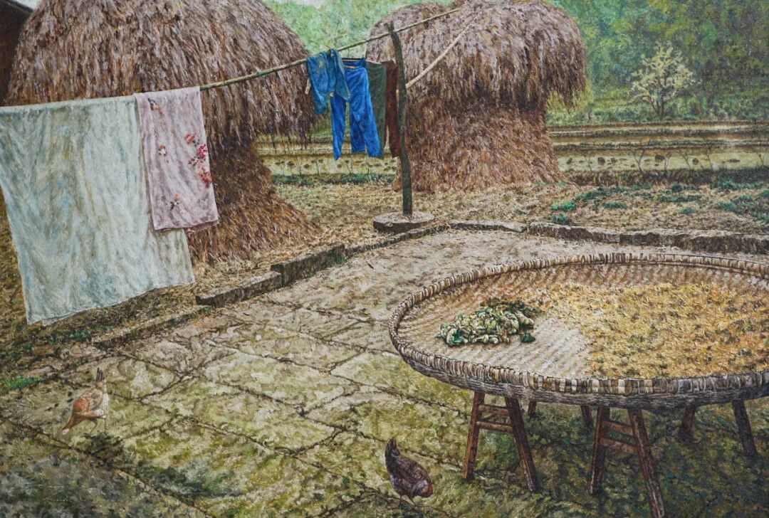油画《故乡的老土鸡依稀还在门前》125X85cm
