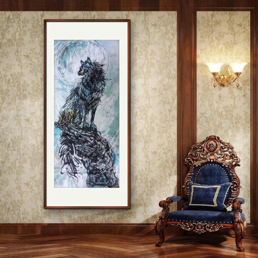 大象的描绘则更显浑厚,以浓墨重彩塑造出大象的庞大身躯与温和神态,线条的运用沉稳而富有变化,将大象的质感与内在的祥和之美展现出来,仿佛在诉说着生命的厚重与包容。狼的形象刻画,在清冷的色调与灵动的线条中,凸显出狼的孤傲与警觉,背景的处理营造出月夜的静谧氛围,让狼的形象更具神秘与野性之美,体现出纪连踽老师对不同动物精神特质的精准捕捉与艺术化表达。