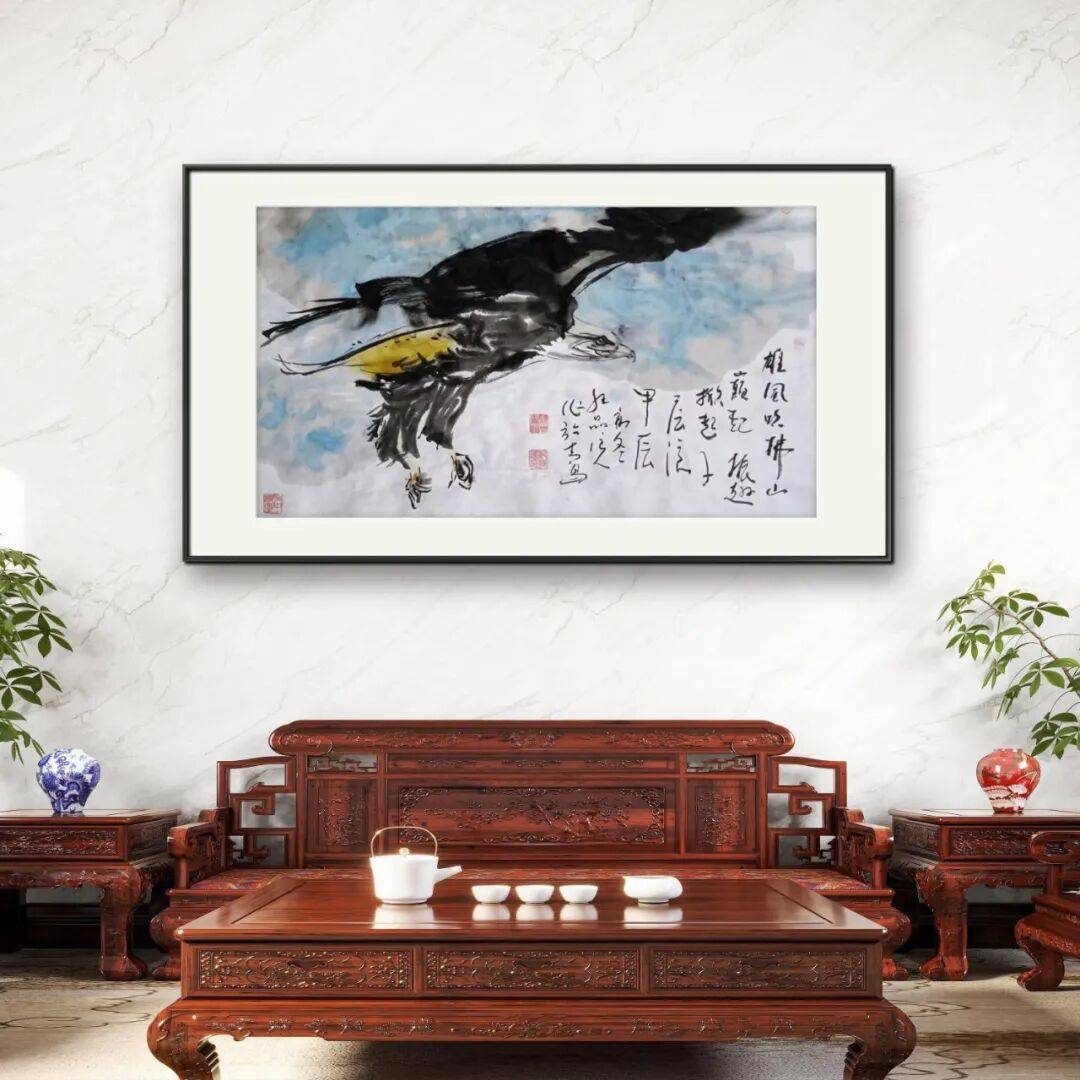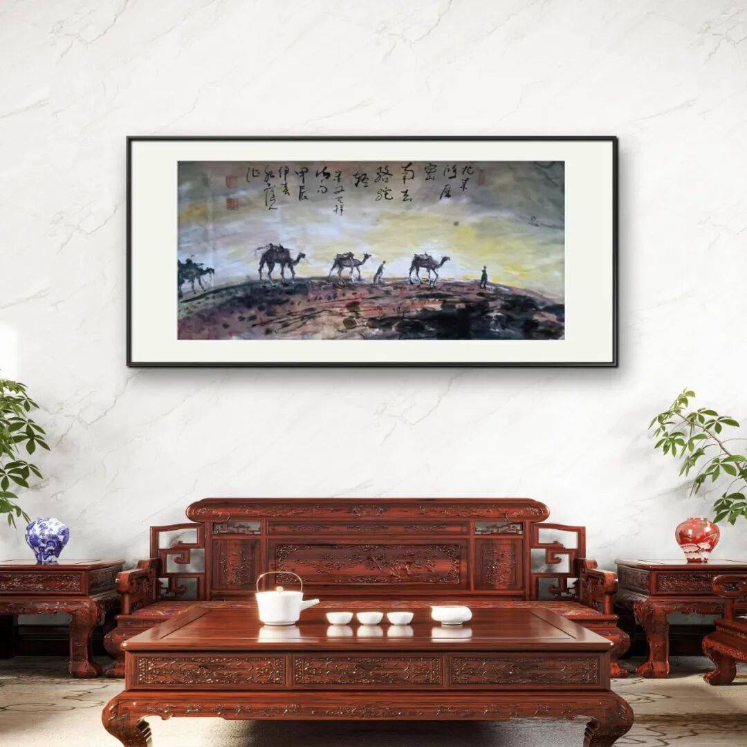 纪连踽老师的画以其动物画为例,画中的鹰,通过浓淡相宜的墨色与遒劲有力的线条,将鹰的矫健身姿与威猛气势表现得淋漓尽致。水墨的晕染营造出天空的浩渺,与鹰的动态形成呼应,仿佛能让人感受到鹰击长空时的那份自由与力量,既有着传统水墨的写意神韵,又融入了现代艺术对生命力量的歌颂。骆驼题材的画作,画面色调古朴厚重,骆驼的造型虽简约却极具神韵,人物与骆驼在苍茫大地与天空的映衬下,传递出一种坚韧不拔的丝路精神,那是对历史与人文的深情回望,在笔墨间勾勒出岁月的沧桑与生命的顽强。