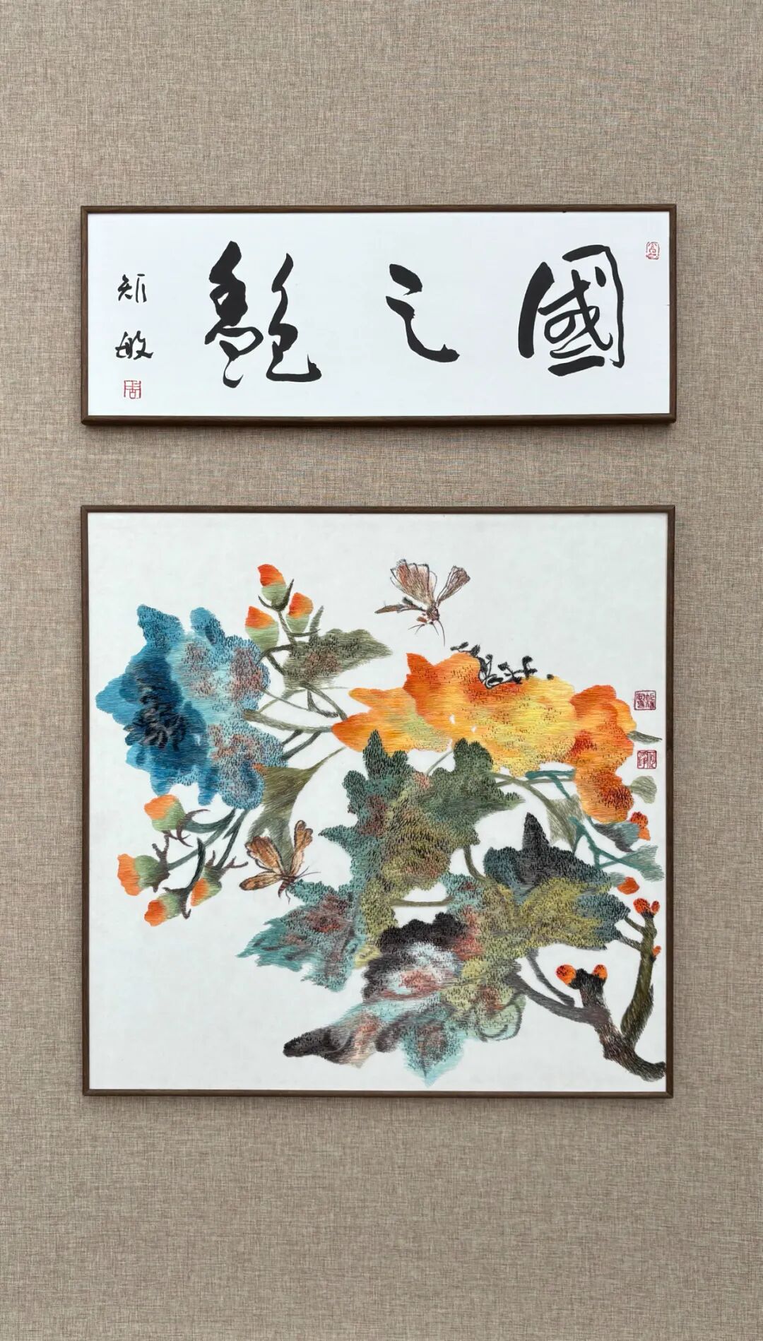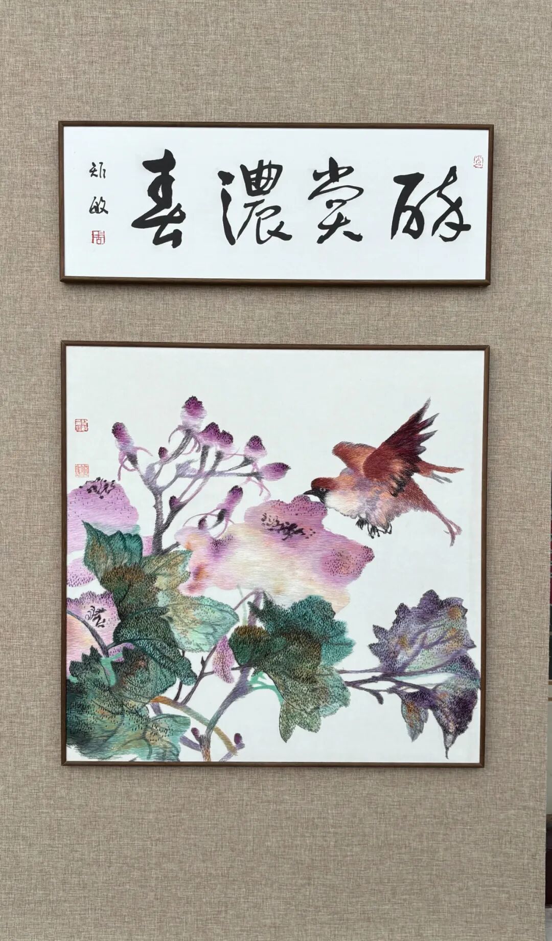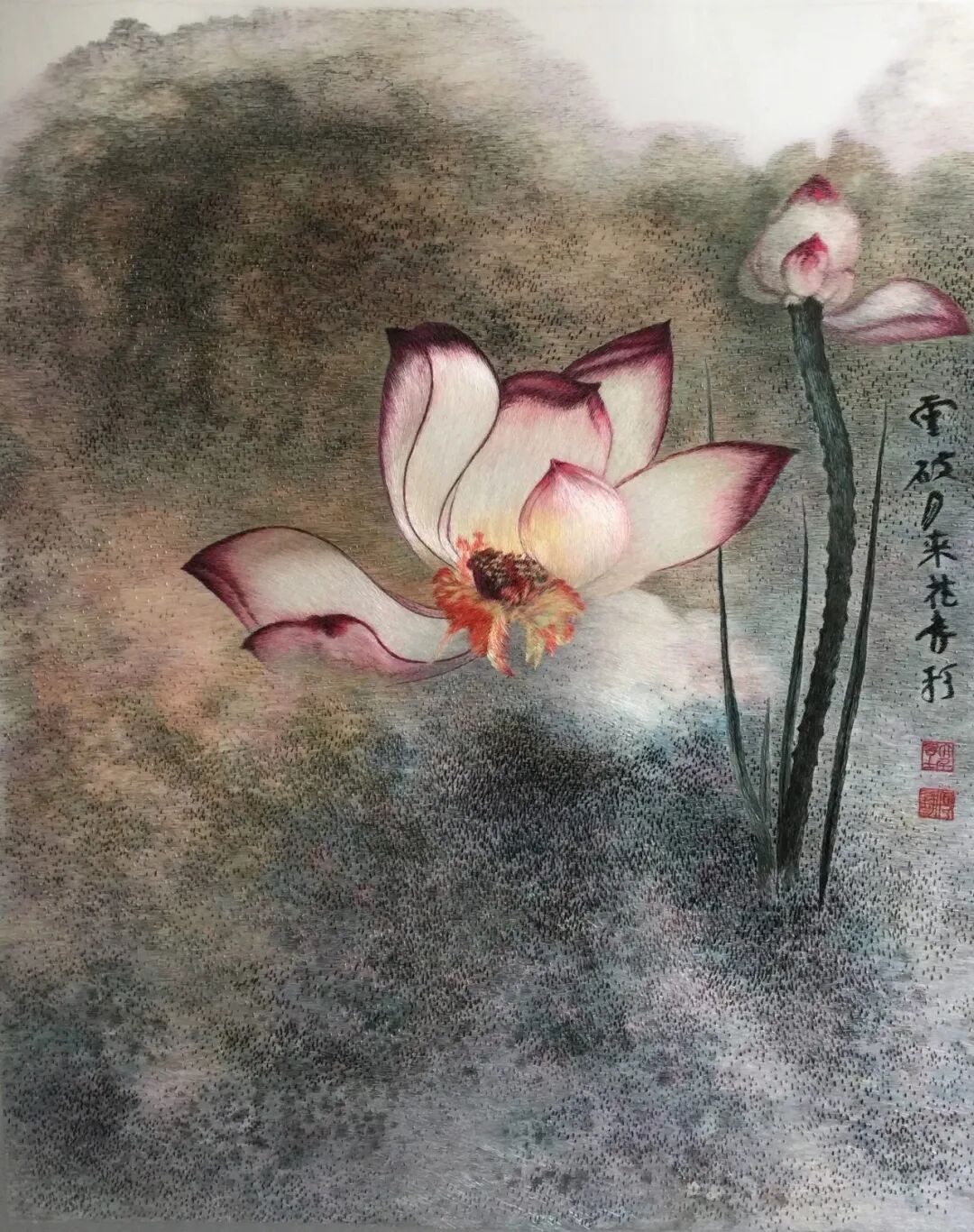 绘画的即兴与书写性与刺绣的缜密与工艺性,在她的艺术世界里,时时存有动人心扉的美好对话机制,能画得一手好画,所以能刺得一手好绣,究其核心人的修养与学养是根本。丹青丝绣两相宜,千年文脉续古今。何铮女士的中国画与刺绣创作,堪称是当代美术中的并蒂莲花,同根同源,又相互辉映。绘画修养提升了刺绣的格调与意境,使绣品超越技艺,具备文人画的雅致气韵。刺绣实践的极致求精又反哺绘画,令画画时的用笔用墨更添匠心,对物象的塑造也更为精微。两者共同构筑的艺术体系,完整而丰富,是集中体现出了艺术家对“雅、逸、精、妙”这一传统美学境界的不懈追求,文化涵养于内,技道传承于外,如此内外兼修,真可谓光华自现!
