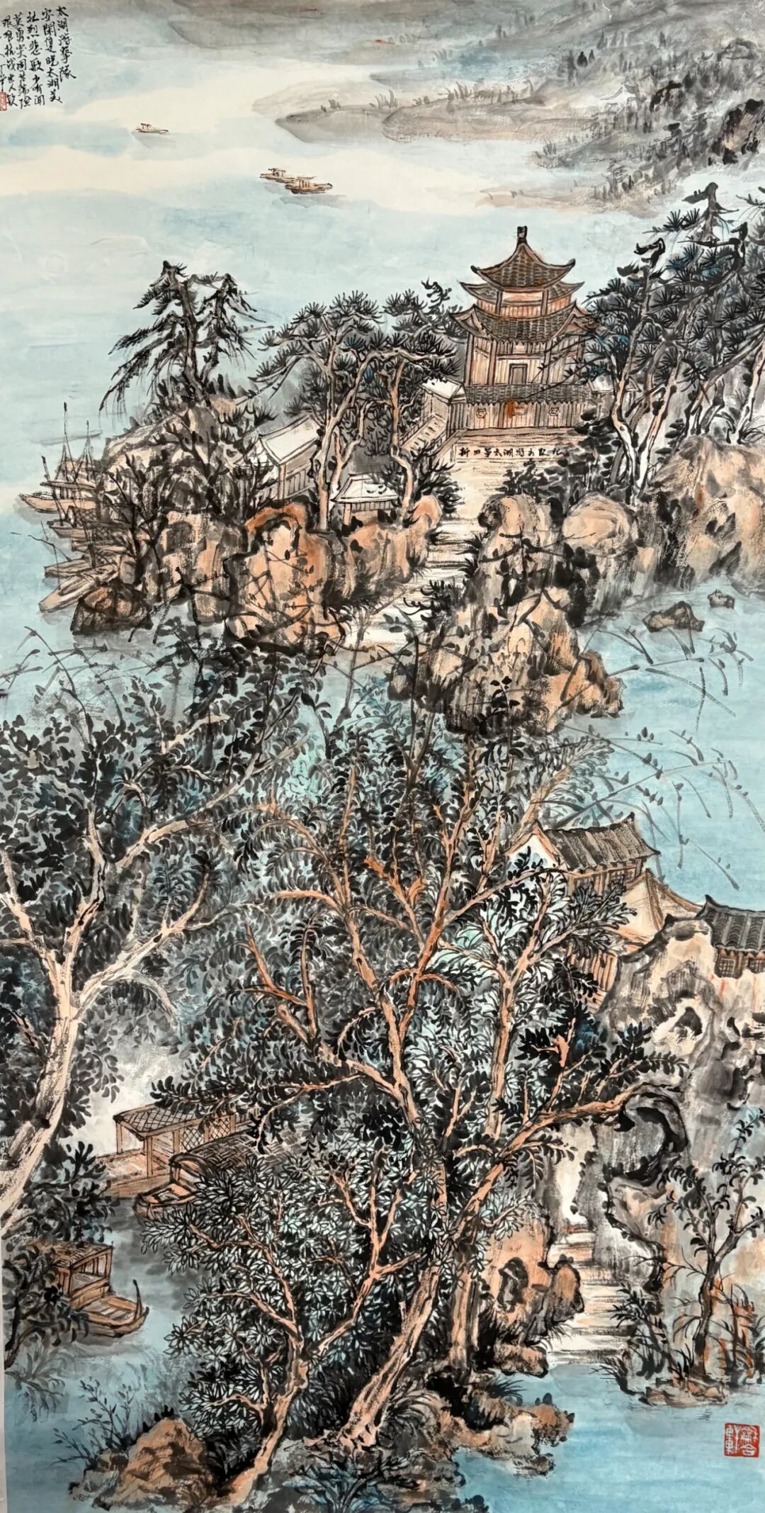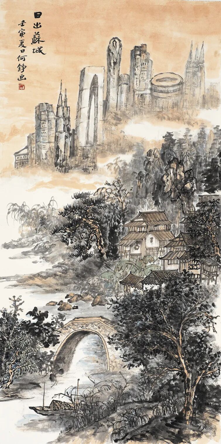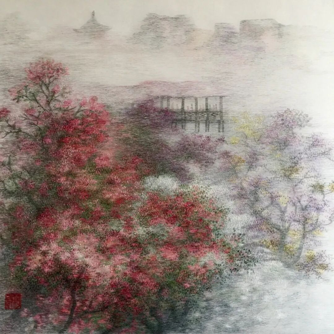 何铮女士的艺术创作是贯通笔墨与锦丝,精彩于中国画与刺绣两种美术形态。她以独特的文化学养与精湛技艺,实践着彼此滋养、相得益彰的文化生态。这份成就,既得益于苏州刺绣厂严谨的创作根基,同时也离不开在美专画院的系统学习。她师从殷濓君、朱凤、张继馨、周矩敏等名家,可谓师出名门,博涉多修,于是其艺术才华方可超越单一科目的局限,并最终形成了双栖具优的个人成就!观山水作品,可以陶醉于村居新绿的气韵里,从清绿浅绛中可以清晰感受起笔落笔时到来自宋元传统的气质滋养与江南水乡特有的温润气息。