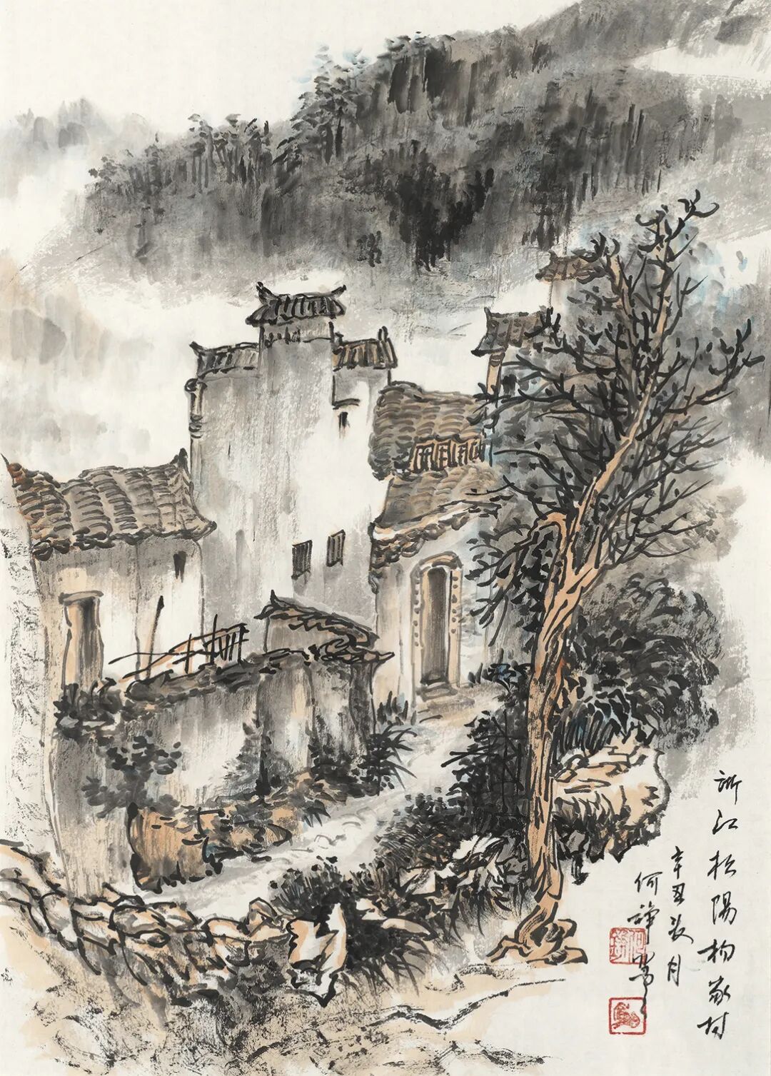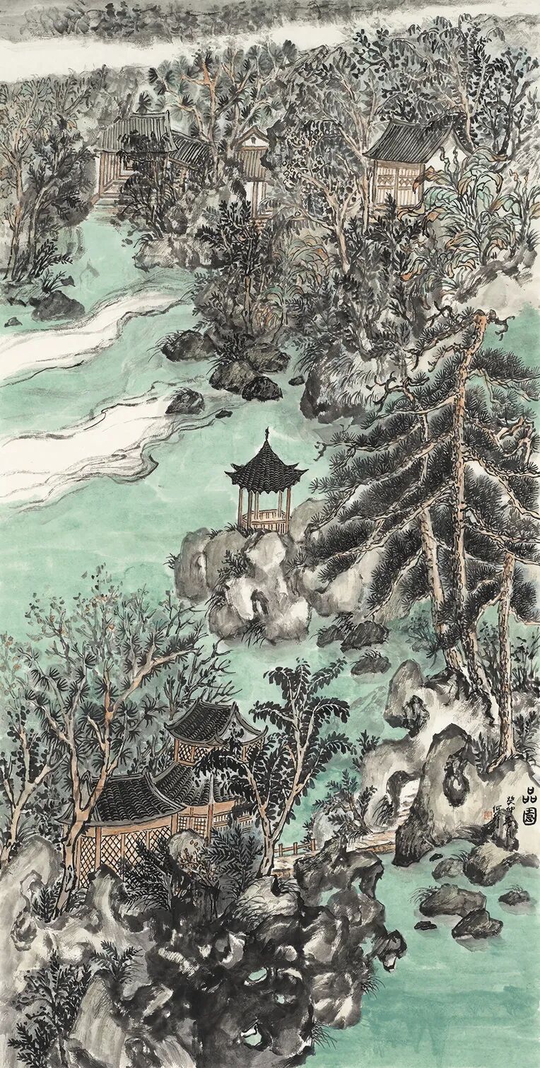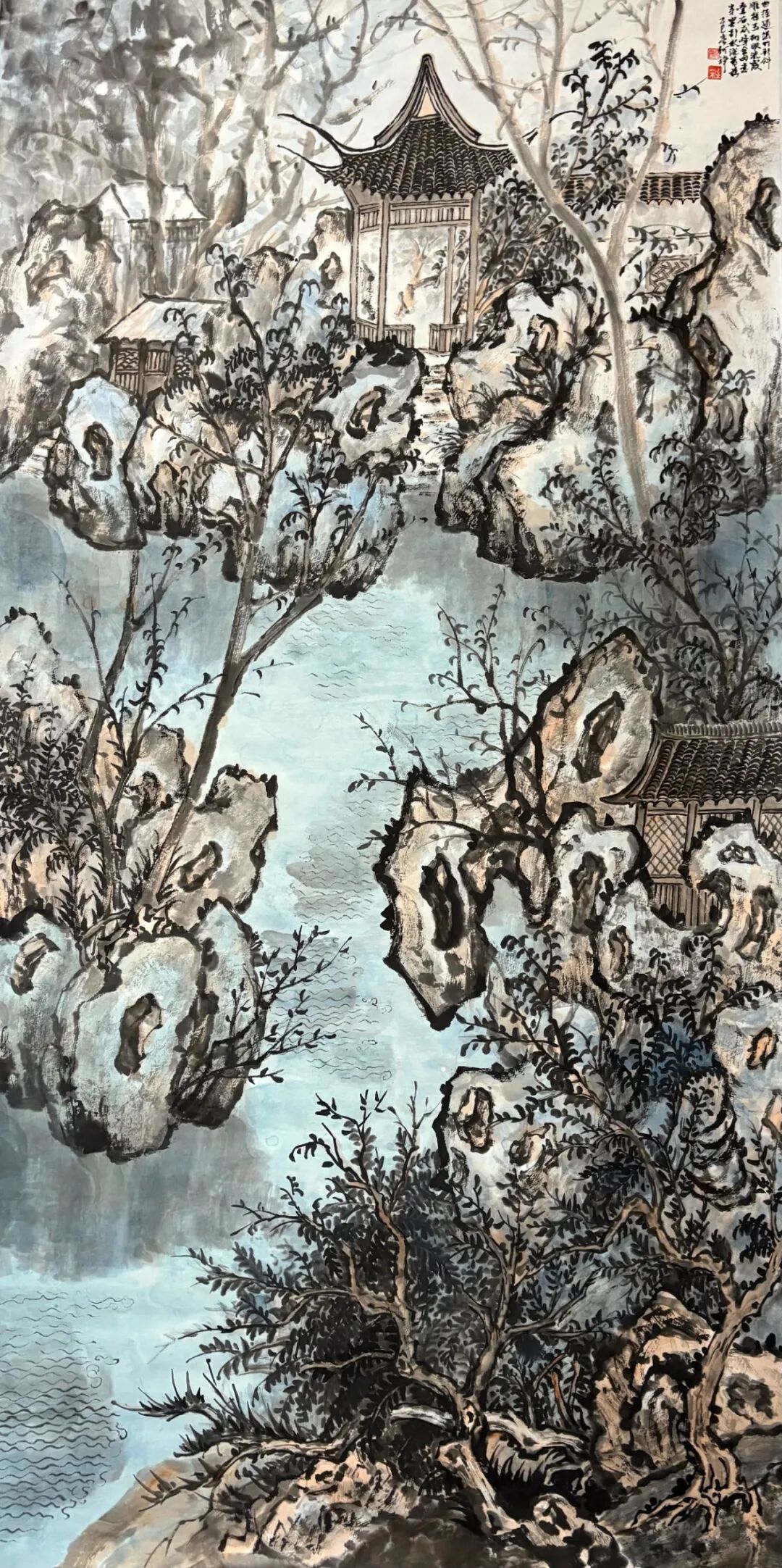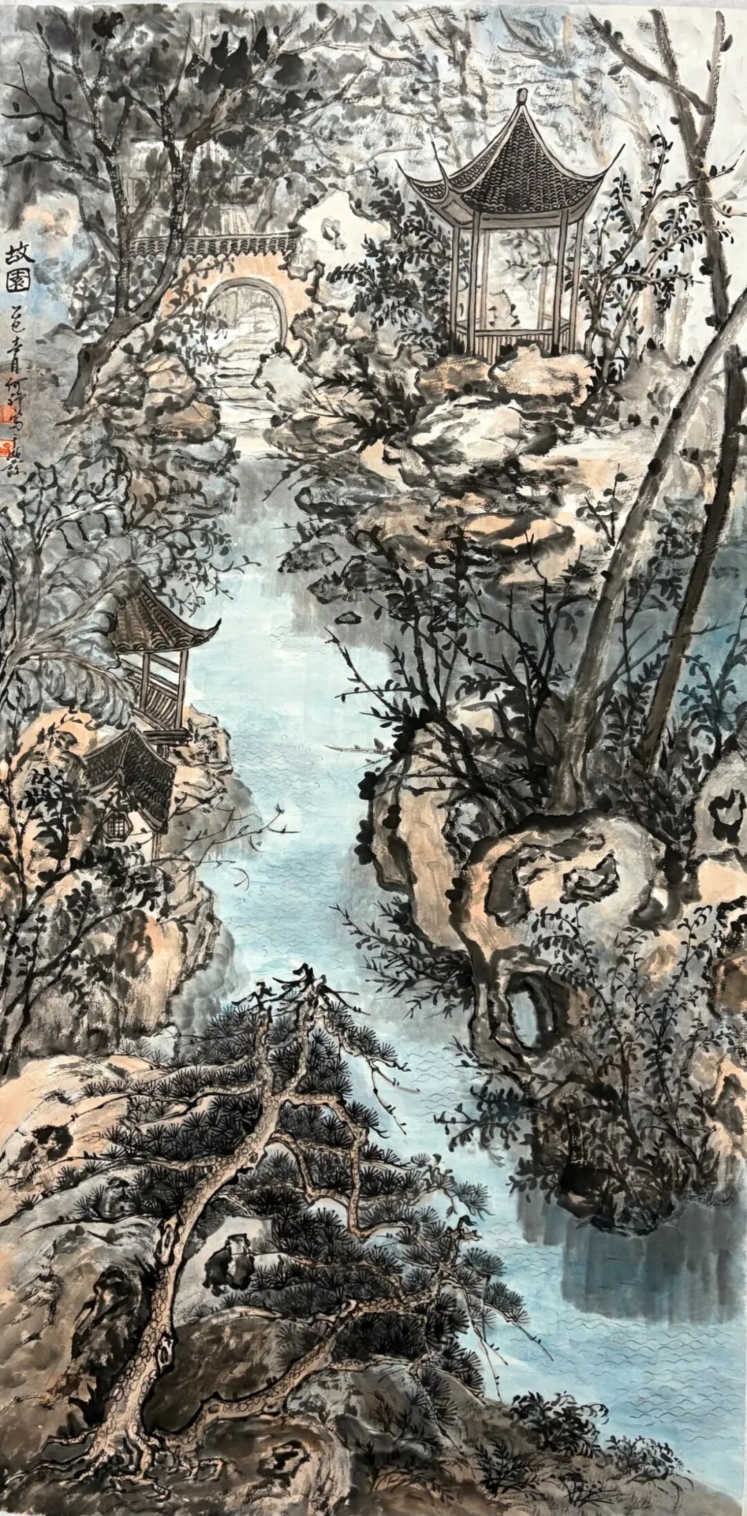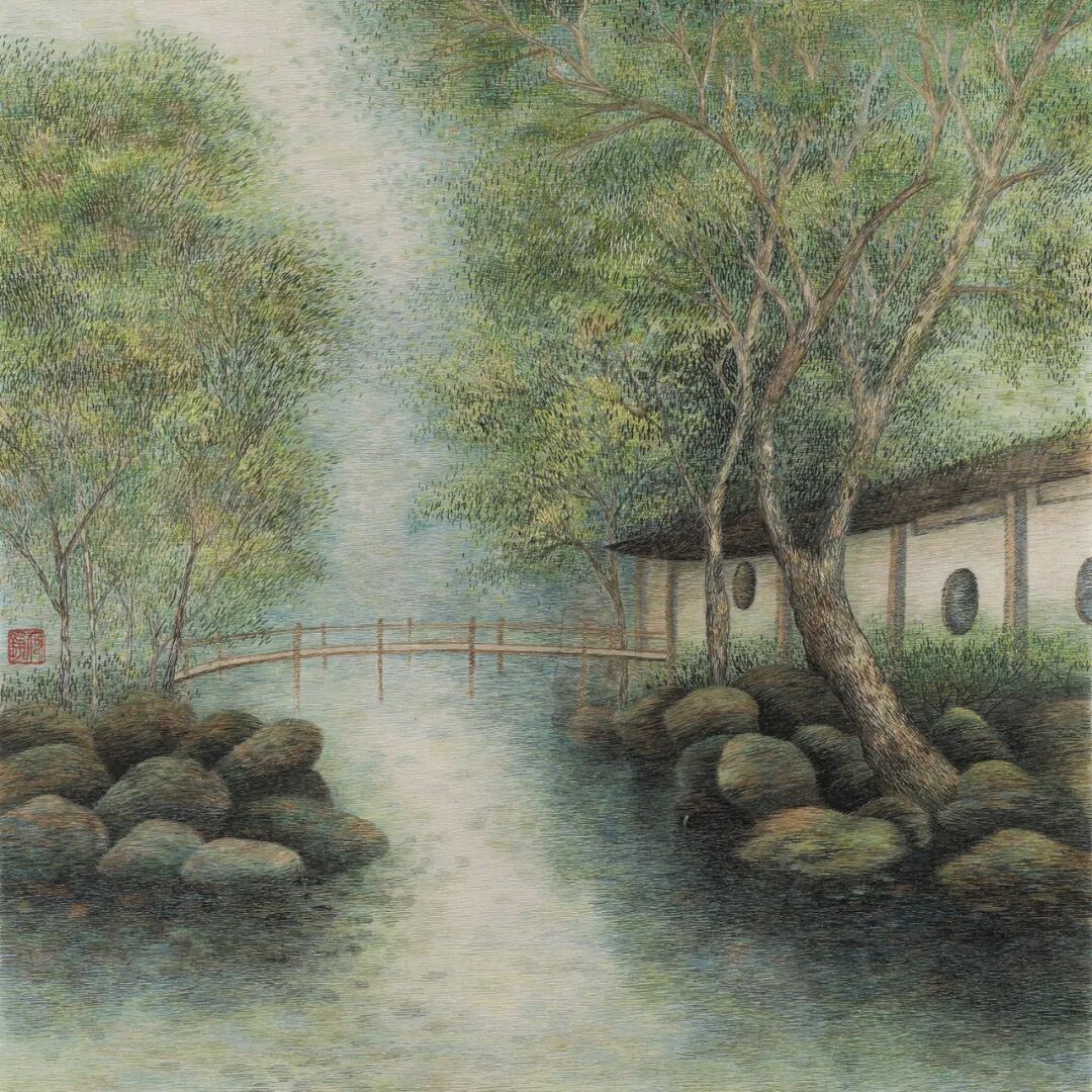 她的山水作品并非奇崛险峻,而是将创作方向投向烟岚环绕、草木华滋的平远之景,写意小桥流水构图疏朗有致,笔墨清润通透,在笔墨虚实相生之际时进营造出可游可居的意境。这些山水作品对空间意境的唯妙营造,显示着画家对传统画质的深刻理解与对自然造化的入境体悟。于是皴擦点染既见古法娴熟,又不乏对自然生机敏锐捕捉后的清新个性,山水如诗、画亦如诗,她的中国画总是透露着远离尘嚣的宁静祥和,游目骋怀,信可悦亦!在她的中国画题材里,园林作为创作对象,成为立体的画、无声的诗,何铮女士以妙观世界的眼光撷取园中一隅,或曲径通幽,或窗景借境,将园林的空间美学转化为纸上的美好构成,运用线条的疏密、墨色的层次,表现出粉墙黛瓦的光影变化与湖石花木的玲珑姿态。