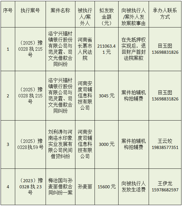 为进一步规范执行案款收发、管理,完善执行案款管理工作,维护当事人合法权益,防范廉政风险,现将洛宁县人民法院拟向案外人发放的金额公示如下: