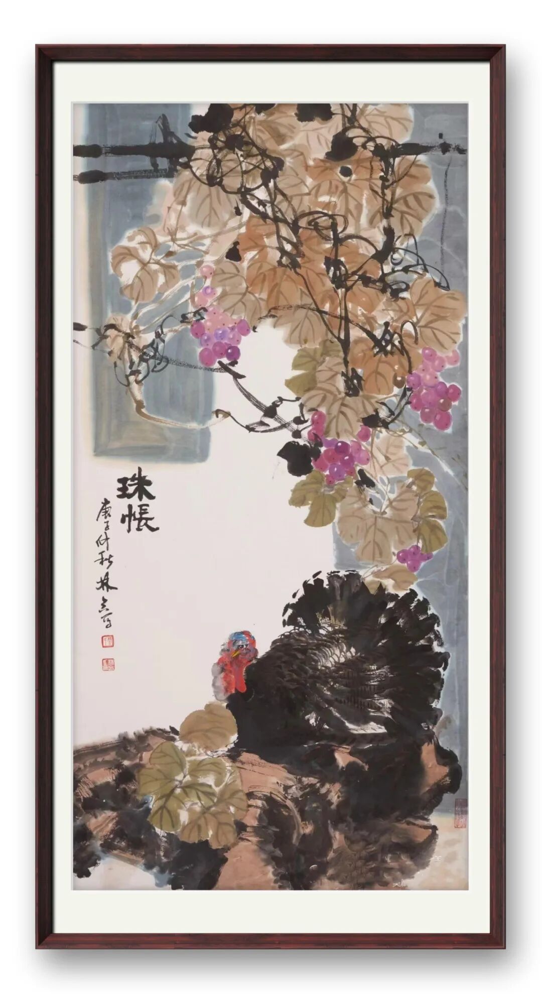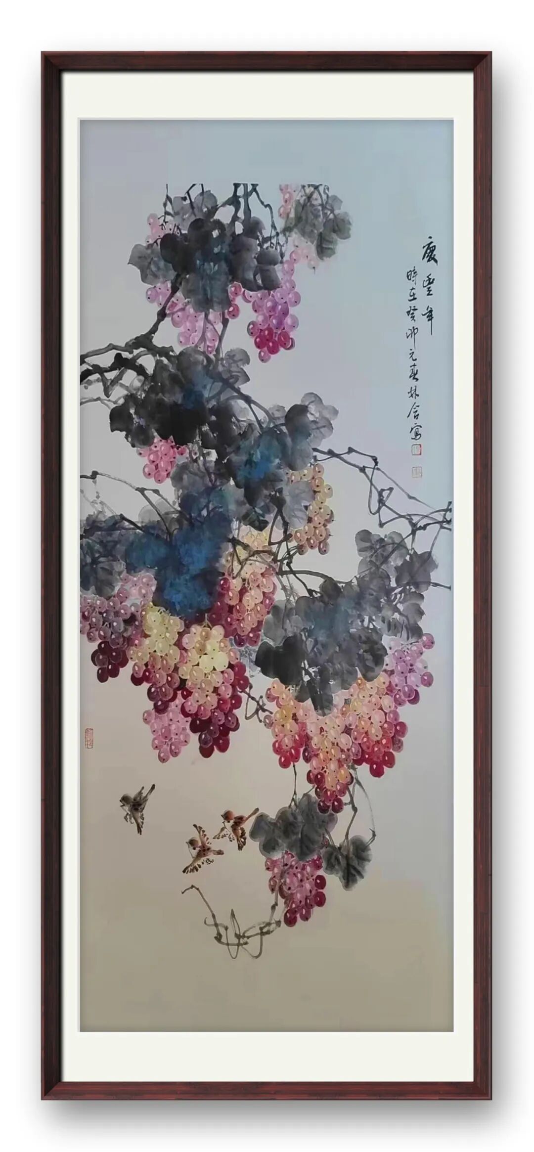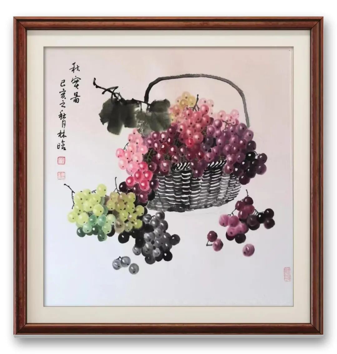 再看其笔下葡萄,细节处更显匠心。葡萄的形态万千,或垂或挂,或聚或散,气脉贯穿整幅作品。着色时,她不刻意追求工整,却在 “不工” 处求 “工”,色彩的过渡自然柔和,颗颗葡萄饱满莹润,似有光泽透出,让人不禁想起 “璞中美玉石般看,画里明珠煞欲穿” 的诗句。这般细腻的笔触,这般对细节的极致追求,正是先生对艺术虔诚态度的最好证明。