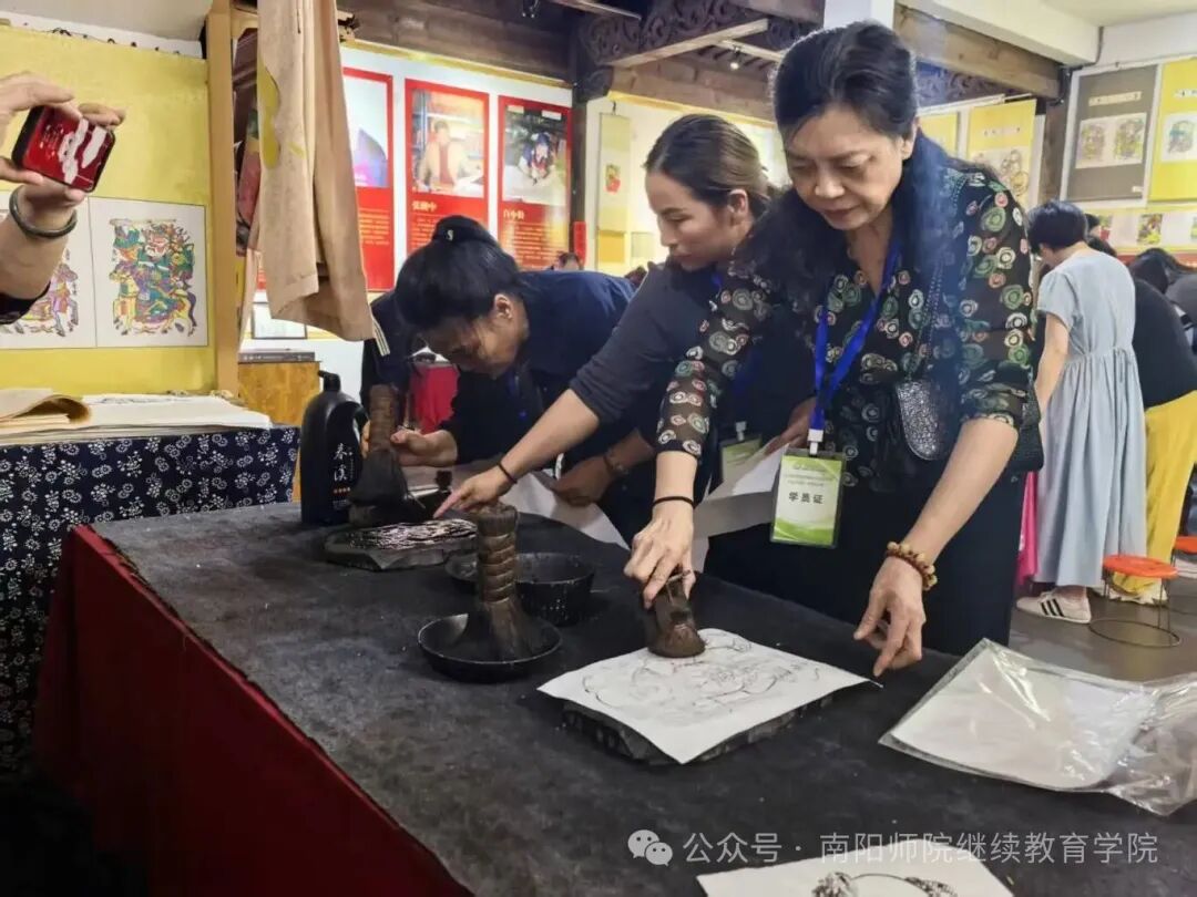 在国家级非物质文化遗产朱仙镇木版年画实践教学基地,学员们系统观摩学习了明清以来不同时期的木版年画代表作,深入了解这项起源于宋代的千年技艺的历史渊源、艺术特色及其在中原民俗文化中的重要地位。国家级非遗传承人张继中先生为学员们带来了一场生动详实的现场教学,他不仅细致讲解了年画的制作工艺和象征寓意,还重点分享了朱仙镇木版年画在当代的创新实践与产业发展路径。张继中表示,传统工艺要与时俱进,既要保持技艺的本真性,又要探索符合现代审美和市场需求的发展模式。在实践体验环节,学员们亲自上手操作,体验了选版、上墨、铺纸、印刷、点染等完整工艺流程。通过理论与实践的结合,学员们对传统工艺的当代价值有了更深理解,提升了文化传承的使命感和创新意识。