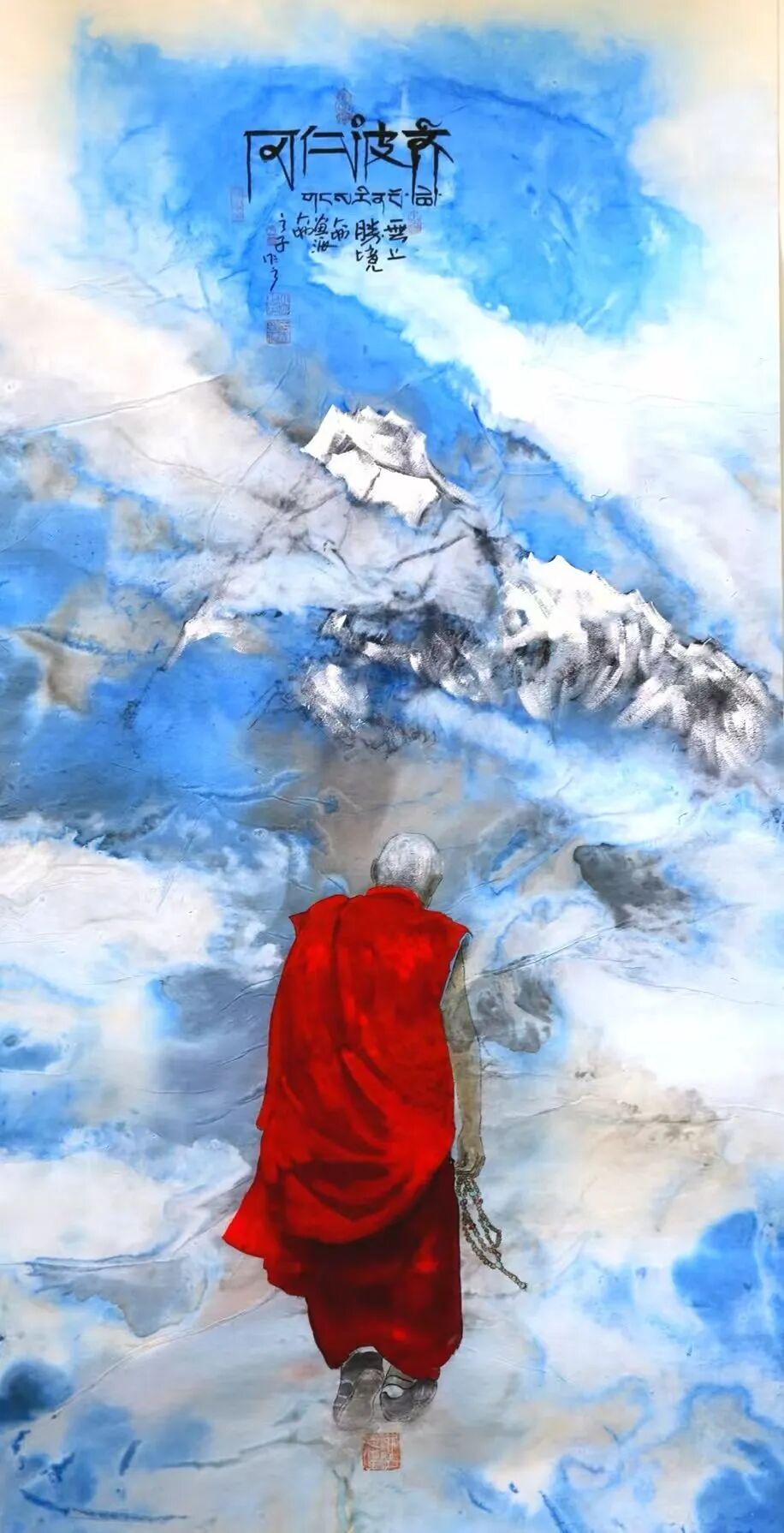 2007年,《九寨神韵》系列问世,以水墨为基,融丙烯艳彩与泼墨手法,既得先生“点线韵律”的遗风,又注入西方光影的戏剧性,画中飞瀑如练,枯树似铁,成了“禅意厚彩”的代表作。2016年,《大地如镜》《大地之子》等作品将“道墨精神”具象化:老子立于青铜鼎旁,须发如瀑,既显华夏文明的厚重,又通过西方厚彩技法赋予其现代感——这正是对先生“不中不西,敢为天下先”理念的当代诠释。(老子形象的塑造,正是《道德经》“道生一,一生二”的视觉表达,以艺术载道,道艺相融。)