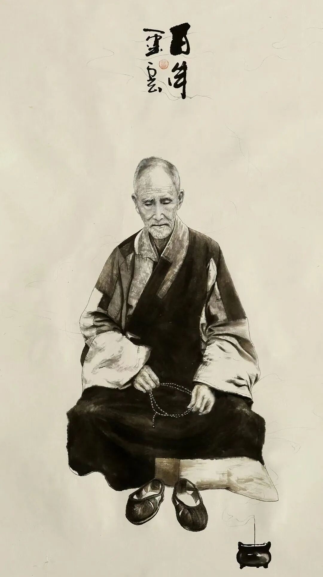 后来,经有缘人对接,我赴北京亲行拜师礼,成了先生晚年惊鸿一现的特殊弟子。彼时先生年事已高,未及传授技法,却以白居易“离离原上草,一岁一枯荣。野火烧不尽,春风吹又生”的诗句,为我阐释艺术的生命力——这株“野草”,成了我此后三十余年艺道求索的精神图腾。先生还叮嘱我:“从艺者绝不敢有媚俗之态、盲从之行、浮躁之作,应有傲骨于胸,应有禅动灵性之悟”,这些话,如今还刻在我画室的墙上,与先生的画像、他赠予我的原作一同供奉,日日香火不断。(先生所言“不媚俗”,正是《道德经》“不欲以静,天下将自定”的艺术写照,心不浮躁,作品自显风骨。)
