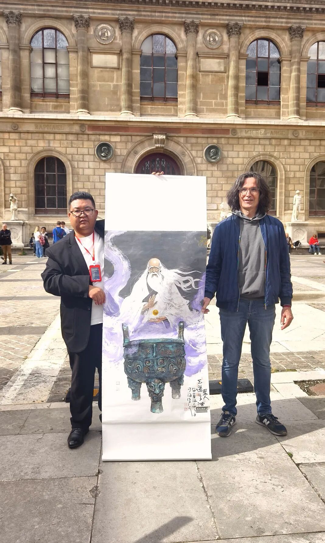 2025年,我的艺术实践迎来“跨越重洋”的里程碑——以《天道圣人老子》系列作品捐赠巴黎国立高等美术学院。这不仅是对2023年卢浮宫获奖缘分的完美闭环,更是对先生1947年留法初心的隔空呼应:先生当年在巴黎种下“中西艺术对话”的种子,如今我带着融合华夏道统的作品归来,让这颗种子在先生的母校结出“华夏文化绽放”的果实。(这跨越时空的呼应,恰似《道德经》“功遂身退,天之道也”,先生播种,我辈结果,顺应道之传承。)