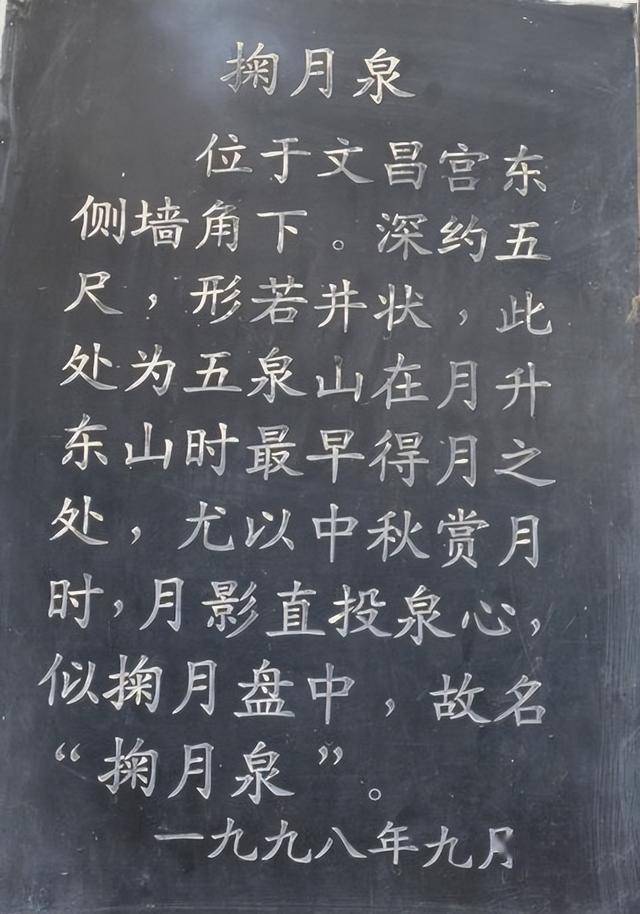 步出甘露泉,便来到文昌宫。宫之东侧,有一垣花墙,其花瓶状小门的门楣之上,醒目地镌刻着三个淡灰色的隶字——掬月泉。这掬月泉与其他几眼泉大相径庭,说它是泉,实则更似井。泉水汇聚于一眼仿若深井的幽深洞穴之中,距离地面约1.6米。每至明月高悬之夜,皎洁的月影径直投映于泉心,恰似将明月捧于盘中,“掬月”这一雅名便由此得来。此外,此处还是西、中、东三条上山路径的交汇之处。