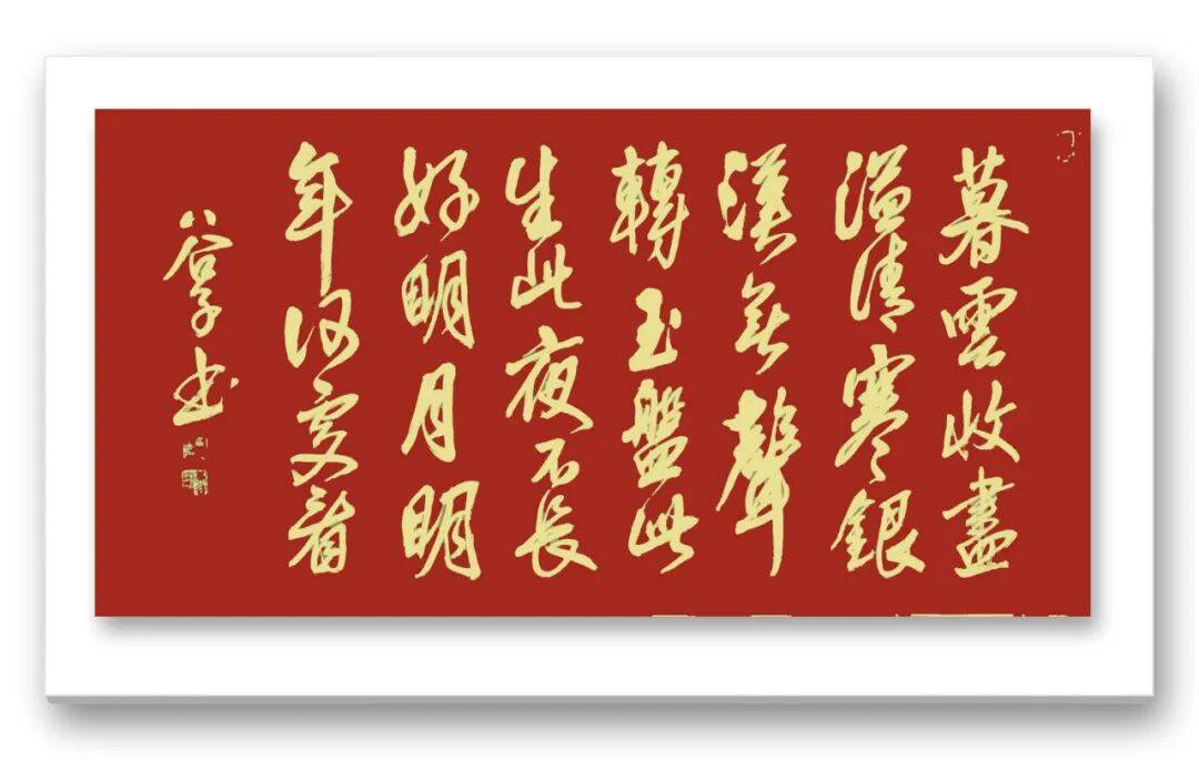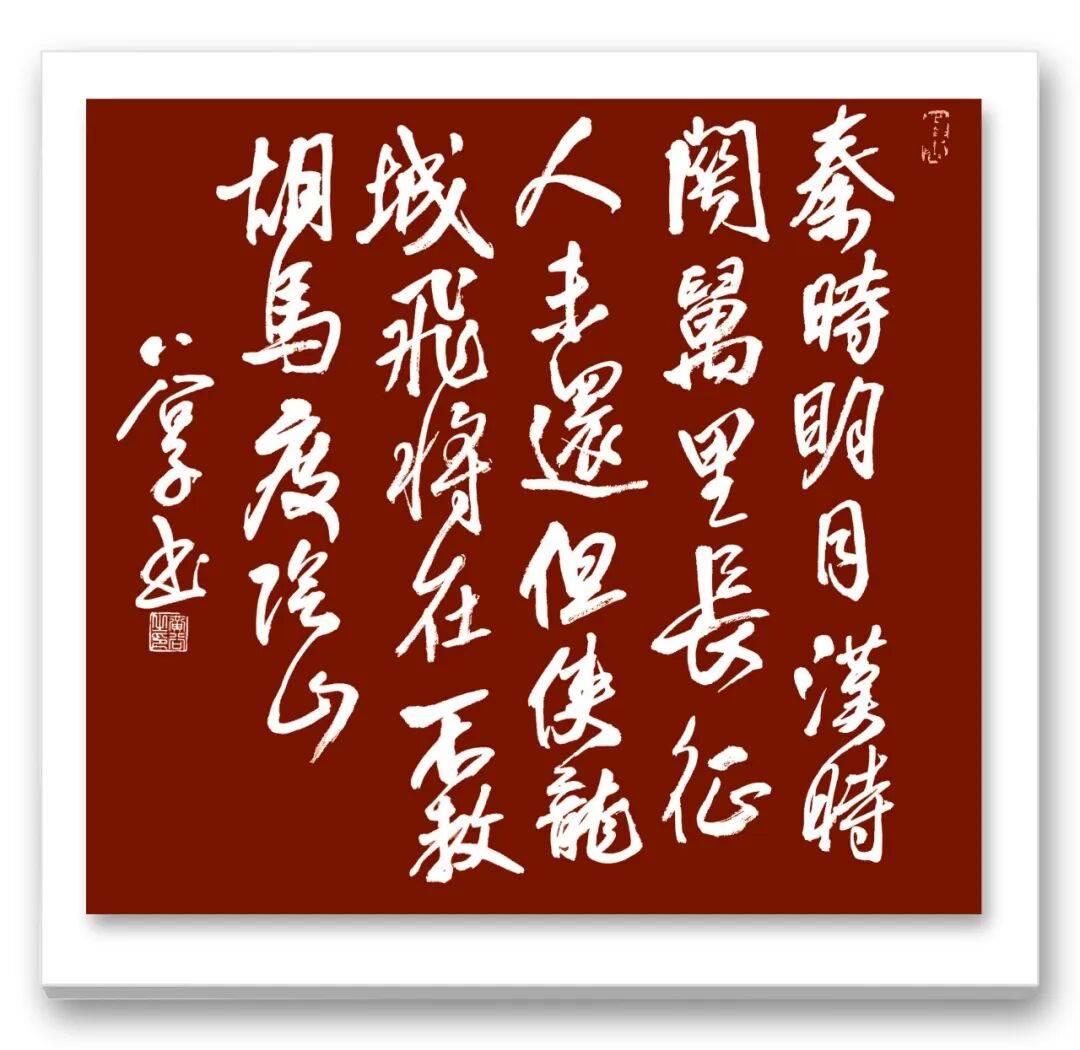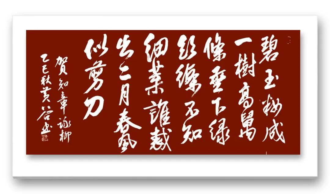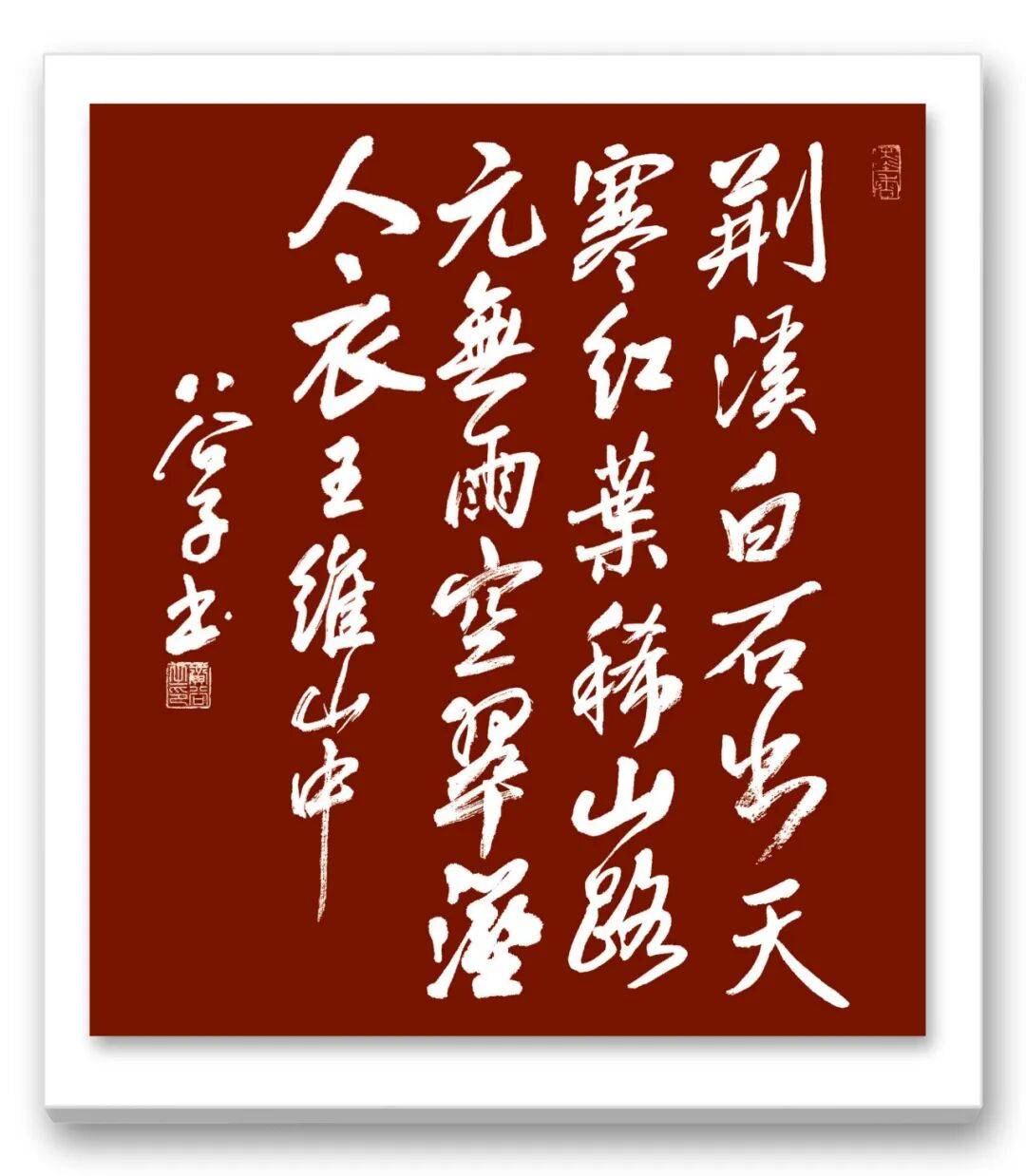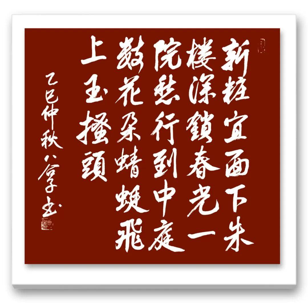 再看其书法的整体布局与章法。每一幅作品,字与字、行与行之间的疏密错落、大小变化,都经过精心的考量。红色的背景与白色(或金色)的笔墨形成强烈的视觉对比,既凸显了传统书法的庄重感,又带有鲜明的现代审美意趣。这种色彩与笔墨的搭配,并非简单的形式设计,而是与书法的内容、情感相呼应,营造出独特的艺术氛围。无论是斗方、条幅还是长卷,都能做到布局和谐,气韵贯通,让整幅作品宛如一首无声的乐章,有着起承转合的节奏与一气呵成的气势,给人以视觉与精神上的双重享受。