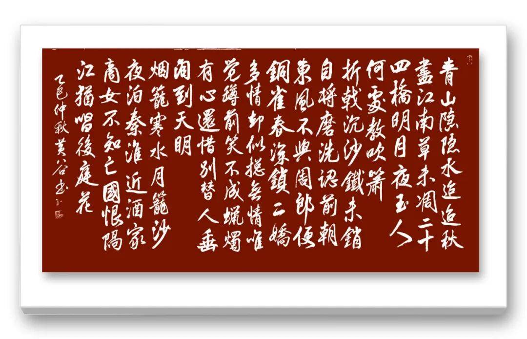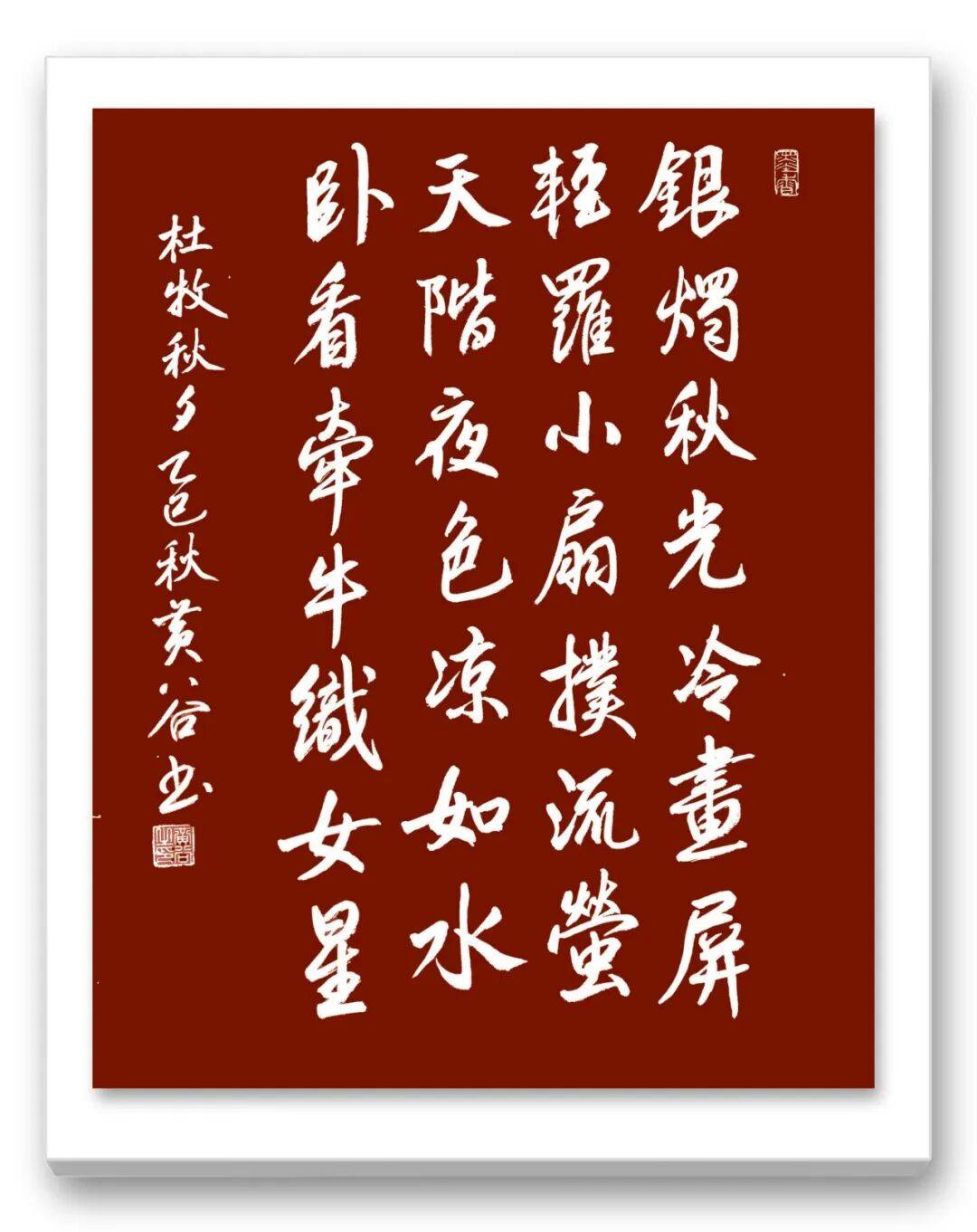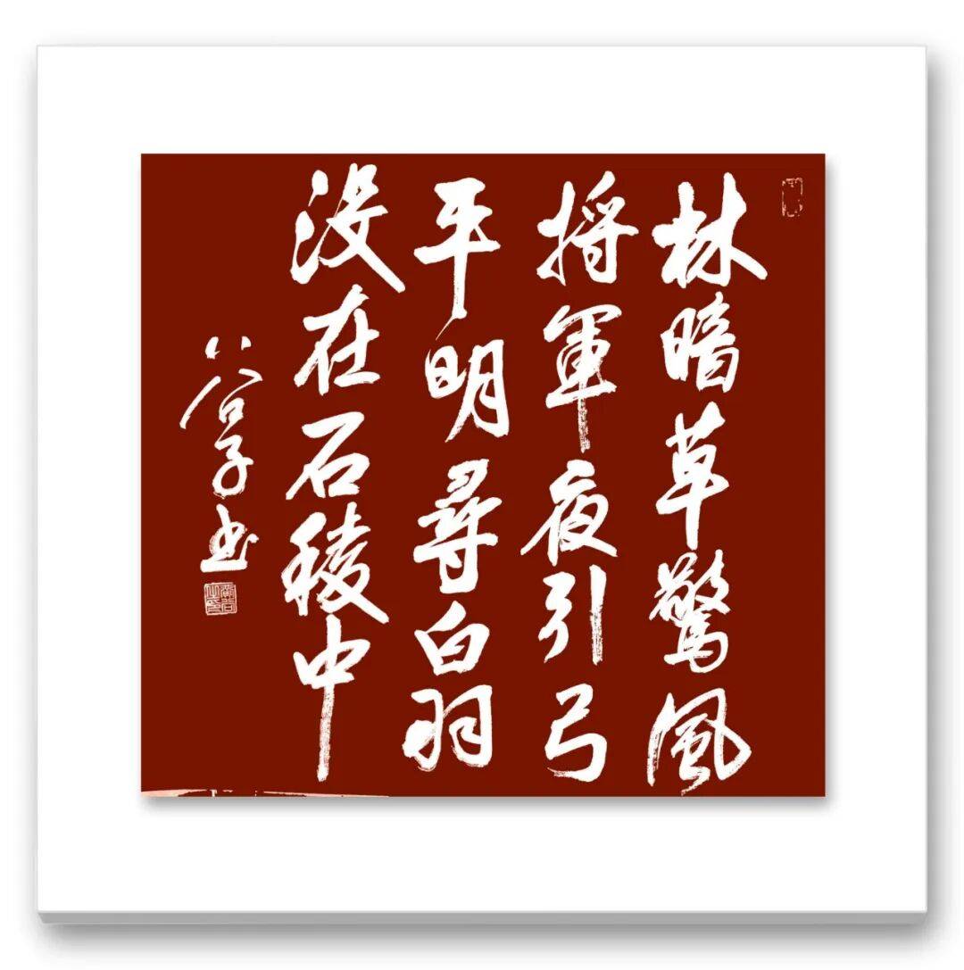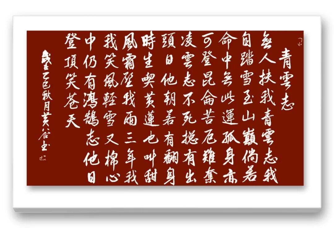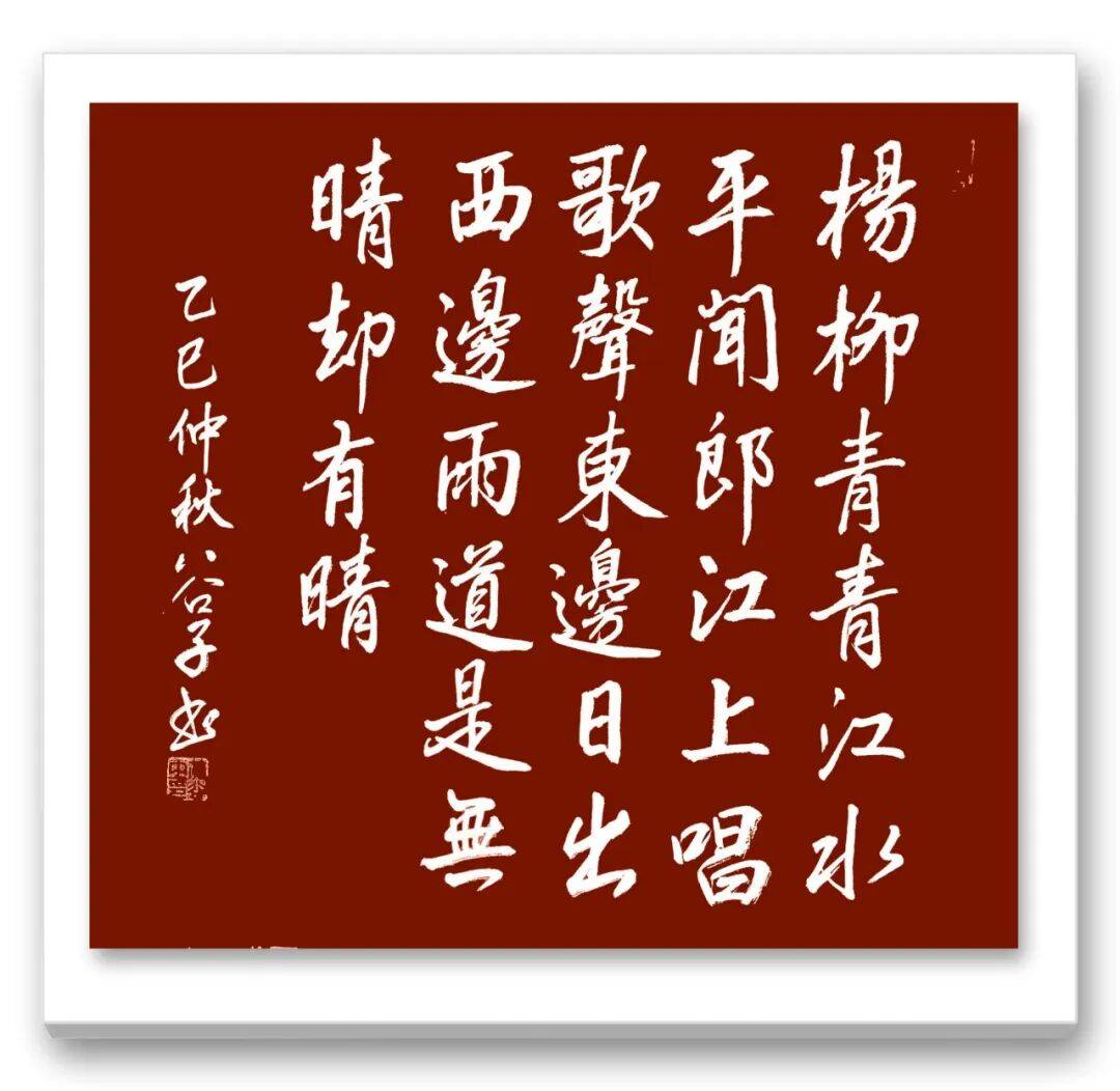 再看其书法的整体布局与章法。每一幅作品,字与字、行与行之间的疏密错落、大小变化,都经过精心的考量。红色的背景与白色(或金色)的笔墨形成强烈的视觉对比,既凸显了传统书法的庄重感,又带有鲜明的现代审美意趣。这种色彩与笔墨的搭配,并非简单的形式设计,而是与书法的内容、情感相呼应,营造出独特的艺术氛围。无论是斗方、条幅还是长卷,都能做到布局和谐,气韵贯通,让整幅作品宛如一首无声的乐章,有着起承转合的节奏与一气呵成的气势,给人以视觉与精神上的双重享受。