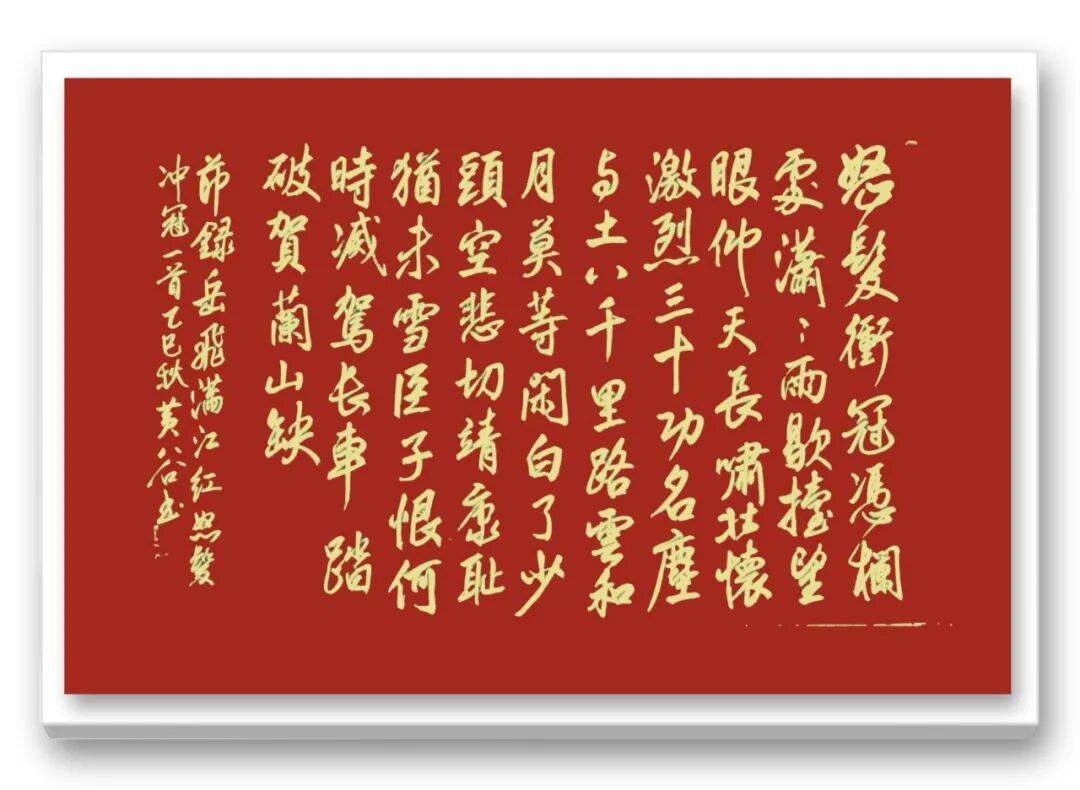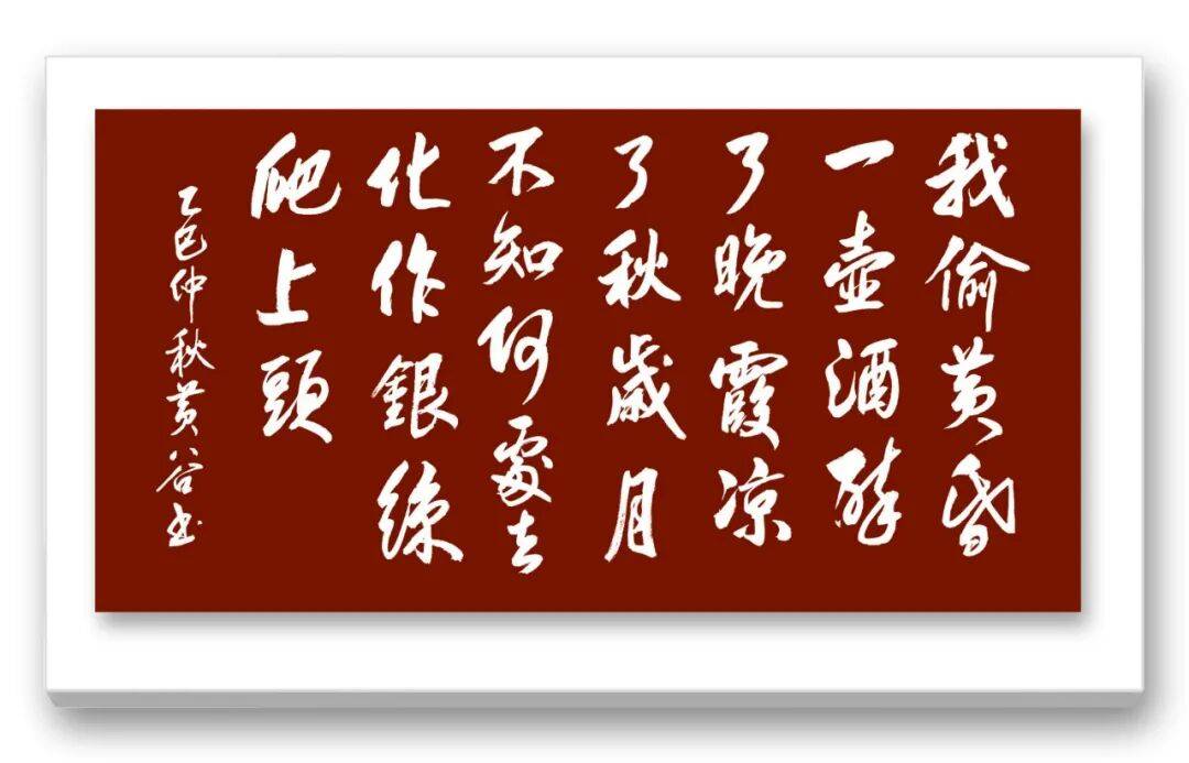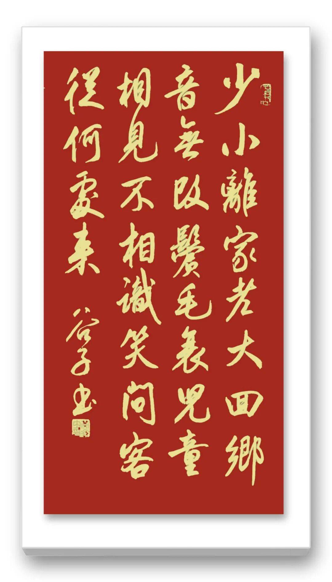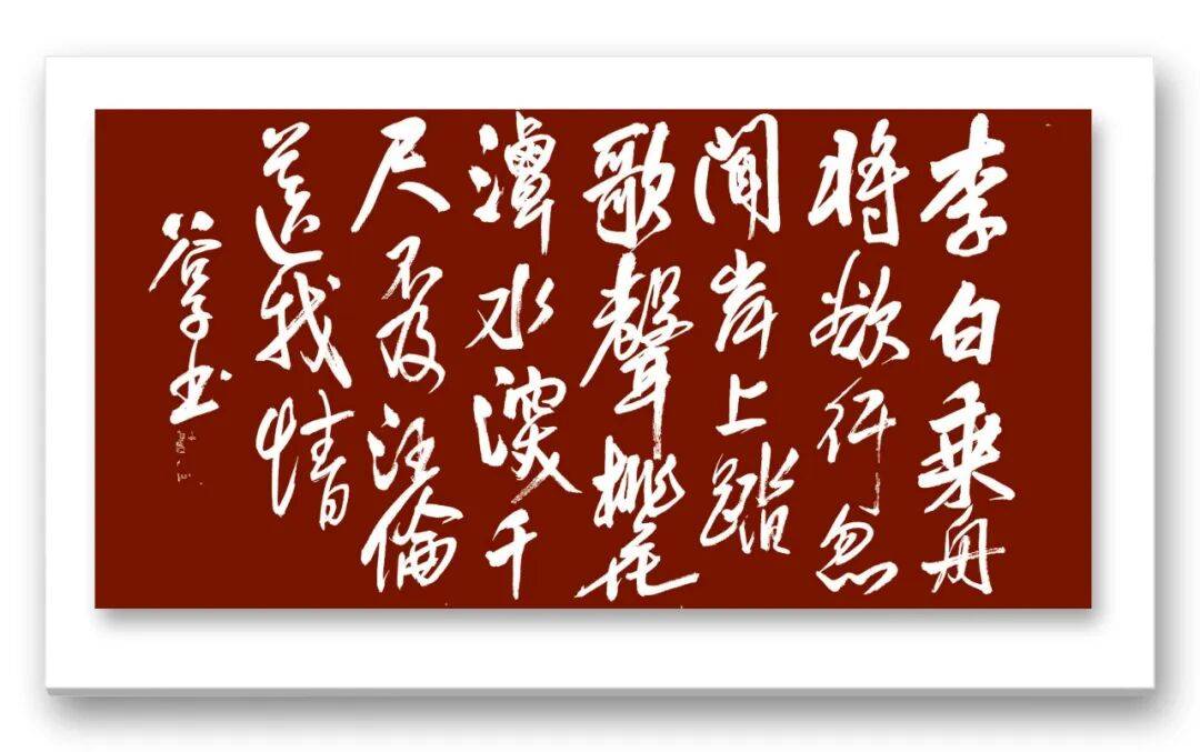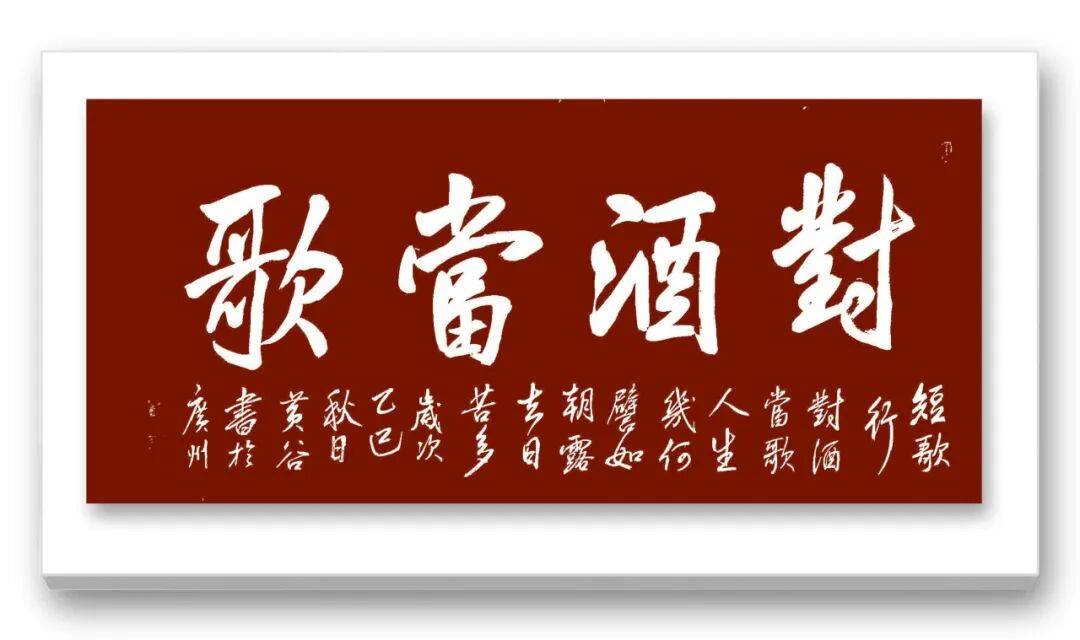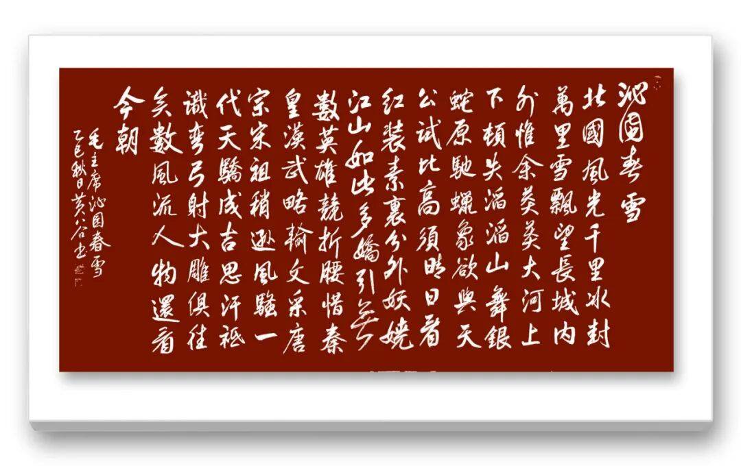 再看其书法的整体布局与章法。每一幅作品,字与字、行与行之间的疏密错落、大小变化,都经过精心的考量。红色的背景与白色(或金色)的笔墨形成强烈的视觉对比,既凸显了传统书法的庄重感,又带有鲜明的现代审美意趣。这种色彩与笔墨的搭配,并非简单的形式设计,而是与书法的内容、情感相呼应,营造出独特的艺术氛围。无论是斗方、条幅还是长卷,都能做到布局和谐,气韵贯通,让整幅作品宛如一首无声的乐章,有着起承转合的节奏与一气呵成的气势,给人以视觉与精神上的双重享受。