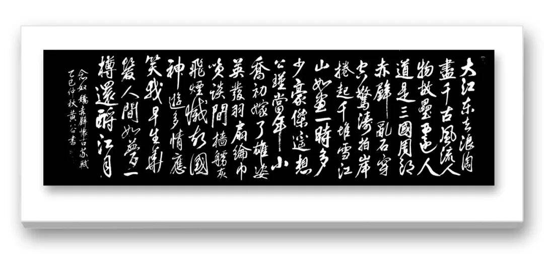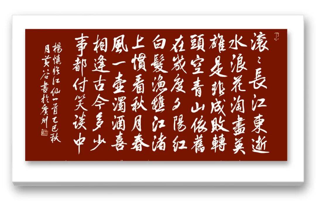 观黄谷老师的书法,首先被其笔墨的灵动性所吸引。其用笔,或如行云流水,畅达自然;或如锥画沙,力透纸背。在书写古典诗词时,那每一笔的起承转合,都仿佛与诗词的韵律节奏相契合。笔势随着词句的跌宕起伏而变化,“滚滚长江东逝水”的开篇雄浑,在笔墨中化作开阔的线条与厚重的力道,似长江浪涛奔涌而来;“古今多少事,都付笑谈中”的超脱,又以灵动、舒缓的笔调呈现,将历史的沧桑与豁达的情怀,通过笔墨的轻重缓急精准传达,让观者于字里行间,能深切感受到诗词的意境与情感在书法艺术中的二次绽放。