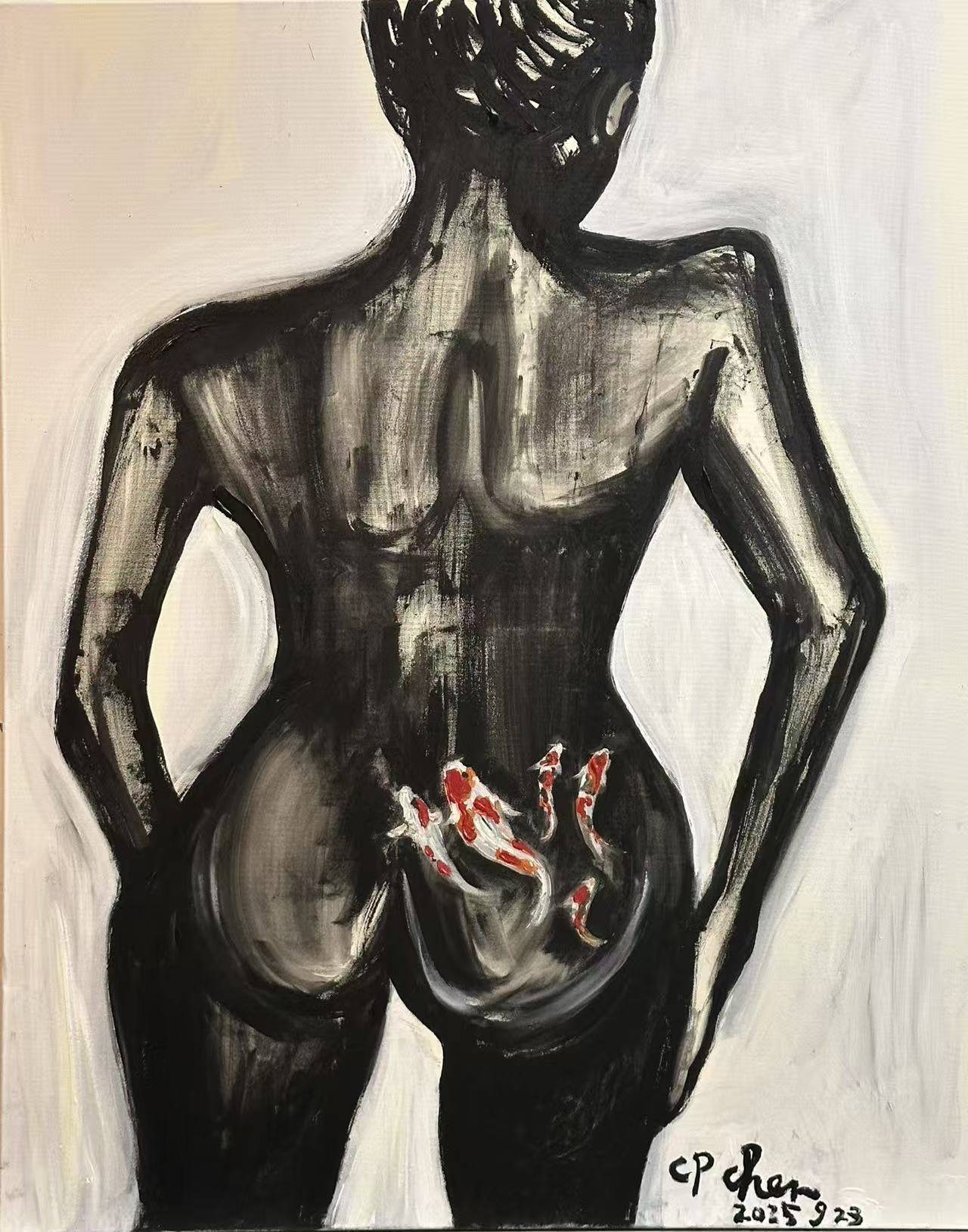 整体而言,《背影》这幅作品,以简洁而富有张力的画面,融合了具象的人体与象征的锦鲤,在黑白灰的沉静与锦鲤色彩的跃动之间,营造出一种既具视觉冲击力,又饱含思想深度的艺术氛围,让观者在欣赏的同时,不禁对生命、对文化产生更深的思索。