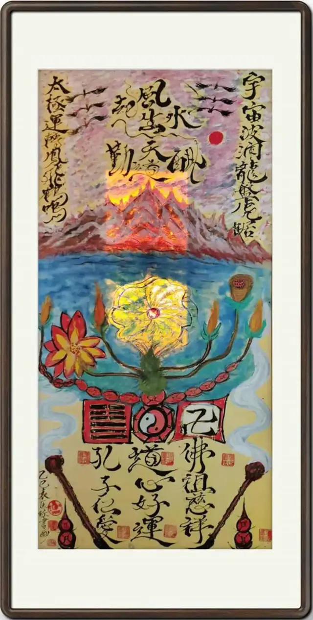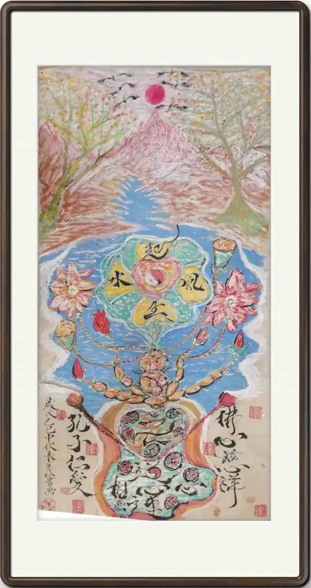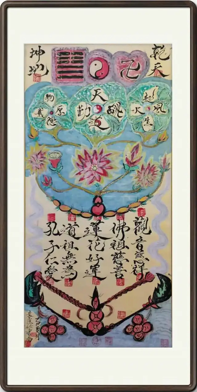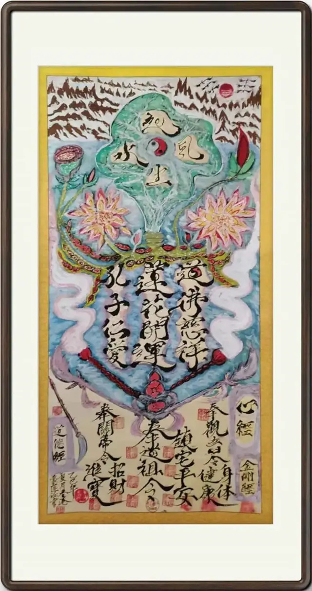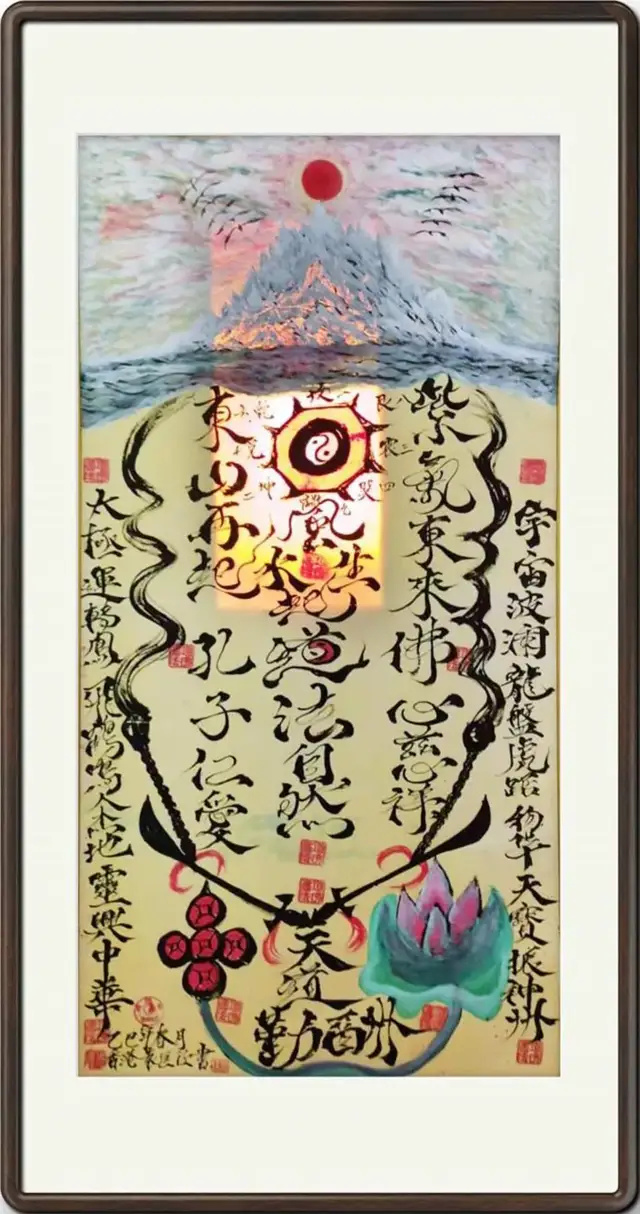 2025 年荣获意大利佛罗伦萨艺术学院书画展览金奖及纪念金盾。作品是孔道佛道符图腾风水能量书法,作品是《孔子仁爱,道佛慈祥》