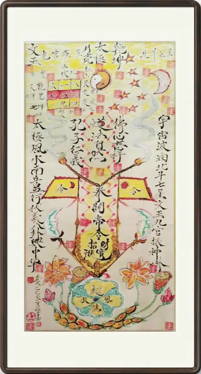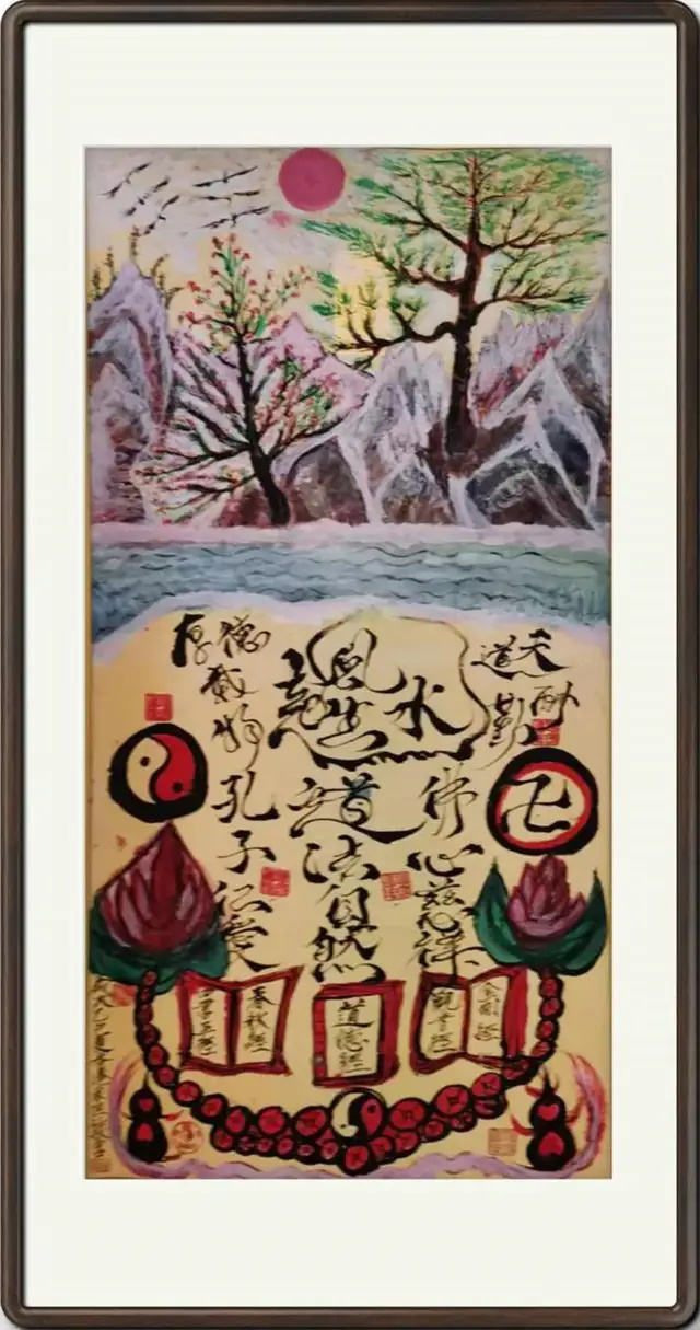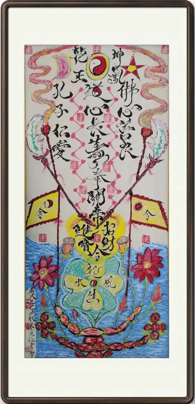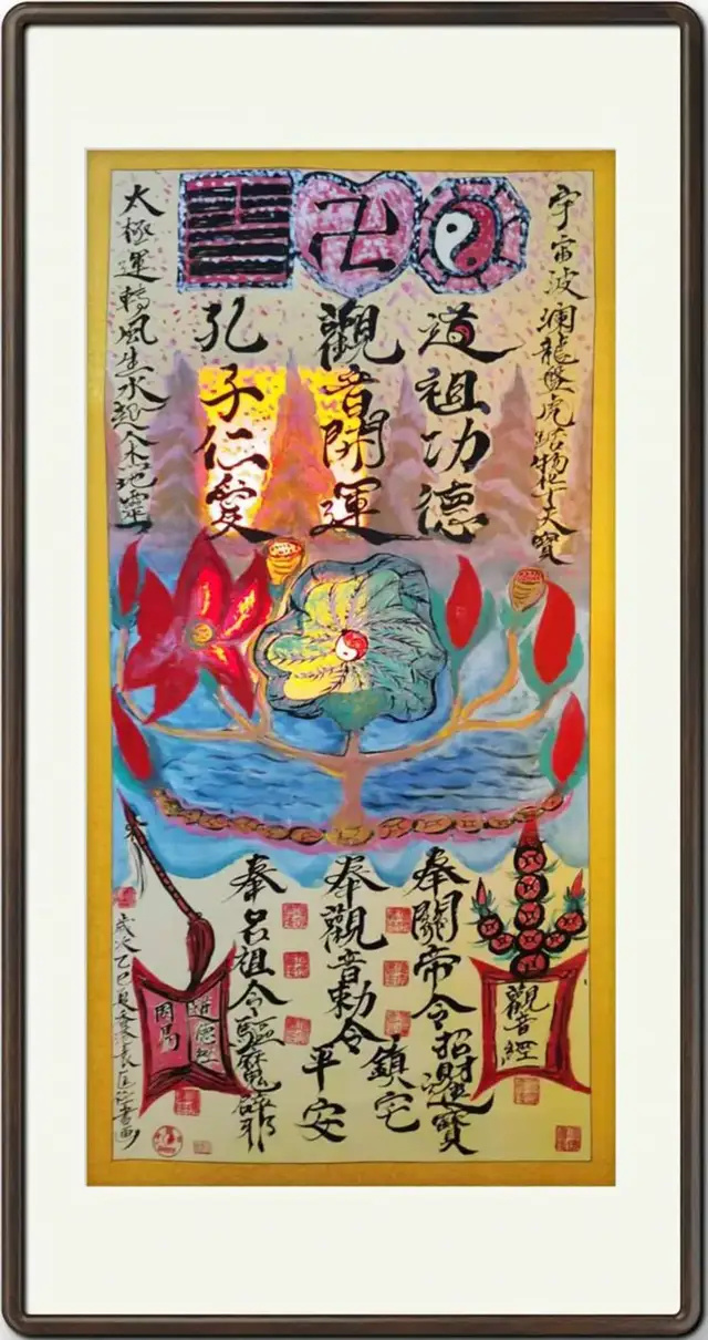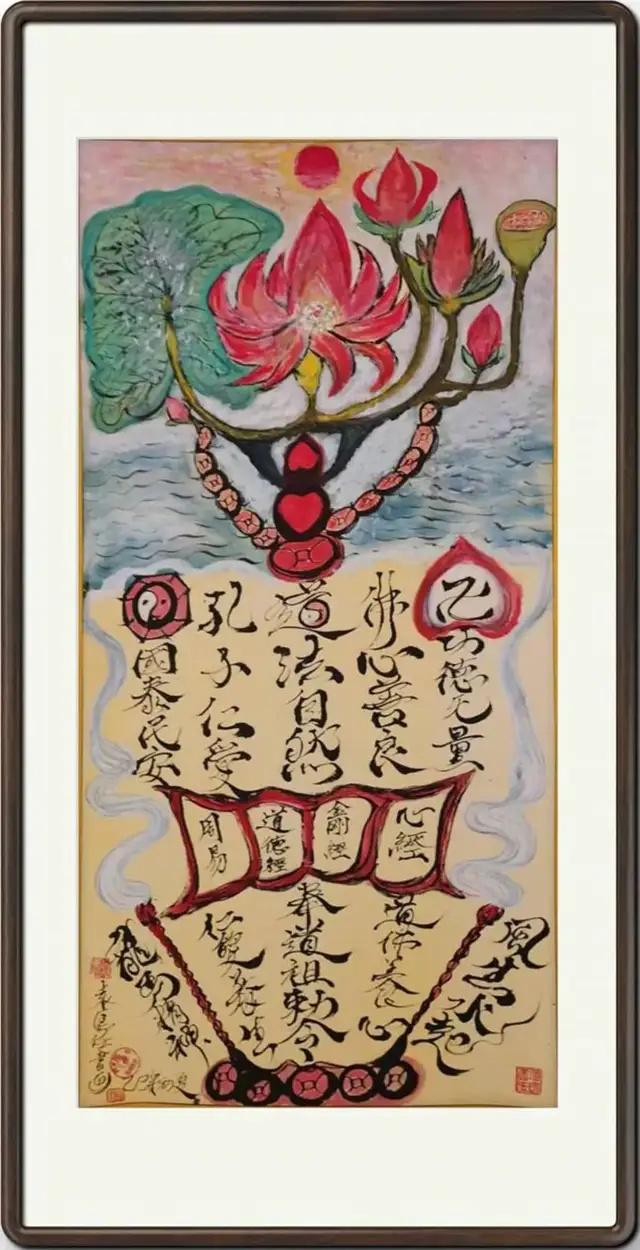 2025 年荣获意大利佛罗伦萨艺术学院书画展览金奖及纪念金盾。作品是孔道佛道符图腾风水能量书法,作品是《孔子仁爱,道佛慈祥》
