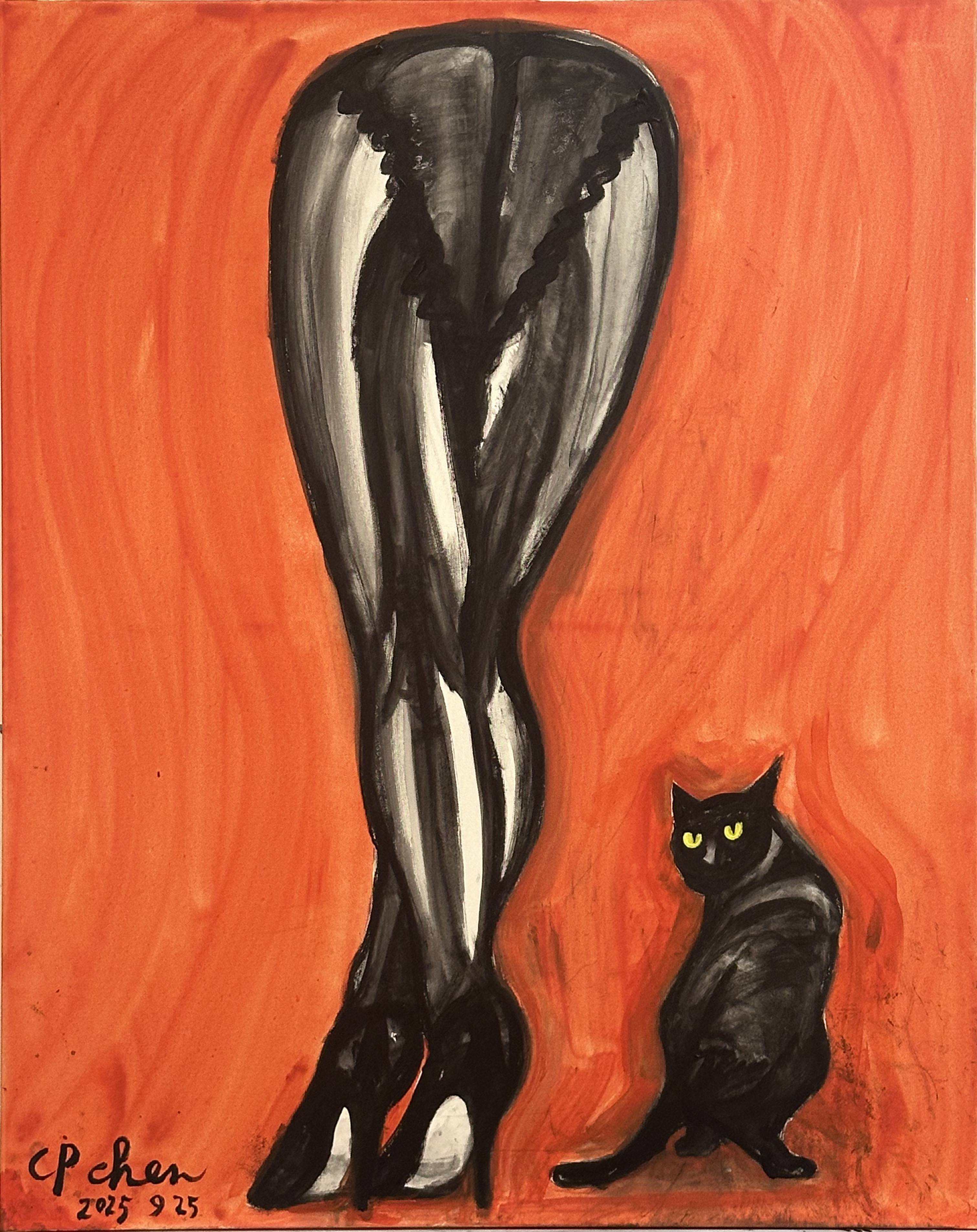 色彩的碰撞与符号的隐喻之外,陈持平教授的笔触也暗藏巧思:橙红色背景的流动感,与主体黑白色块的凝练感形成“动与静”的对话;丝袜、高跟鞋的柔,与黑猫眼神的锐形成“柔与刚”的交织。2025年9月25日的签名与日期,更让作品成为“特定时刻的情感切片”——彼时彼刻,教授对“美”的凝视、对“回望”的思考,都凝于笔端。