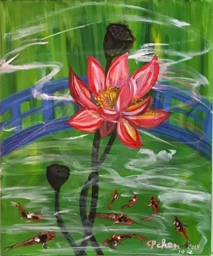在绘画作品里,能看到他对自然的细腻捕捉与诗意呈现。那幅展现“莫内的花园”意趣的画作,色彩明快而富有层次,花草、流水等元素在笔下灵动鲜活,仿佛将莫奈花园的光影与生机,以他独有的艺术语言重新诠释,营造出梦幻又充满诗意的氛围,尽显自然之美与艺术的交融。还有描绘天鹅在水中悠然姿态的作品,蓝色的水面如宝石般澄澈,天鹅洁白的羽毛与周围色彩斑斓的倒影相映成趣,静谧中透着灵动,传递出一种恬淡的自然之趣。绘有荷花、锦鲤与小桥的画面,更是充满东方意境,盛开的荷花娇艳欲滴,锦鲤在水中欢快游动,蓝色小桥横跨其间,把中式园林的雅致与生机展现得淋漓尽致,仿佛能让人嗅到荷香、听到水动。