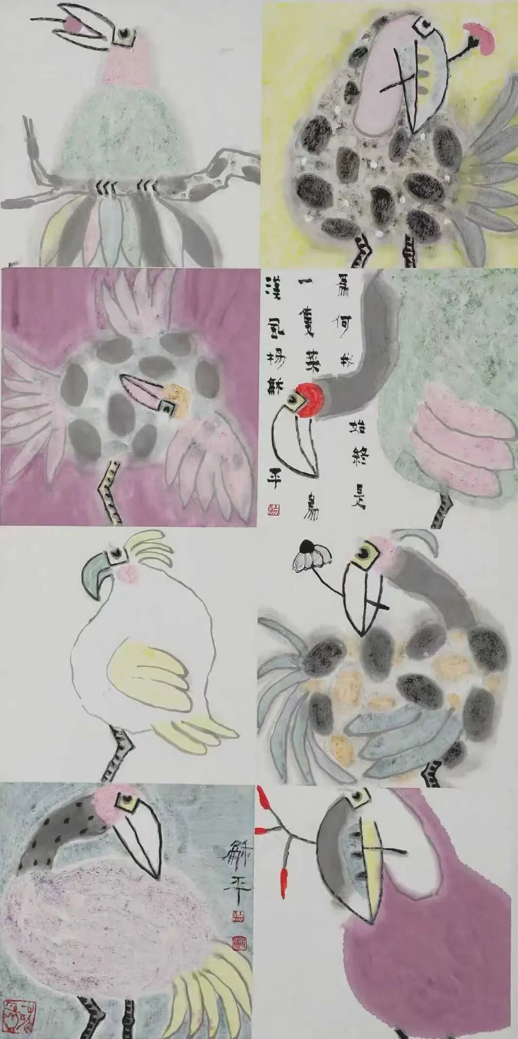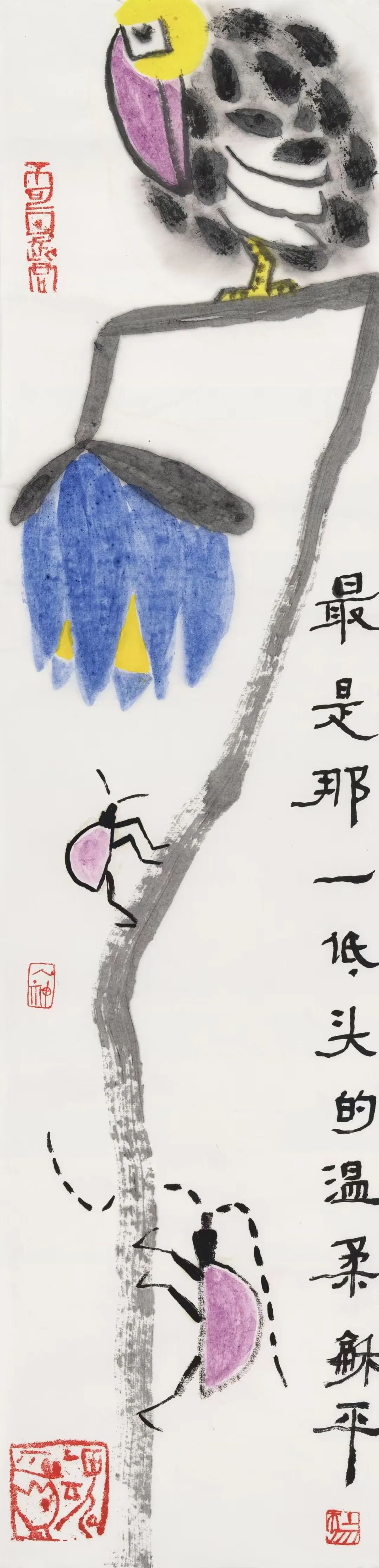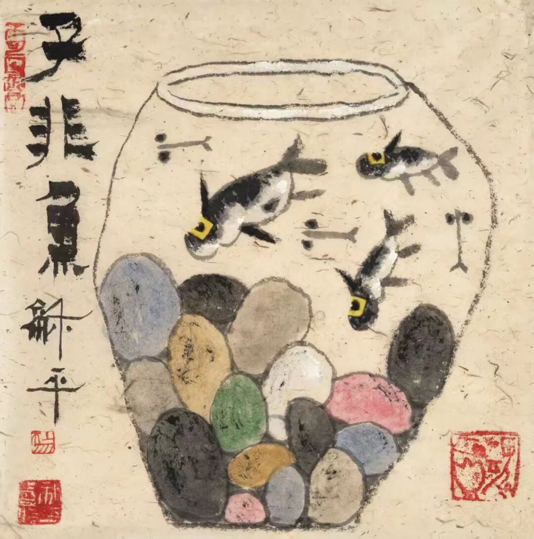 我的胸中逸气,就这样被散淡的、悠然的缓缓牵引出来,云蒸雾绕。恍然甦醒,原来是这些萧散简淡的水墨点染,以反俗于古雅的纷繁,率真而随意的,把住你的脉......淡然的、倔犟的;执着的、可有可无的;认真的、轻描淡写的;专注的、旁若无人的;禅味十足的、烟火世俗的.....浓彩的块和极简的线;虚化的安静与独立的狂狷;年轻的内敛和世故通达的归隐.....这样深刻的洞察力,用这样稚拙而筋道的水墨,举重若轻,在伪装的简简单单中,用孤独的清高和疏淡、用老辣而闲散的笔触,狠狠的刺你.....把我们心底种种的迎合和抵触、矛盾和挣扎、世故和率真....通通的通通的刺得粉碎,然后在至刚与至简的线条的扭曲和直立后、在至柔与至繁的用色的浓淡与沉浮后,全部简化,简化成自自然然后成熟的天真! 此画化人,若那只不善改变的腹若乾坤的淡定的鸟,会在画内蹓跶;会在画外安静;会随鱼平和;会回首诧异...,会化人的心,在虚实交接中腾挪,然后,忍不住的,顾盼生姿,思想发芽。这样被简简单单点拨着的人生,打着苞、开着花,孤傲的张扬。
