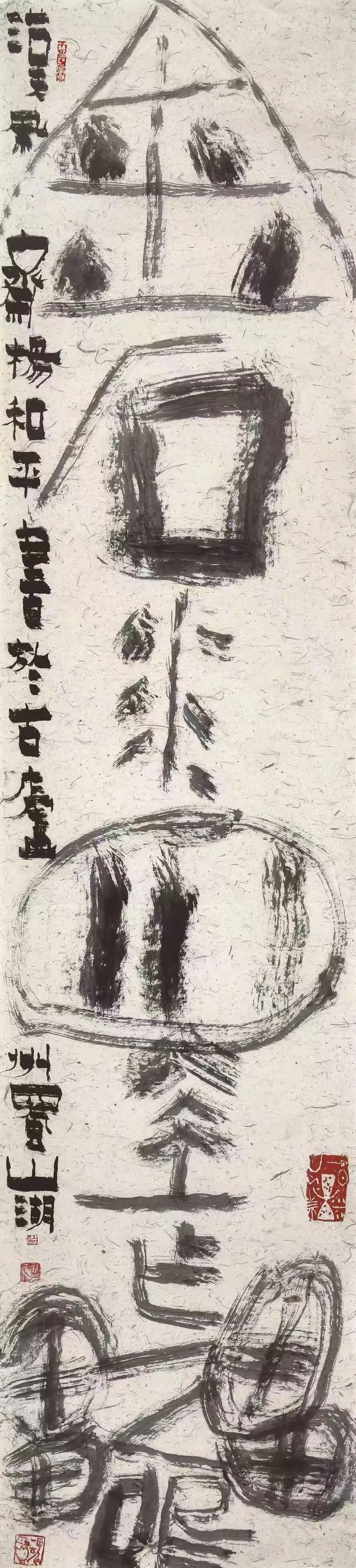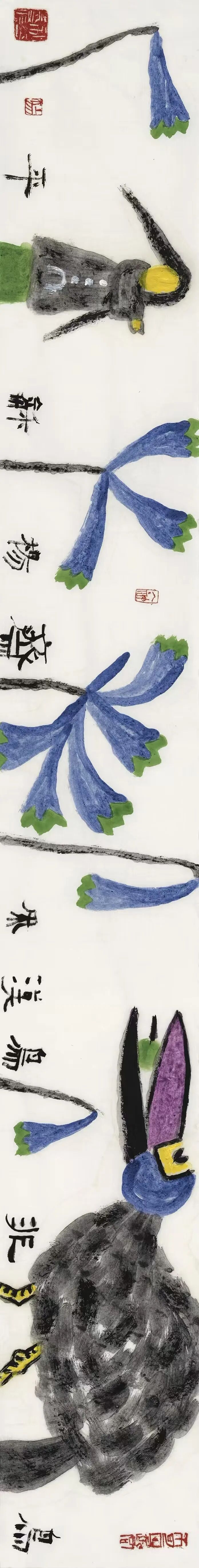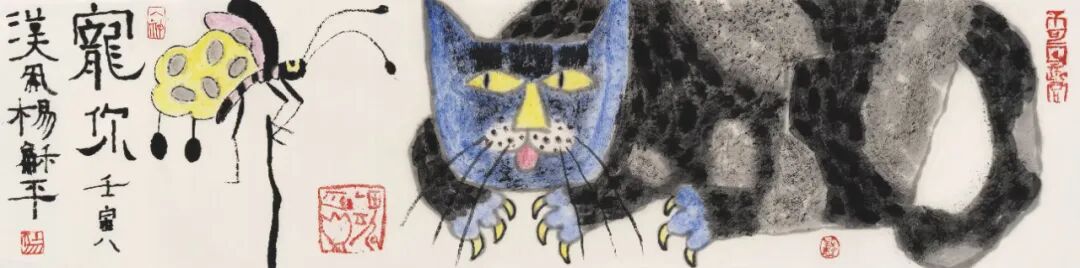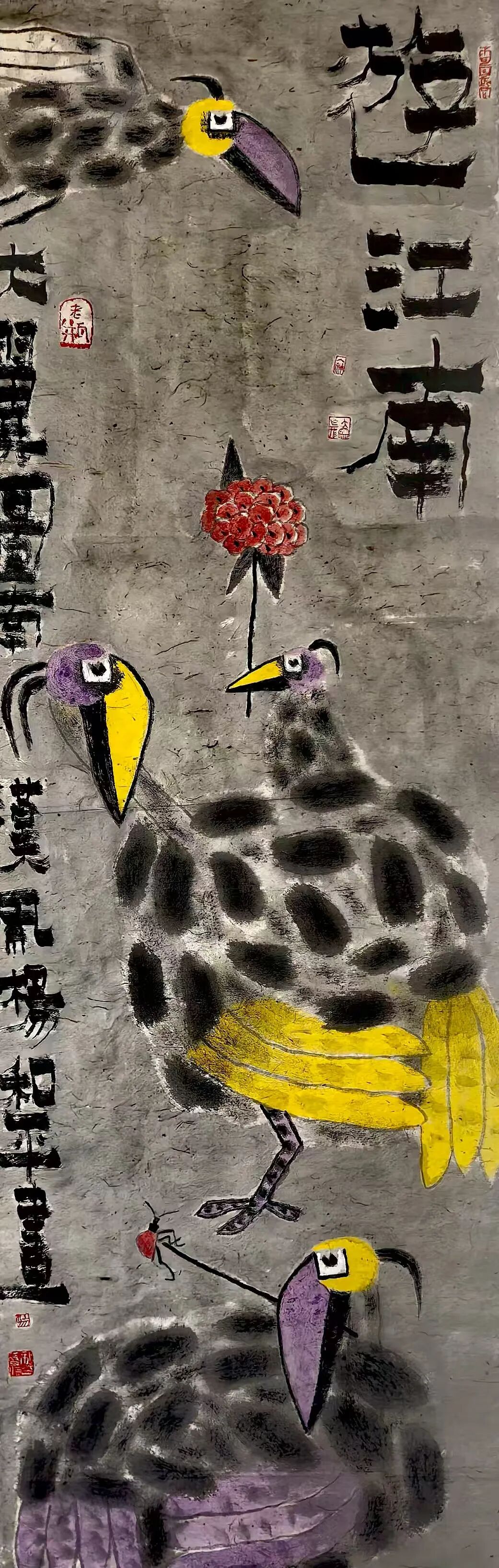 我的胸中逸气,就这样被散淡的、悠然的缓缓牵引出来,云蒸雾绕。恍然甦醒,原来是这些萧散简淡的水墨点染,以反俗于古雅的纷繁,率真而随意的,把住你的脉......淡然的、倔犟的;执着的、可有可无的;认真的、轻描淡写的;专注的、旁若无人的;禅味十足的、烟火世俗的.....浓彩的块和极简的线;虚化的安静与独立的狂狷;年轻的内敛和世故通达的归隐.....这样深刻的洞察力,用这样稚拙而筋道的水墨,举重若轻,在伪装的简简单单中,用孤独的清高和疏淡、用老辣而闲散的笔触,狠狠的刺你.....把我们心底种种的迎合和抵触、矛盾和挣扎、世故和率真....通通的通通的刺得粉碎,然后在至刚与至简的线条的扭曲和直立后、在至柔与至繁的用色的浓淡与沉浮后,全部简化,简化成自自然然后成熟的天真! 此画化人,若那只不善改变的腹若乾坤的淡定的鸟,会在画内蹓跶;会在画外安静;会随鱼平和;会回首诧异...,会化人的心,在虚实交接中腾挪,然后,忍不住的,顾盼生姿,思想发芽。这样被简简单单点拨着的人生,打着苞、开着花,孤傲的张扬。