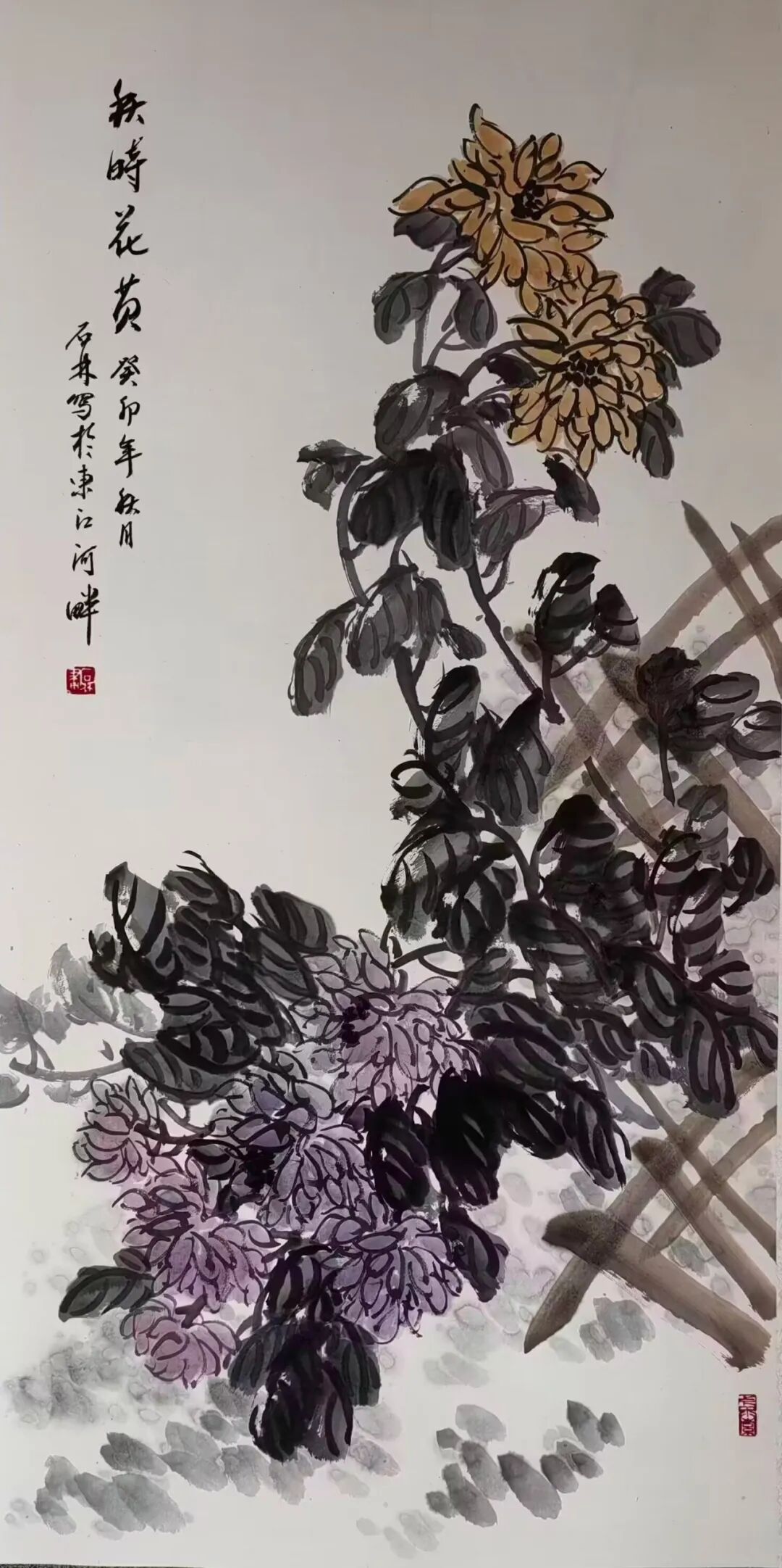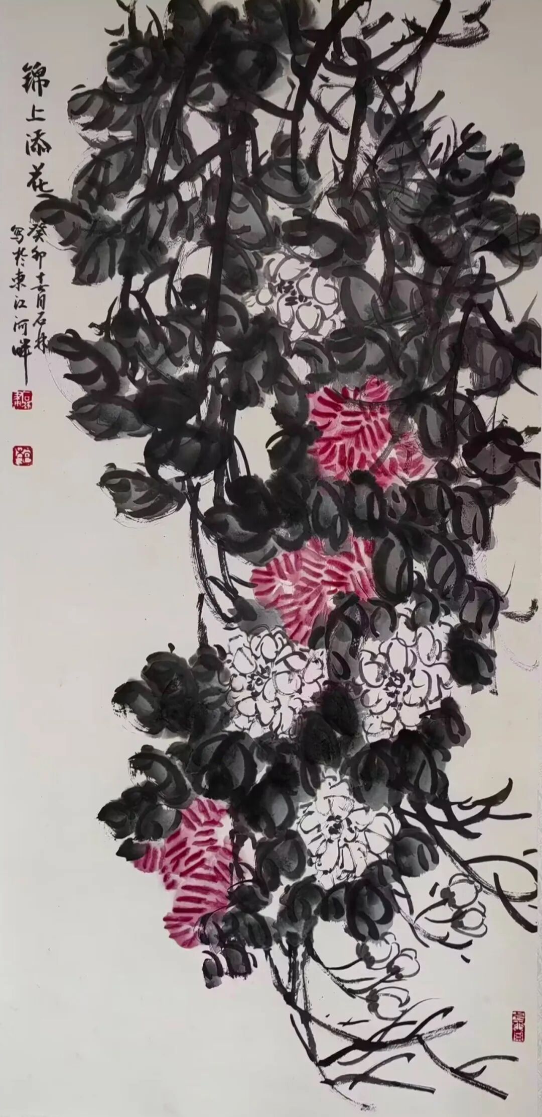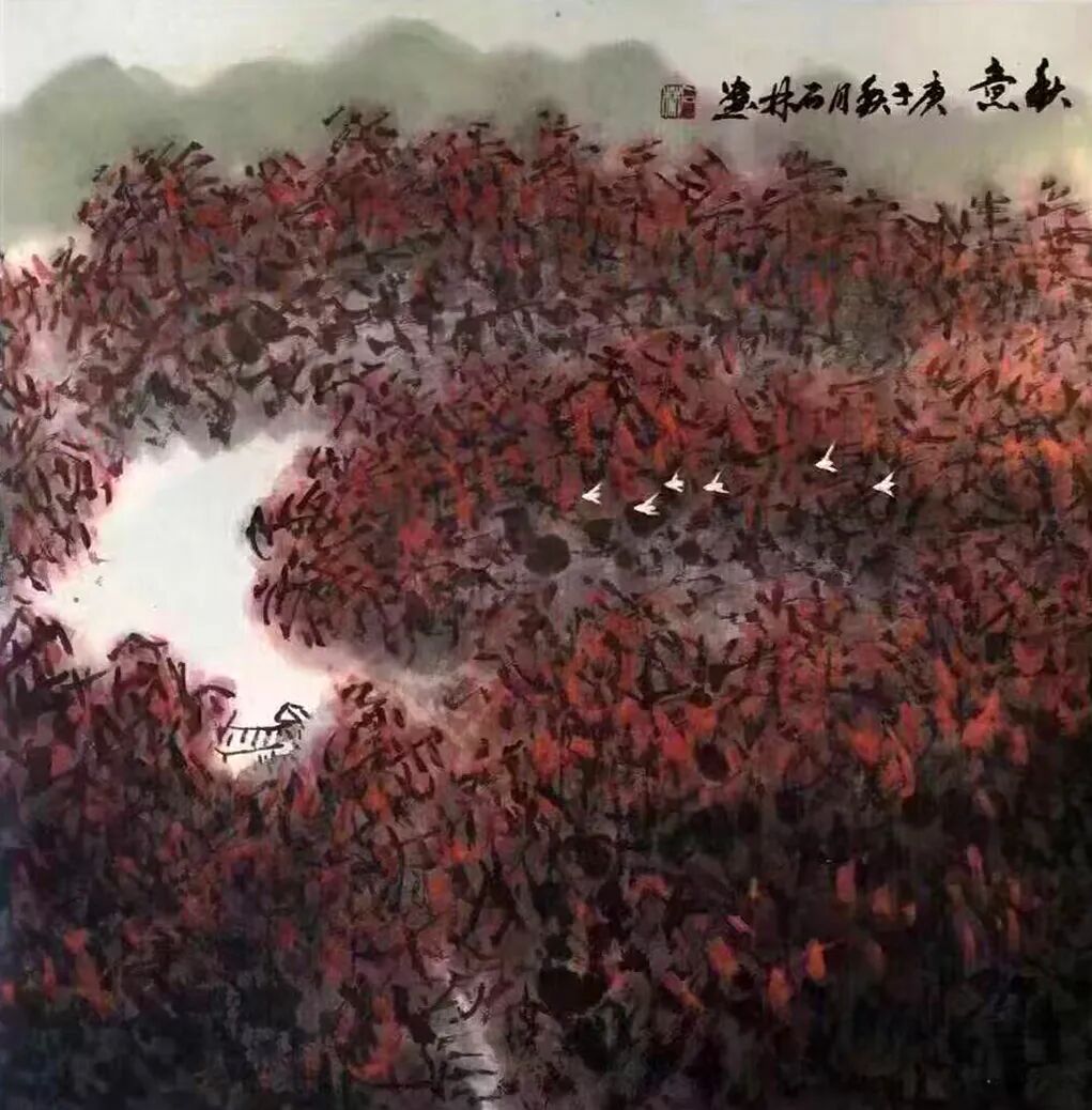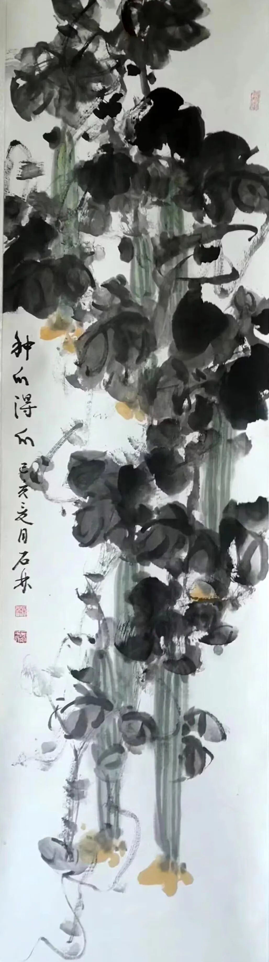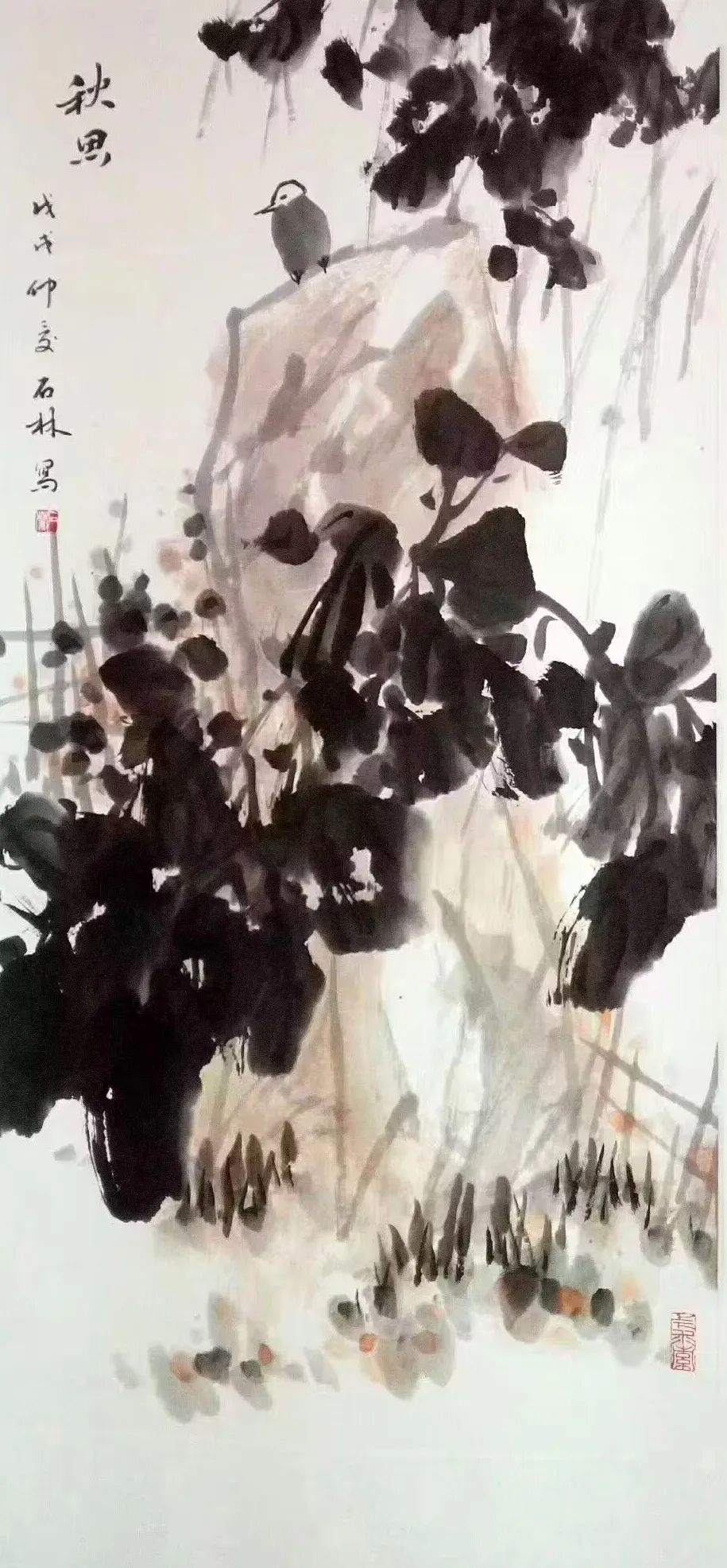 转观薛一先生的花鸟作品,则另有一番生机勃勃的艺术气象。他的花鸟画深得中国文人画"缘物寄情"之真谛,却又赋予其当代的生命感悟。那些摇曳的竹枝,既让人想起郑板桥"一枝一叶总关情"的诗意,又展现出独特的时代气息;那些嬉戏的游鱼,既蕴含着庄子濠梁观鱼时的哲思,又洋溢着现代人的生活情趣。在《秋思》《锦上添花》等代表作中,我们可以感受到艺术家对生命本质的深刻理解。薛一先生的花鸟从不停留在简单的形似模仿,而是通过最简练的笔墨,传达最丰富的生命信息。在他的笔下,一草一木皆具性情,一虫一鸟皆有灵魂,寥寥数笔却是满纸生机。这种艺术境界的达成,不仅需要精湛的技艺,更需要深厚的人文素养和对生命的独特感悟。