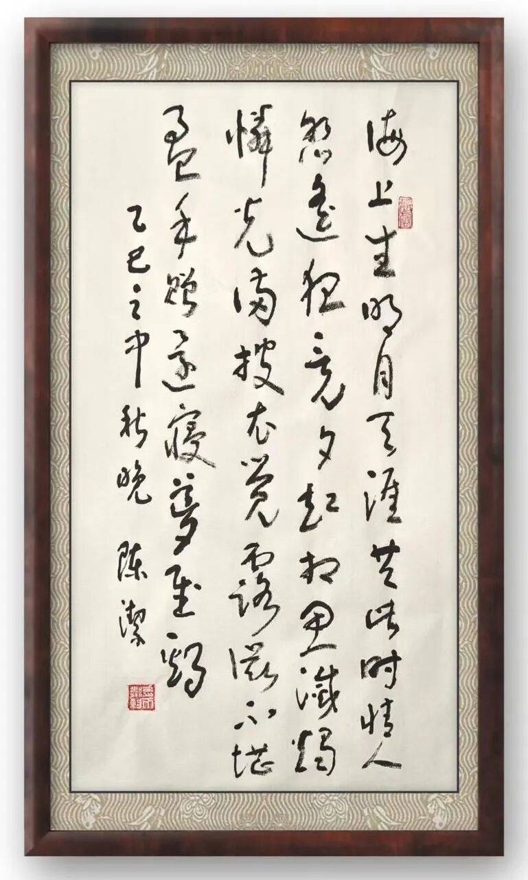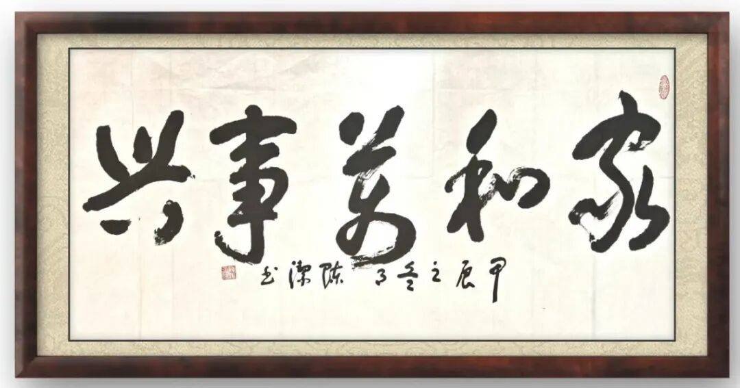 如今再细品先生书作,方知他早已参透书法真谛:千古笔法的精髓已融入血脉,技法的娴熟只是基石,情怀的抒发才是灵魂。笔墨于他,既是 “技” 的展现,更是 “情” 的寄托 —— 写 “家和万事兴” 时,笔力沉雄似扛鼎,藏着赤子之心;书 “云海松涛” 一词时,笔调温婉如流水,含着诗意柔情。这般技能与情怀交融的大家风范,正是当代书法艺术最珍贵的模样,陈洁先生,无愧为这一领域的杰出标杆。