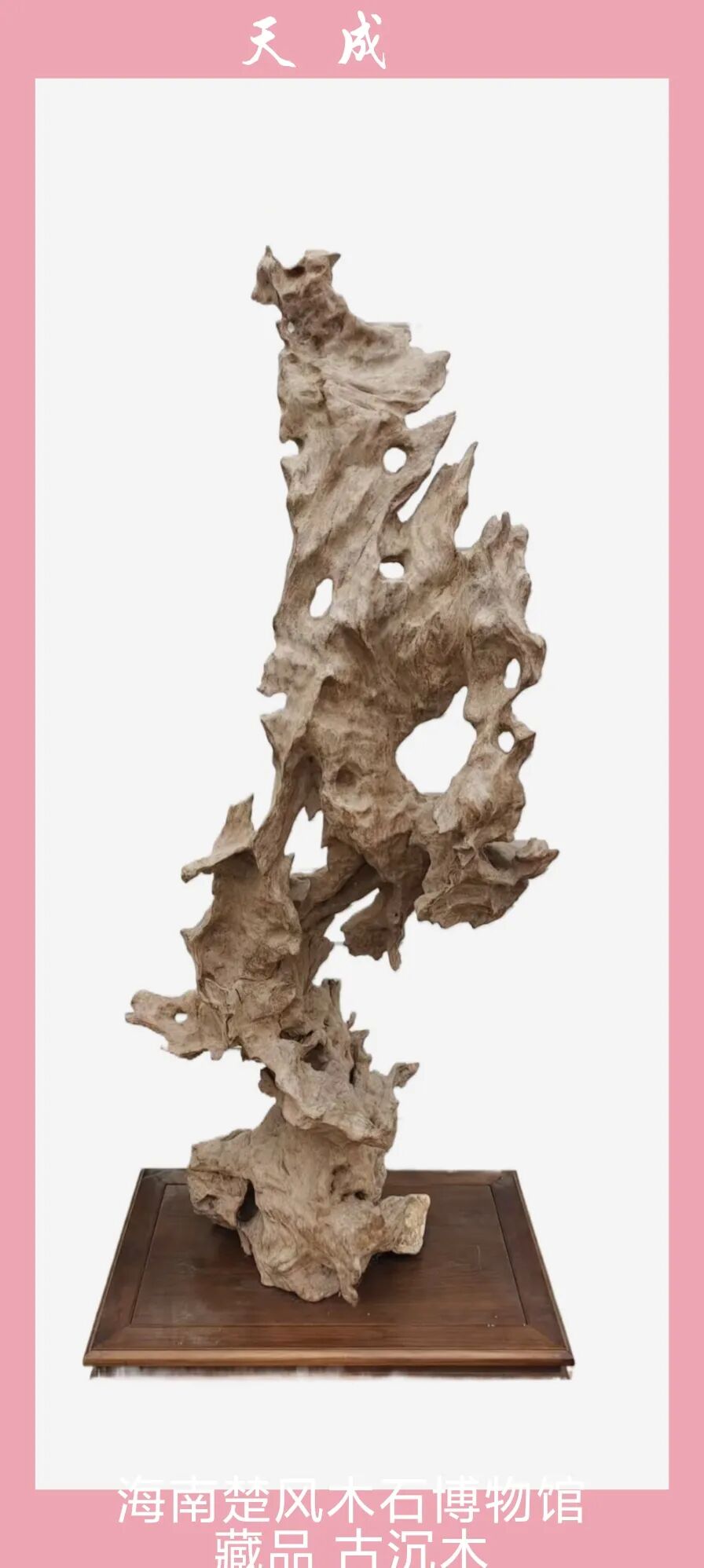注:此作出自海南的母亲河南渡江,天然古沉木,未动一刀一剪。2015年曾参加第二届海南省艺术节根雕艺术作品展,荣获省政府颁发银奖。