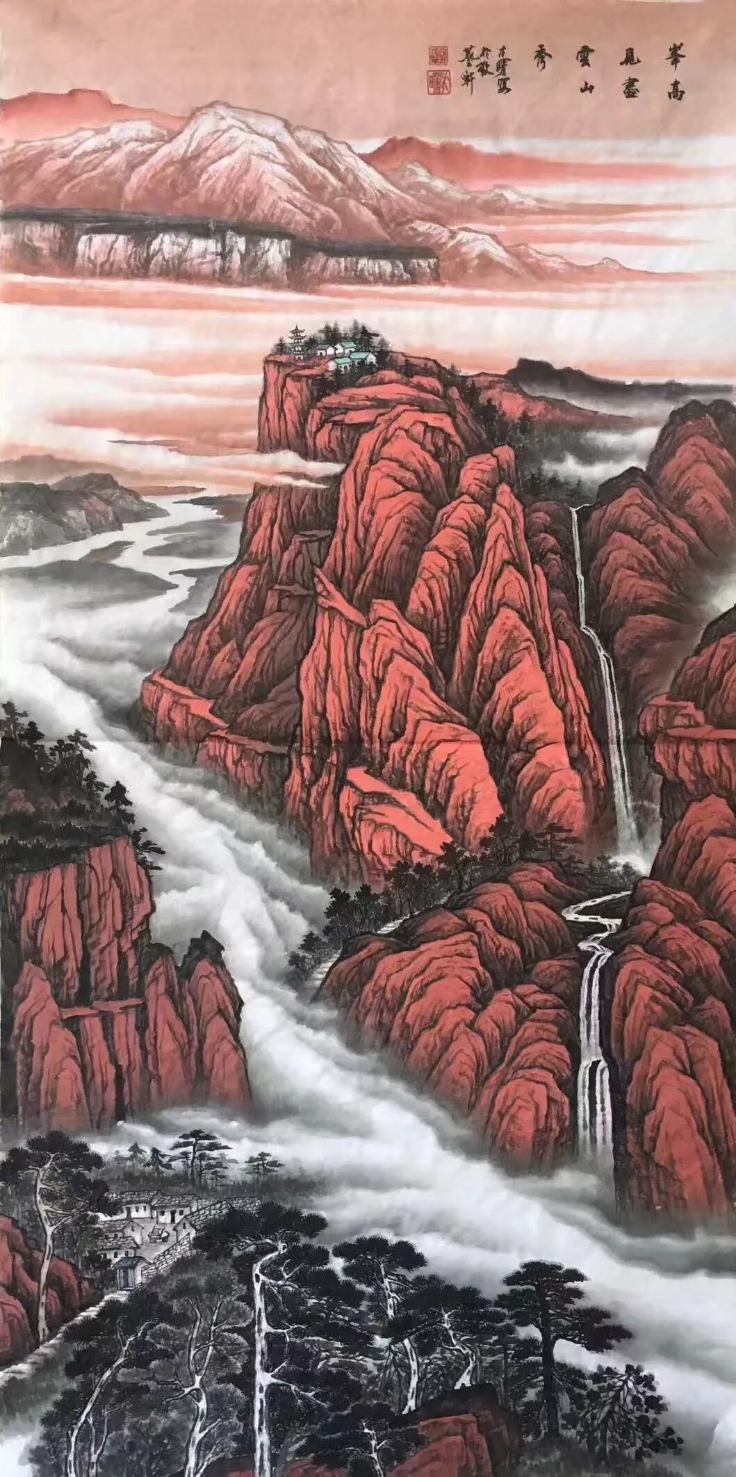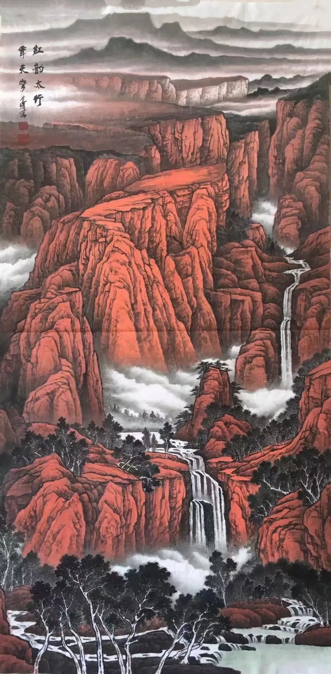 在布局构图上,刘明亮的技法同样卓越,令人叹为观止。其作品多采用全景式构图,主次分明:主峰居于画面中心,突出雄伟壮观;次峰则以不同形态、大小依次展开,呈众星拱月之势,既富秩序感,又具节奏感,尽显大自然的宏大气象。运墨方面,远处山峦以淡墨、淡彩为主,仿若云雾缭绕,朦胧飘渺;近处的树木、山石则浓墨重彩,更显逼真。如此虚实结合,意境深远而唯美。