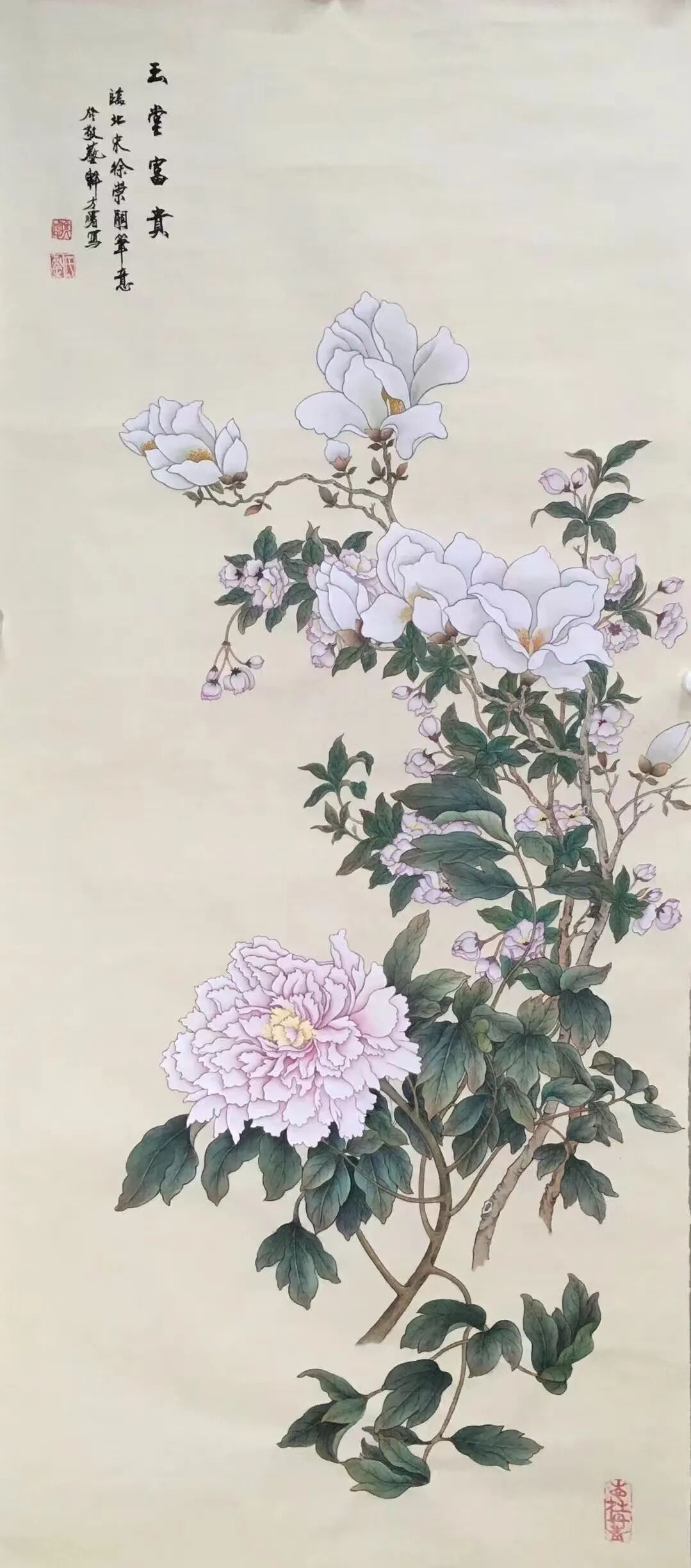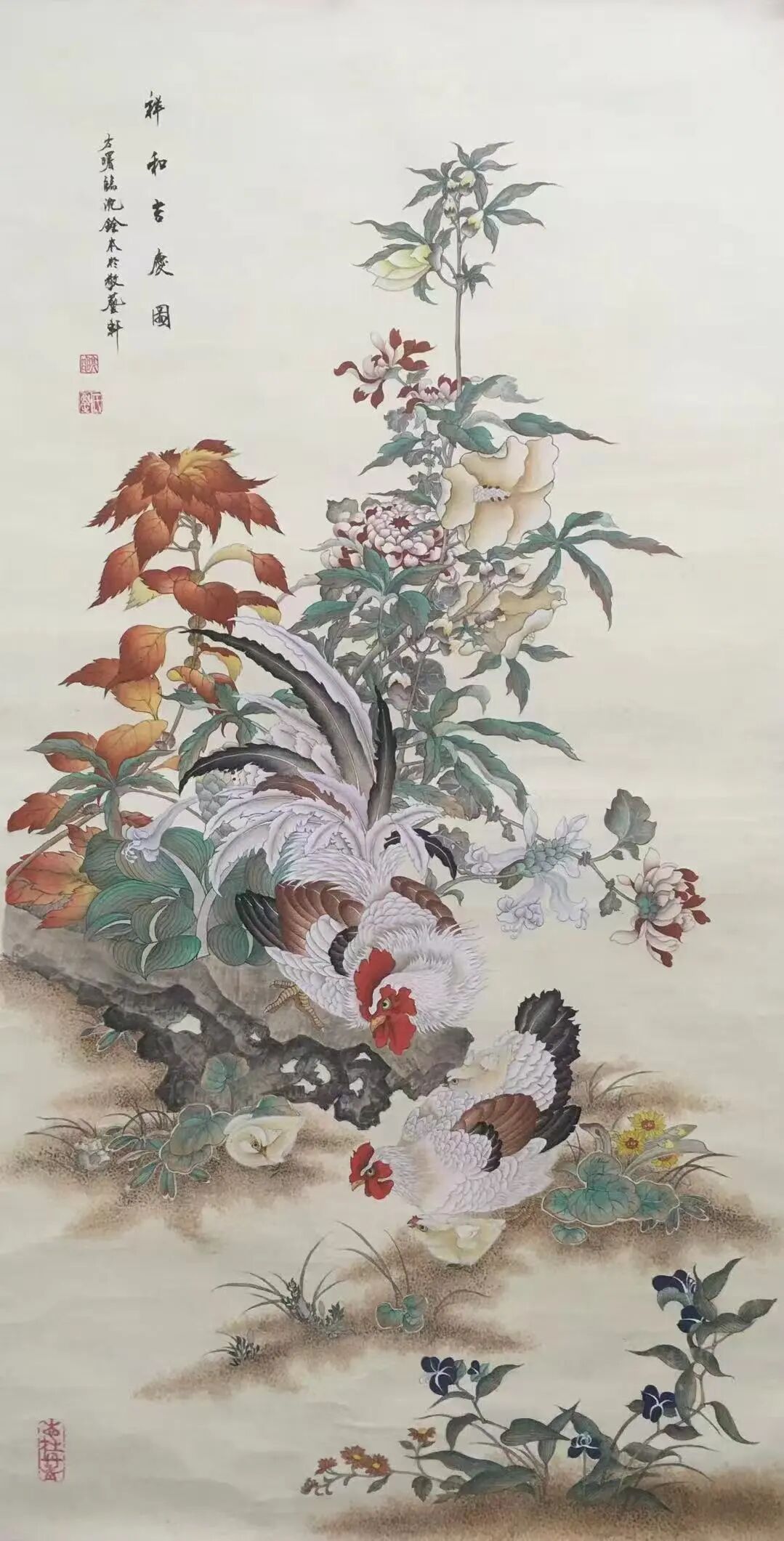 细细品味画中的色彩,绝非简单的平铺直叙,而是运用多种技法实现了“浓淡、干湿、虚实”等层次变化,立体感极强。观其山峦,以“石青、石绿”为主色调:山体受光面多以明亮的石绿为主,凸显阳光的明媚;背光面则用深沉的石青,强化山峦的厚重感,展现雄浑壮丽之势。除青、绿二色外,“赭石、朱砂”等暖色亦点缀其间,既丰富了画面色彩,又避免了单调,令冷色调为主的画面平添几分温情。