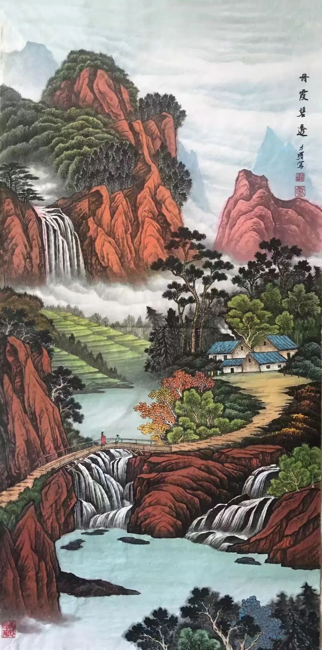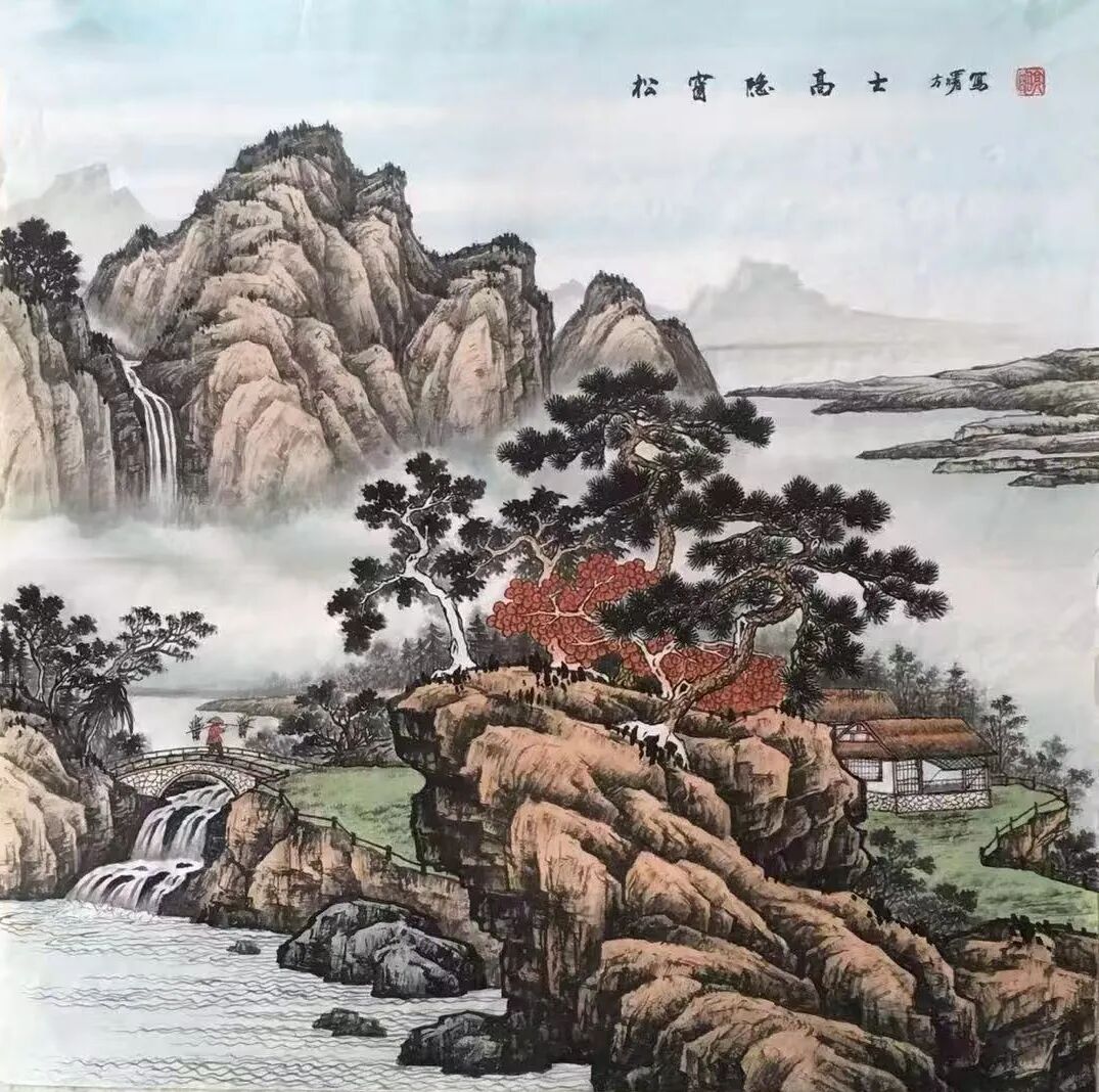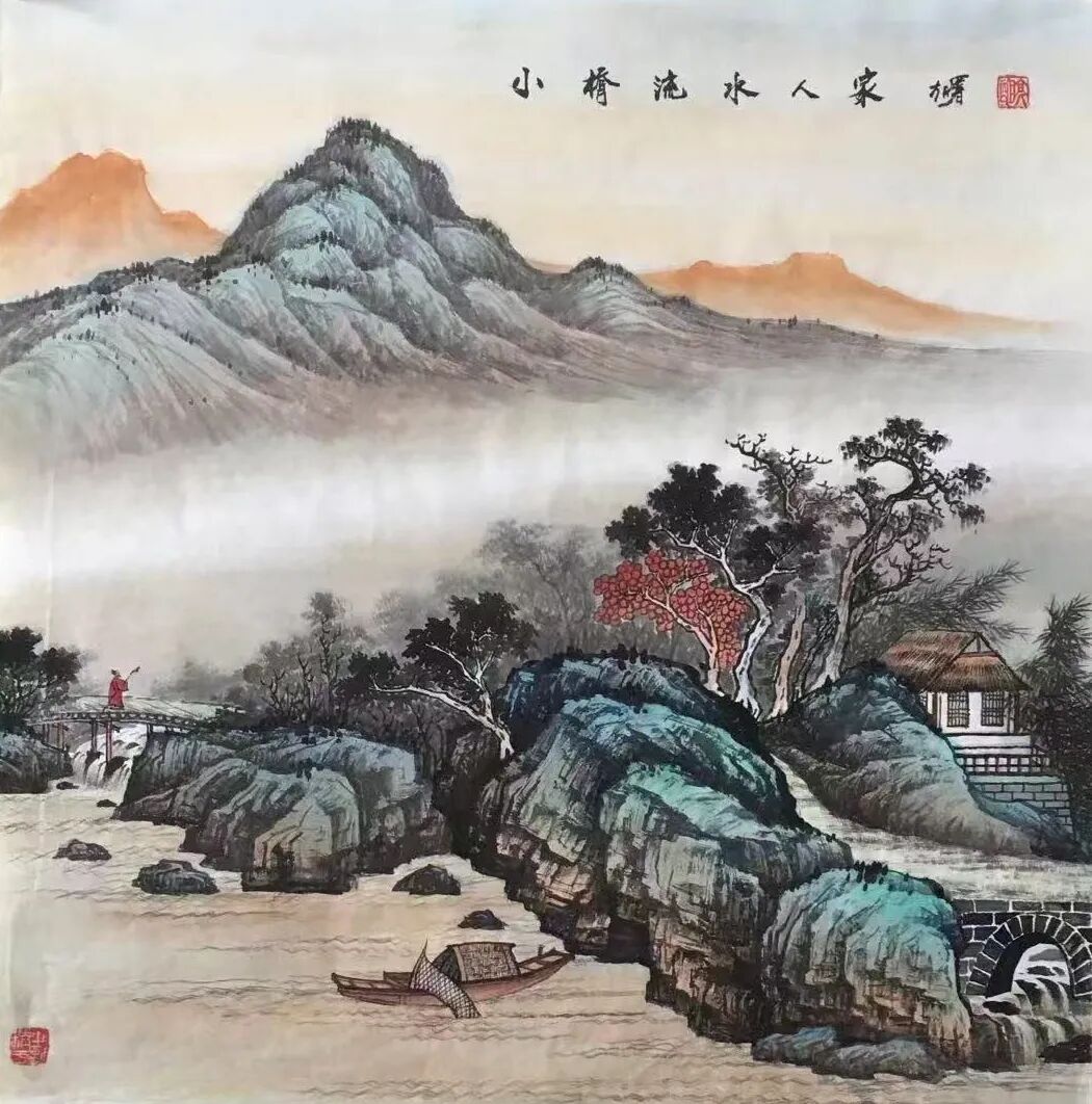 上述特色在《小桥流水人家》中体现得淋漓尽致。作品中,他以细腻笔触描绘出“绿树村边合,青山郭外斜”的田园生活场景。观者面对画中远近高低各不同的云雾、山峦、树木、小桥,既对大自然的宏大与深邃心生敬畏,又对寻常人家与世无争的怡然自得心向往之。