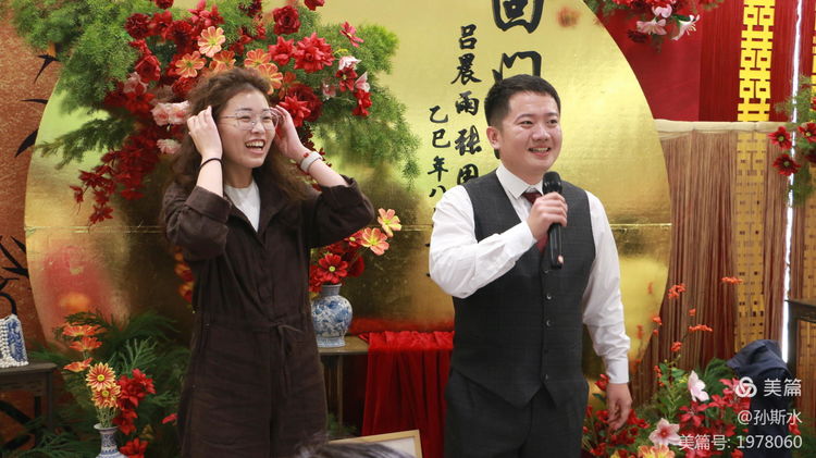 新娘吕晨雨温柔地向乡亲们介绍新郎张国瑞,两人共同深深鞠躬,以表对所有亲朋好友的诚挚谢意。
