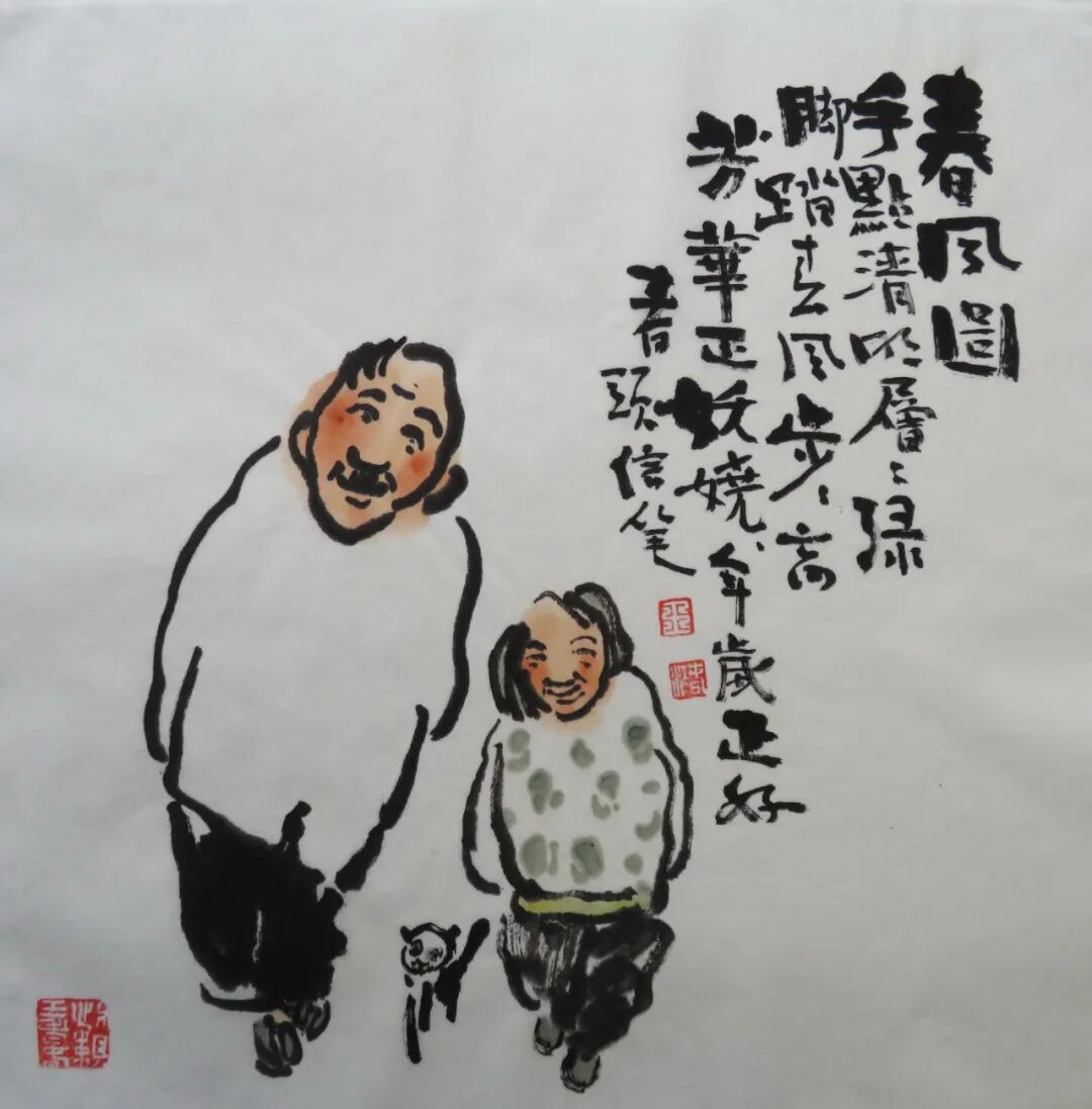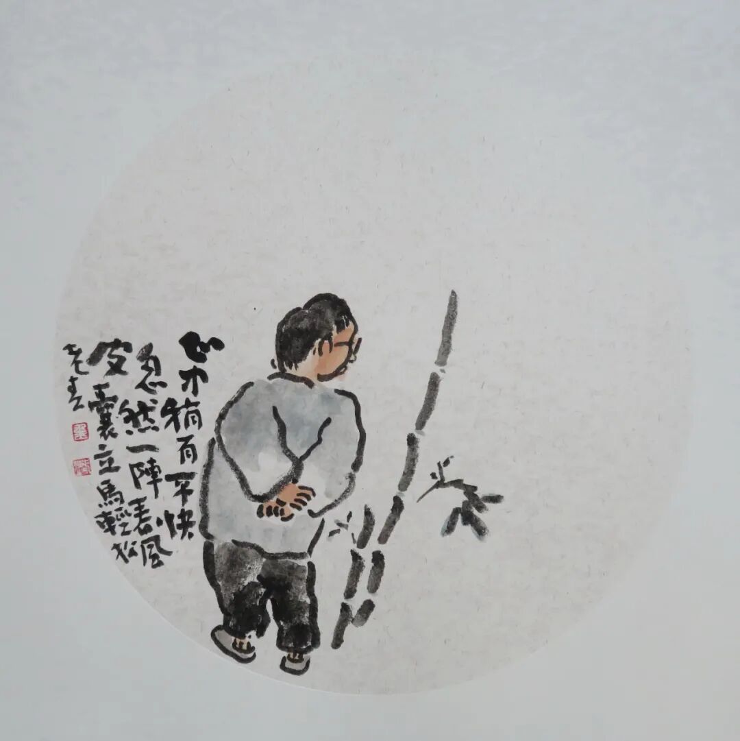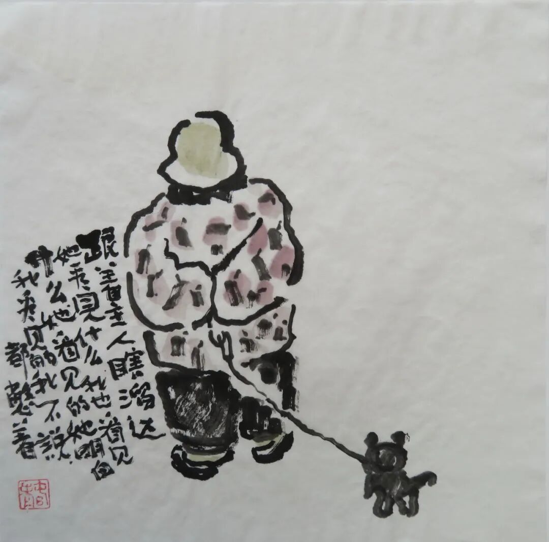 王春江的艺术语言具有鲜明的辨识度。在《观鱼图》《春风图》中,我们看到他对传统笔墨的娴熟驾驭,线条流畅自如,墨色浓淡有致,构图留白得当,展现出不俗的传统功底。然而,他的创新之处在于将这种传统技法从高山流水、梅兰竹菊的古典题材中解放出来,转而描绘送孩子上学的匆忙(《奔学图》)、点钱的困惑(《点钱图》)、遛弯的闲适(《遛弯图》)等当代生活场景。这种题材的平移并非简单的形式转换,而是水墨语言当代化的一种积极探索,使古老的艺术形式与当下的生活经验产生了有机连接。