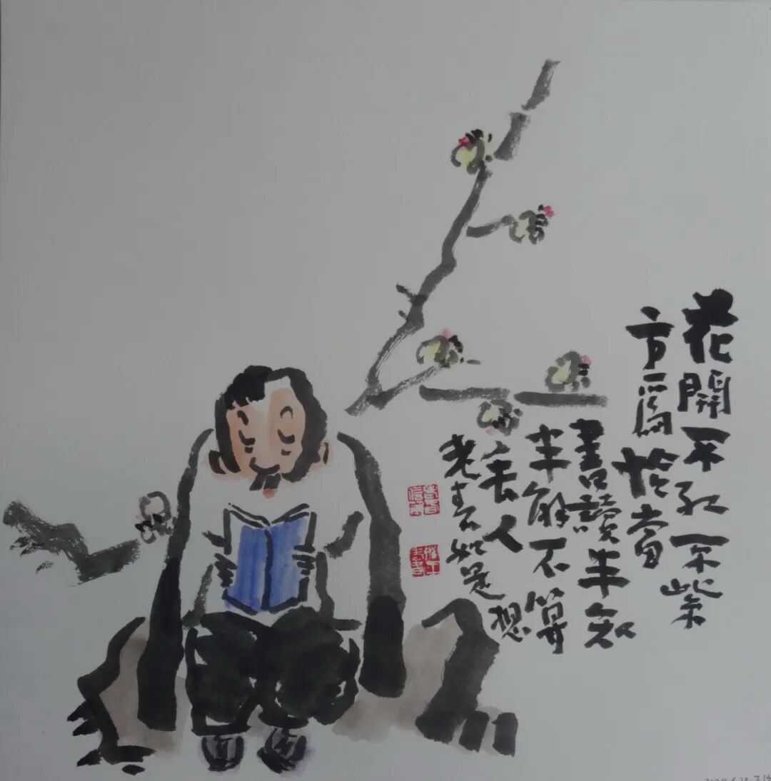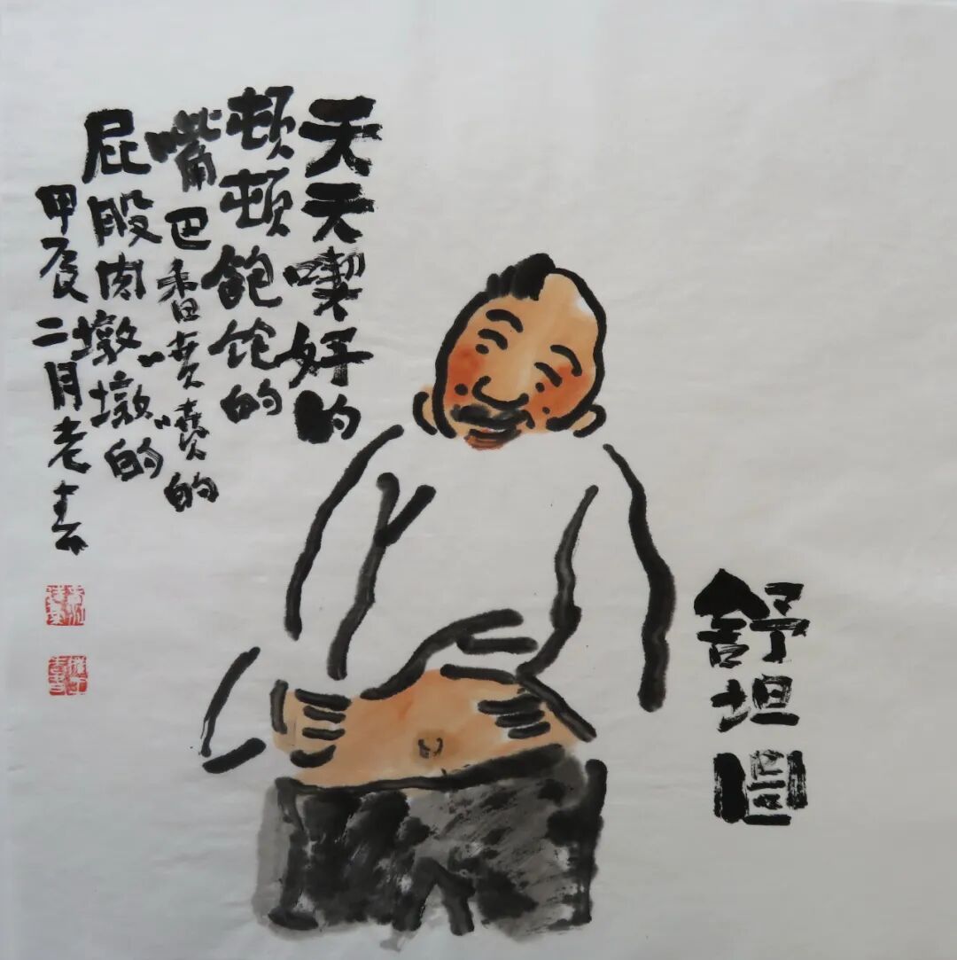 题跋在这些作品中扮演着画龙点睛的角色。王春江的题跋语言独具特色,既有“壮怀激烈去看海,了无挂碍来观鱼”的诗意,也有“薪水年年涨,咋就不敢花”的俚俗;既有“花开不红不紫方为恰当,书读半知半解不算丢人”的通达,也有“天天吃好的,顿顿饱饱的”的直白。这种文白夹杂、雅俗共融的语言风格,打破了传统题跋的雅正规范,创造出一种亲切、生动且富有生命力的文本空间。题跋与图像相互生发,共同构建作品的完整意蕴,延续并革新了中国画的“诗书画一体”传统。