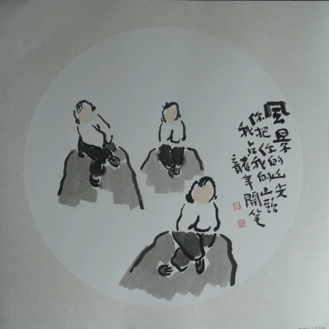 《背影图》的题跋:“不是所有的背影/都是可以转身回头的/有的无力/有的无奈/有的无脸/有的无需”,展现出王春江艺术中的另一维度——对生命困境的深刻洞察。他从不过度美化生活,而是诚实面对其中的种种尴尬、困惑与无奈。《点钱图》中对经济压力的调侃,《奔学图》中对育儿艰辛的感叹,都让他的艺术带有一种温暖的现实主义色彩。这种既不回避生活粗粝,又能从中提炼智慧的态度,使他的作品获得了深厚的人文关怀。