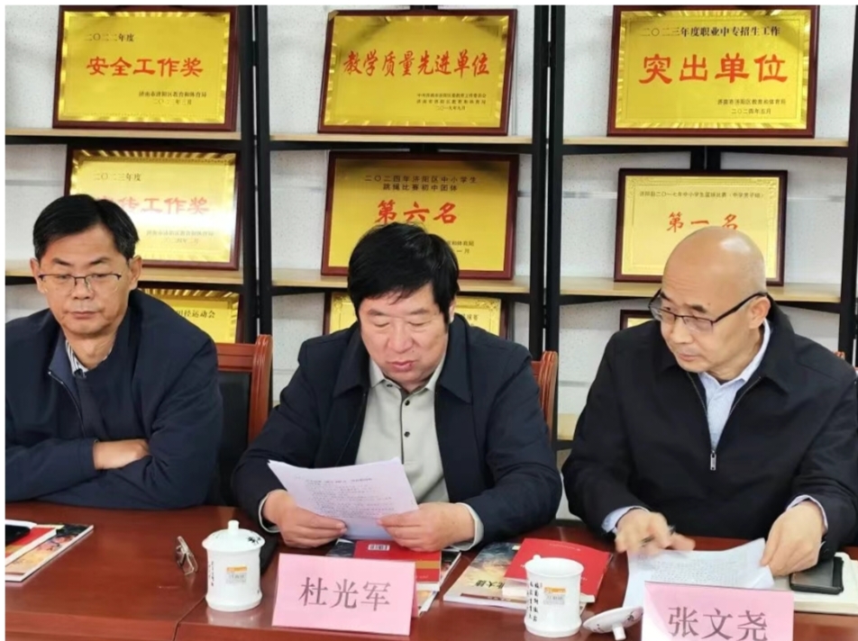 杜光军主任向区委党史研究中心及王文忠老师致以崇高敬意和衷心感谢。表示将党史编研成果纳入校园图书馆特色馆藏,对校园红色历史教育是一次强大助力。必将引导学生走进书中的“济阳故事”,让本土文化、红色基因在校园里落地生根,让广大师生树立济阳文化自信有着重要意义。杜光军对王文忠老师“退而不休、老有所为、笔耕不辍、奉献教育”的精神给予高度评价,提倡年轻教师向老教师学习。并为王文忠老师颁发镌刻有“笔墨传承文化、奉献滋养教育”字样的荣誉证书。